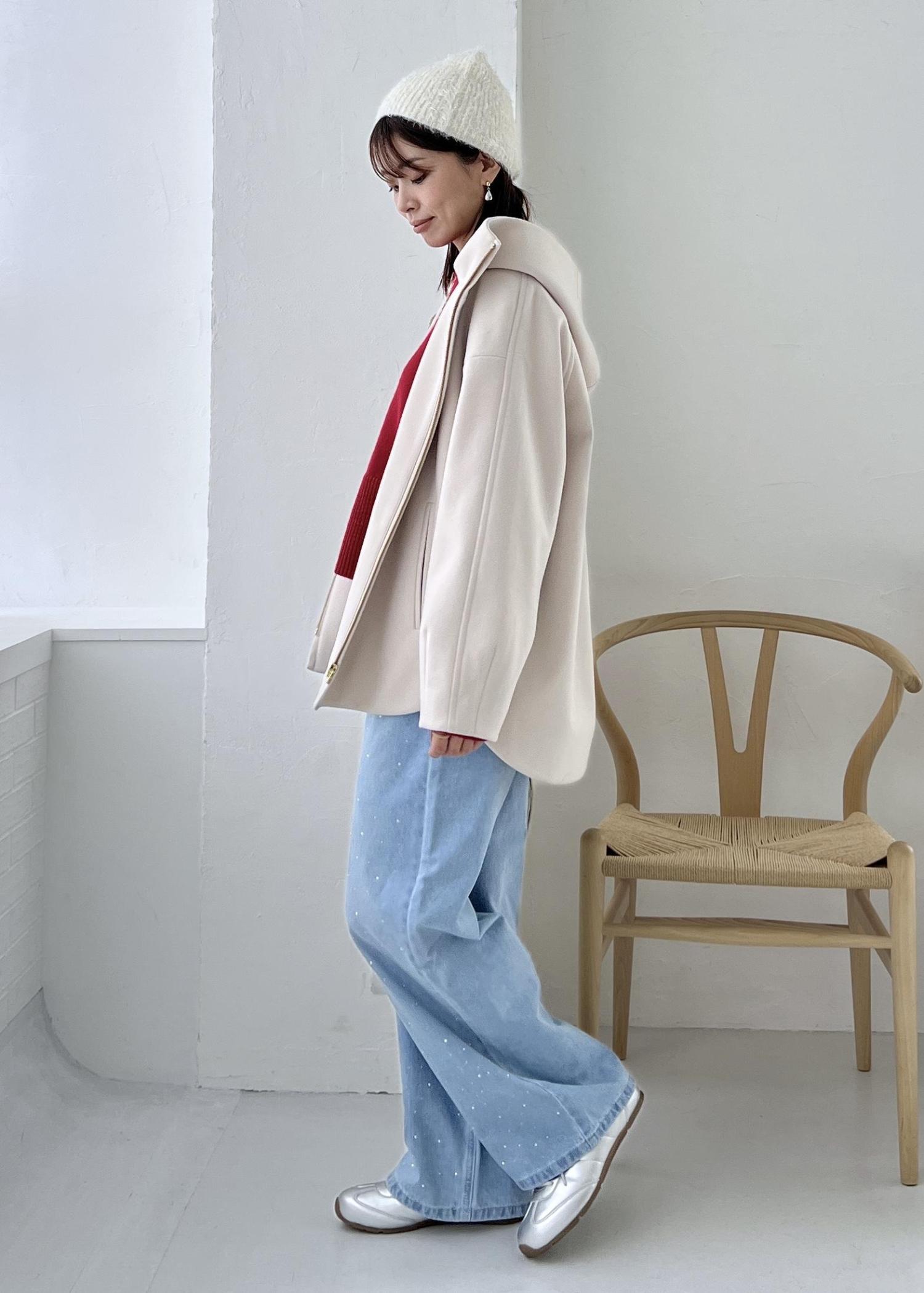 人気のフードデザインのアウターは、柔らかく軽いジャージメルトン生地。