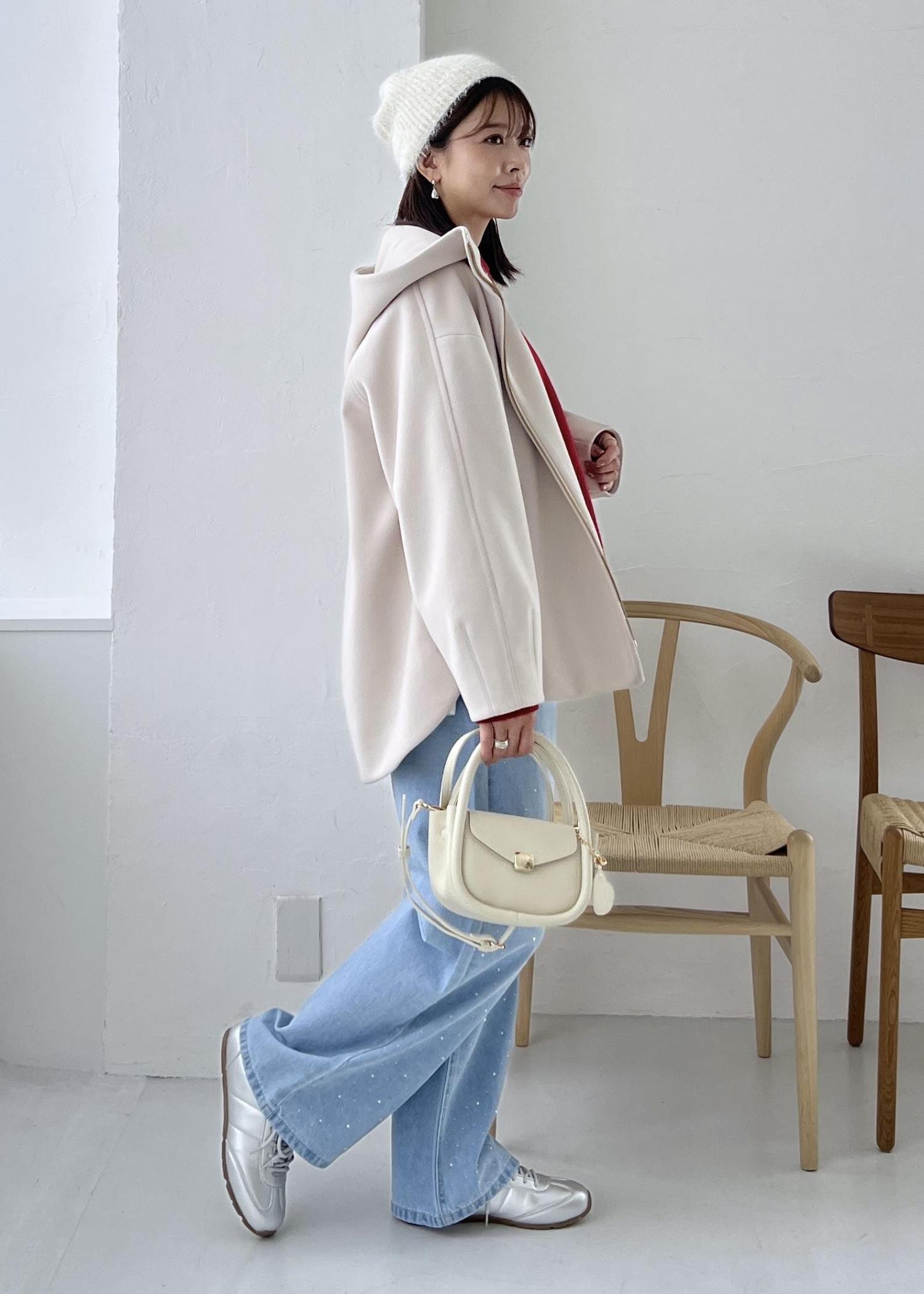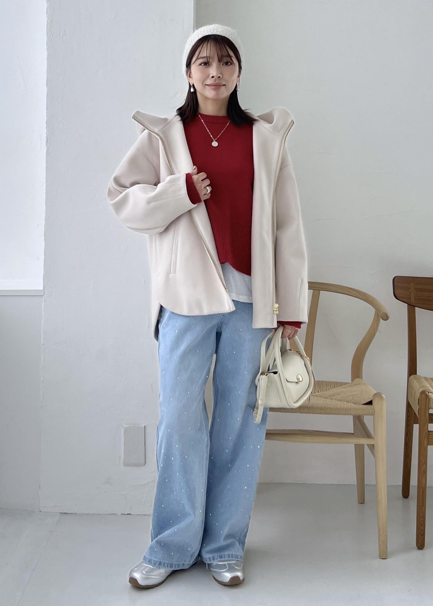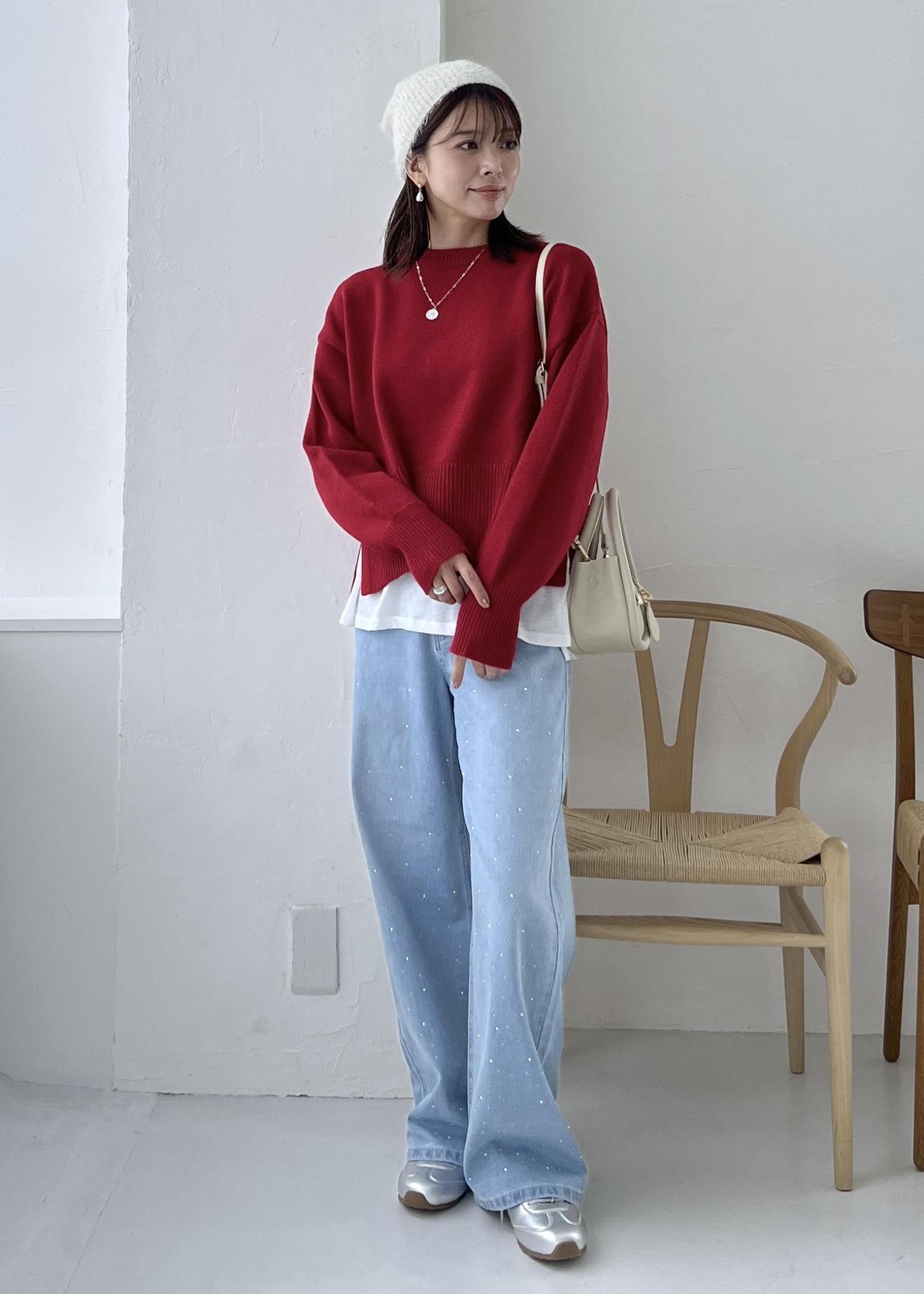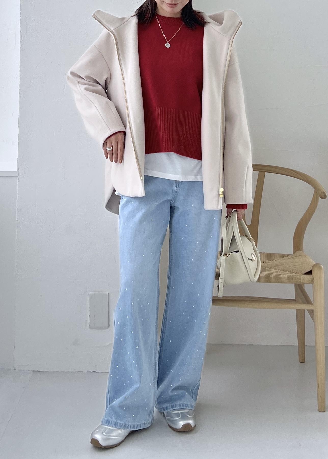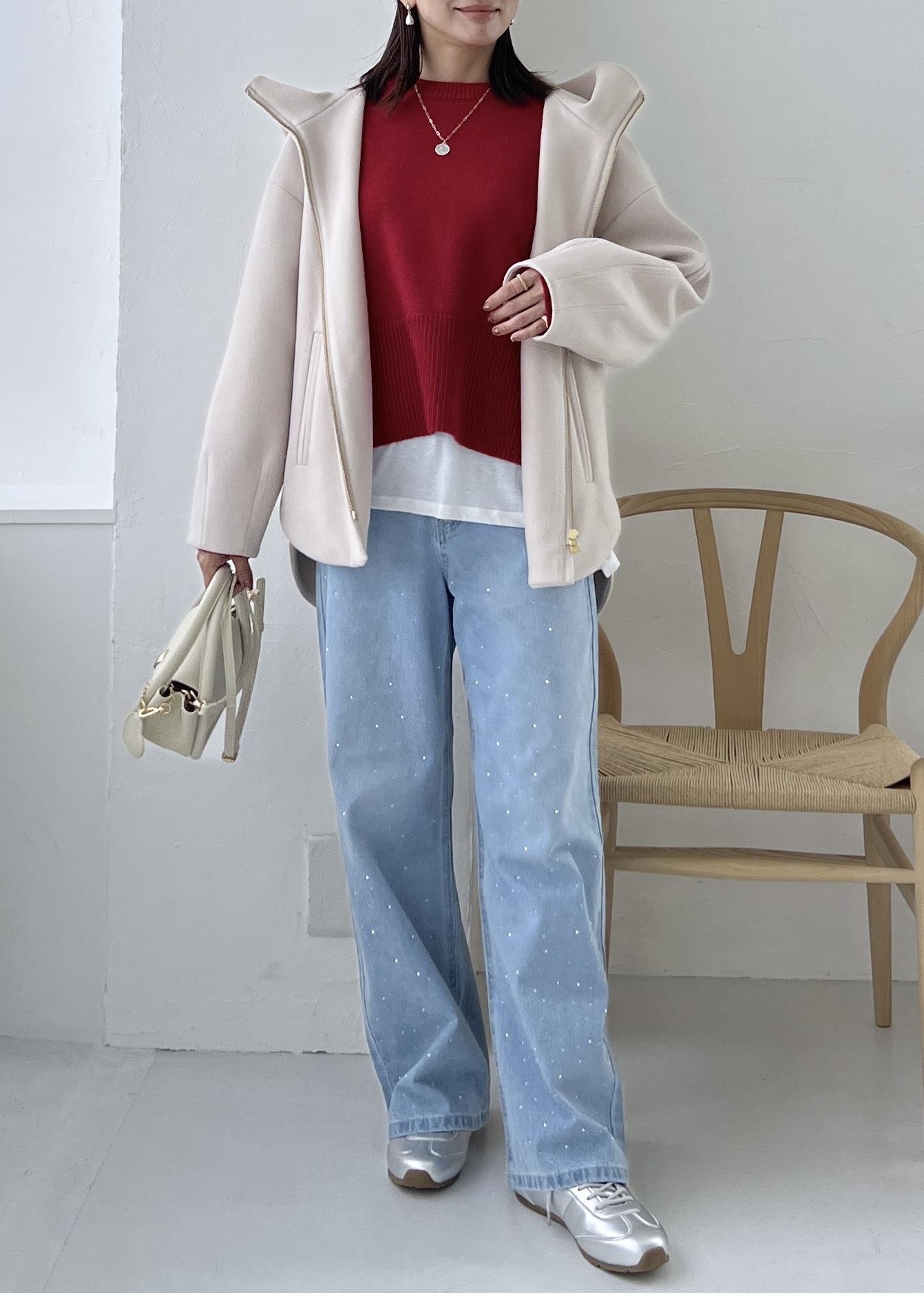 クリスマスや年末年始のお出かけに着たい赤のニットを差し色にして、デニムで楽ちんなお出かけスタイルにしました。