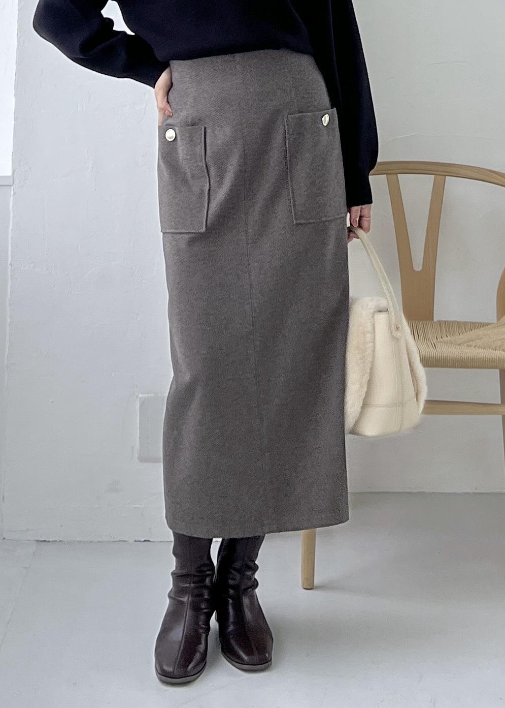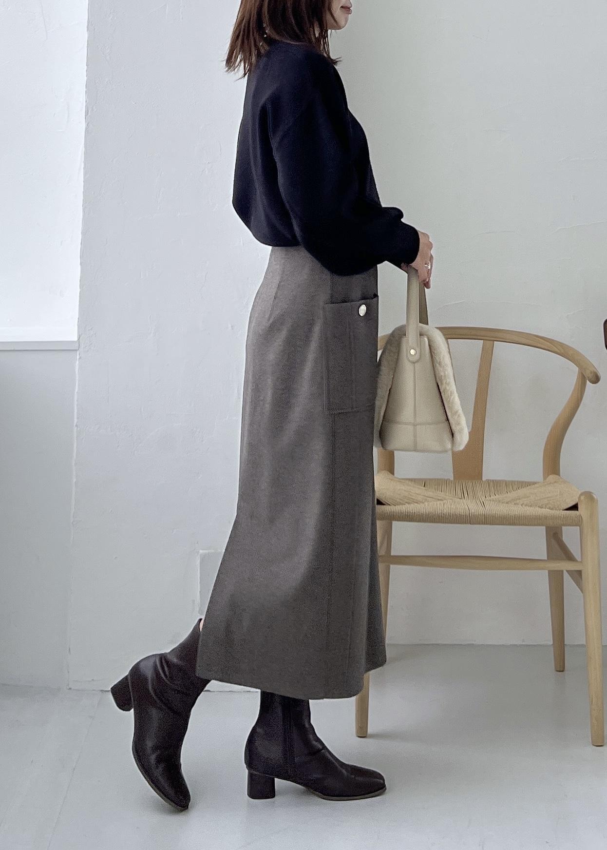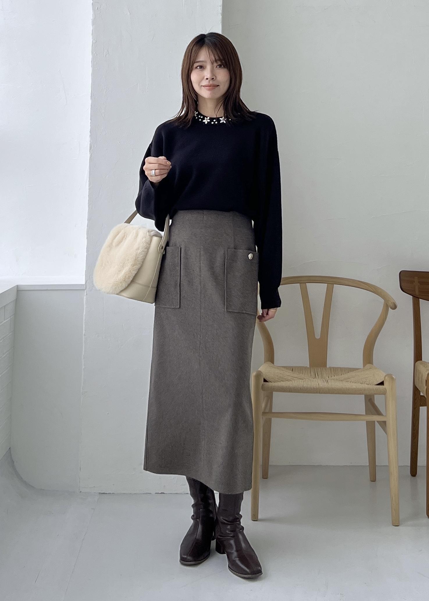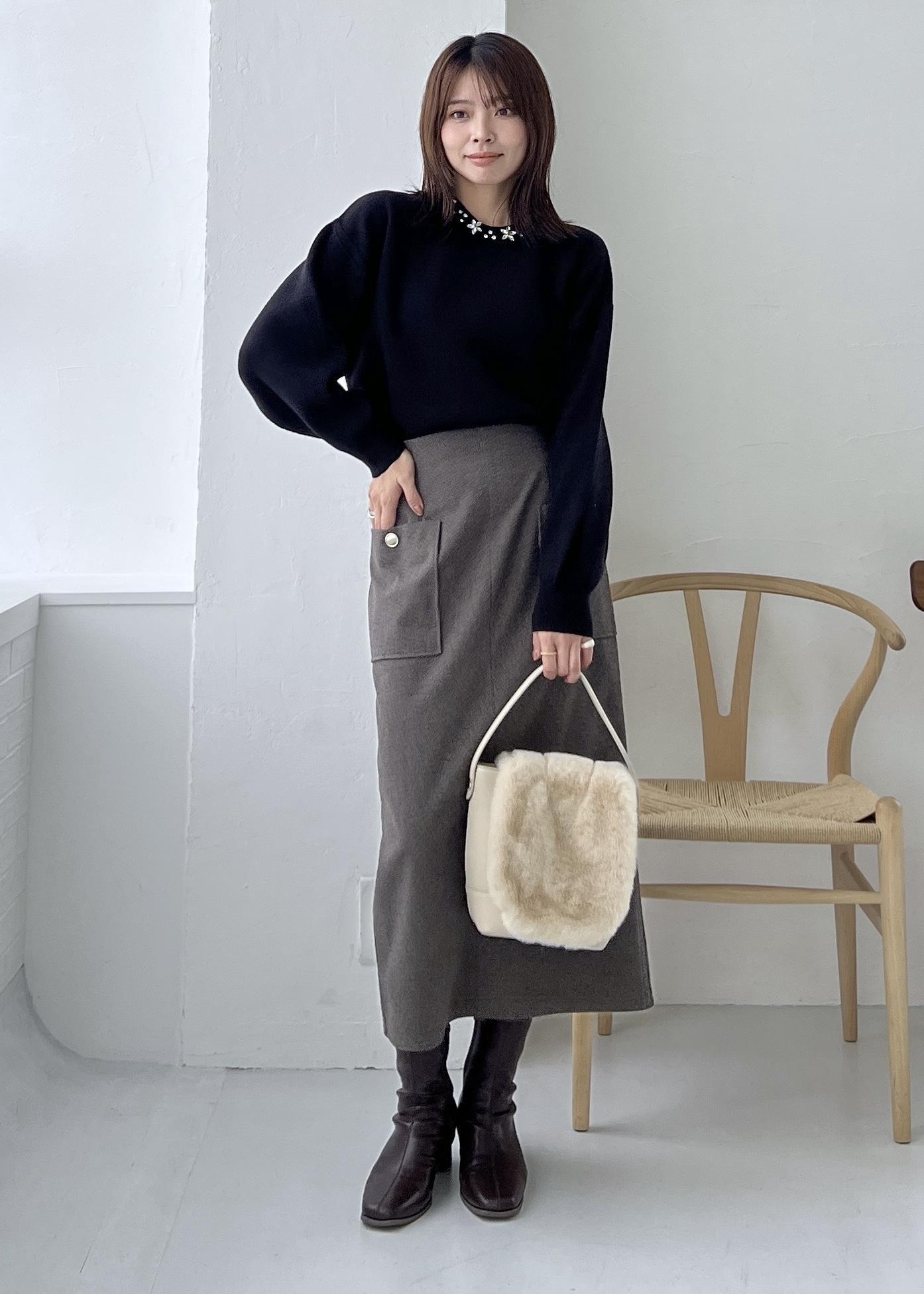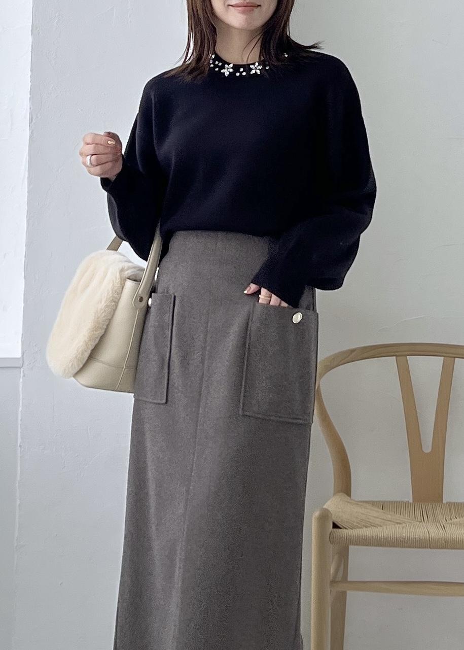 衿元のビジューがポイントのニットは、アイラインスカートを合わせて大人カジュアルコーデに。