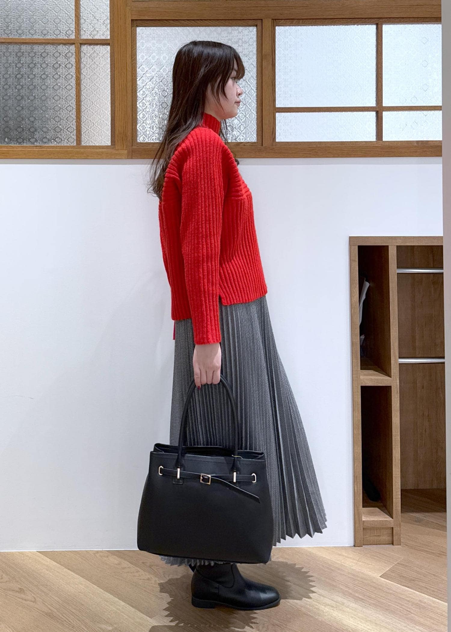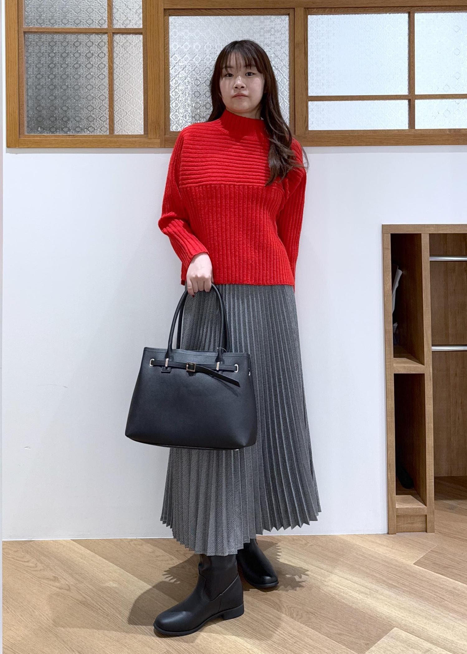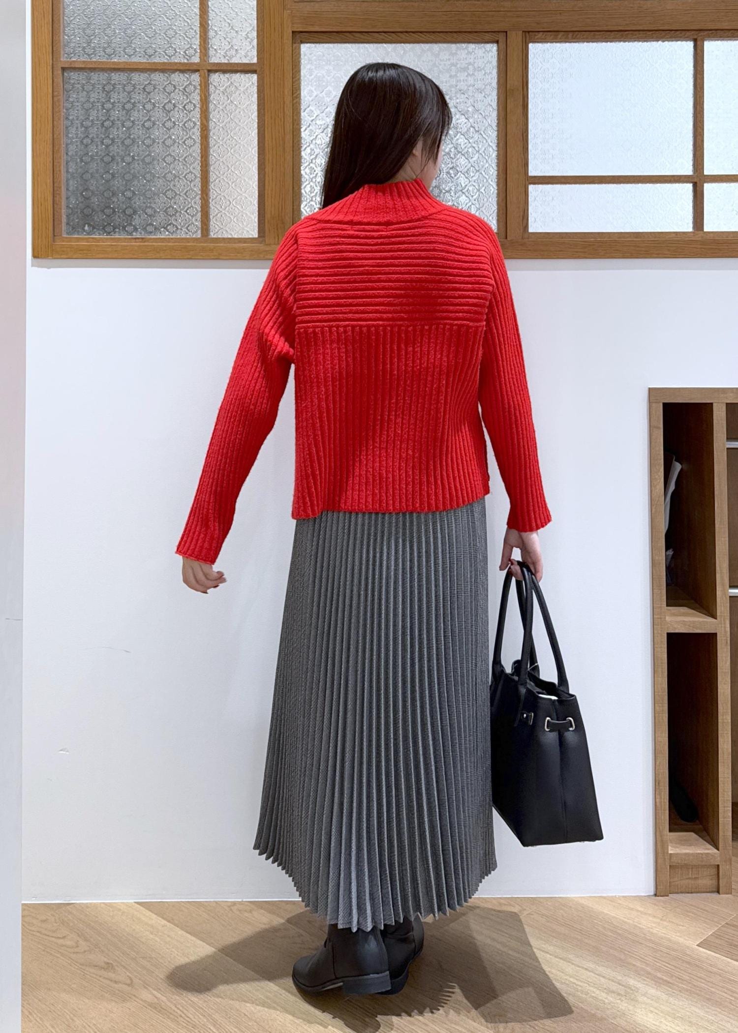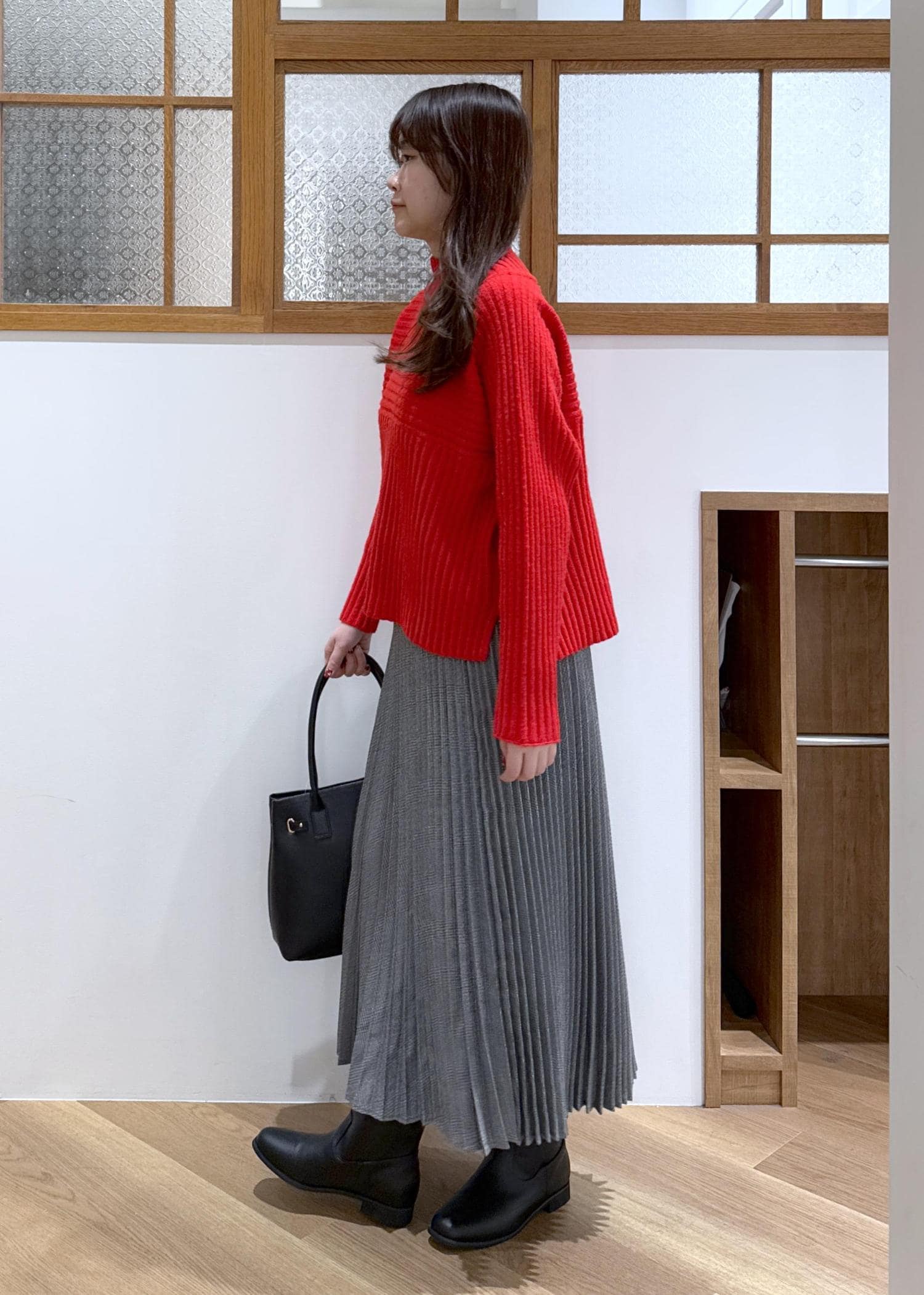 やや高めの首元の赤ニットに、プリーツのロングスカートを合わせた大人らしい、クリスマス意識のコーディネートです。