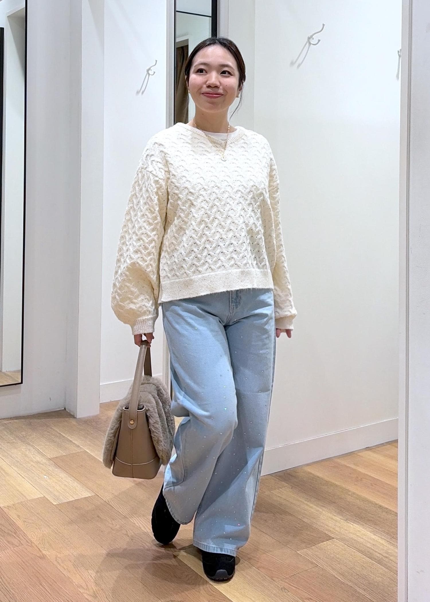 そこまで肉厚な生地ではなくサラッと着やすいニットでインナーでシャツを着込んだりアウターを着た際も着膨れがしにくいです。 -