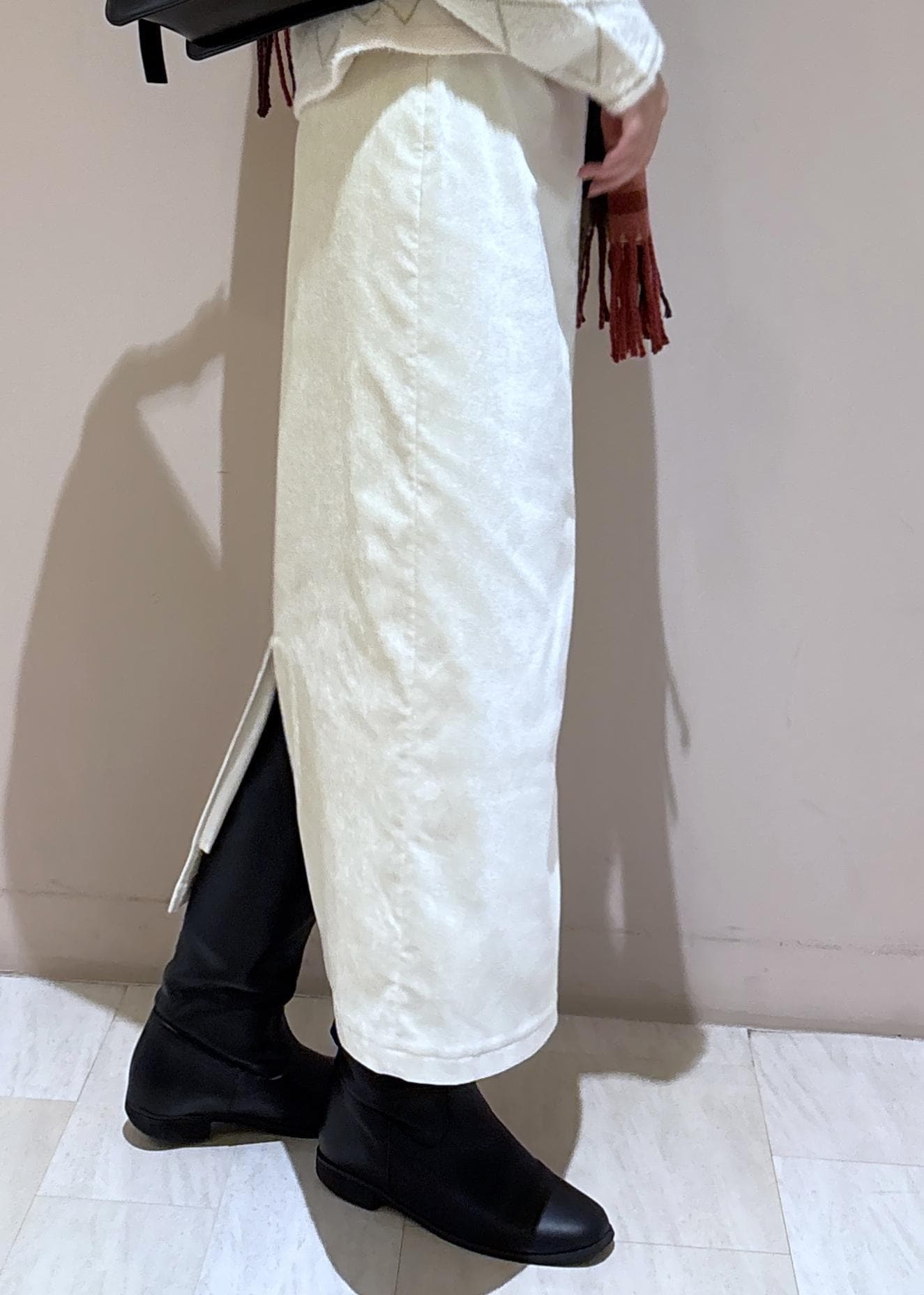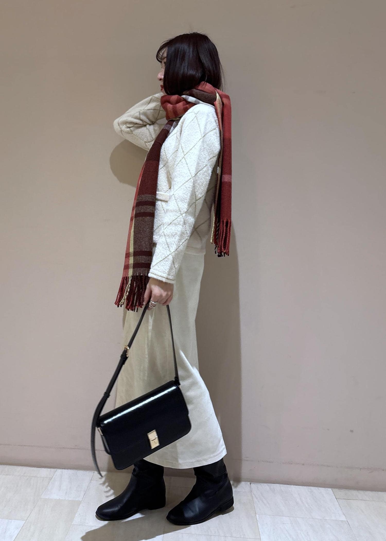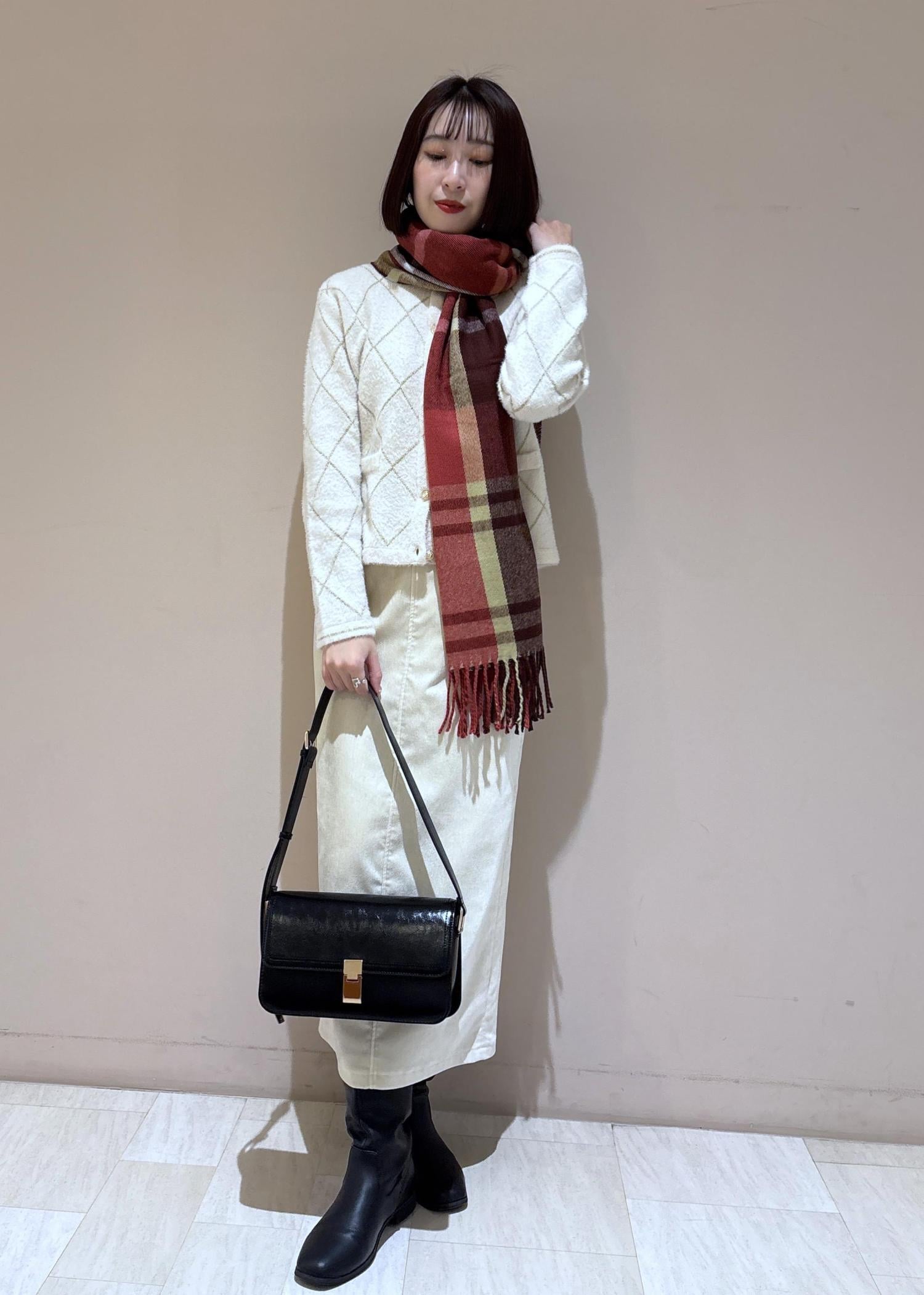 暖かそうなアイラインスカートに同系色のカーディガンを合わせて女っぽ大人女子コーデにまとめました。