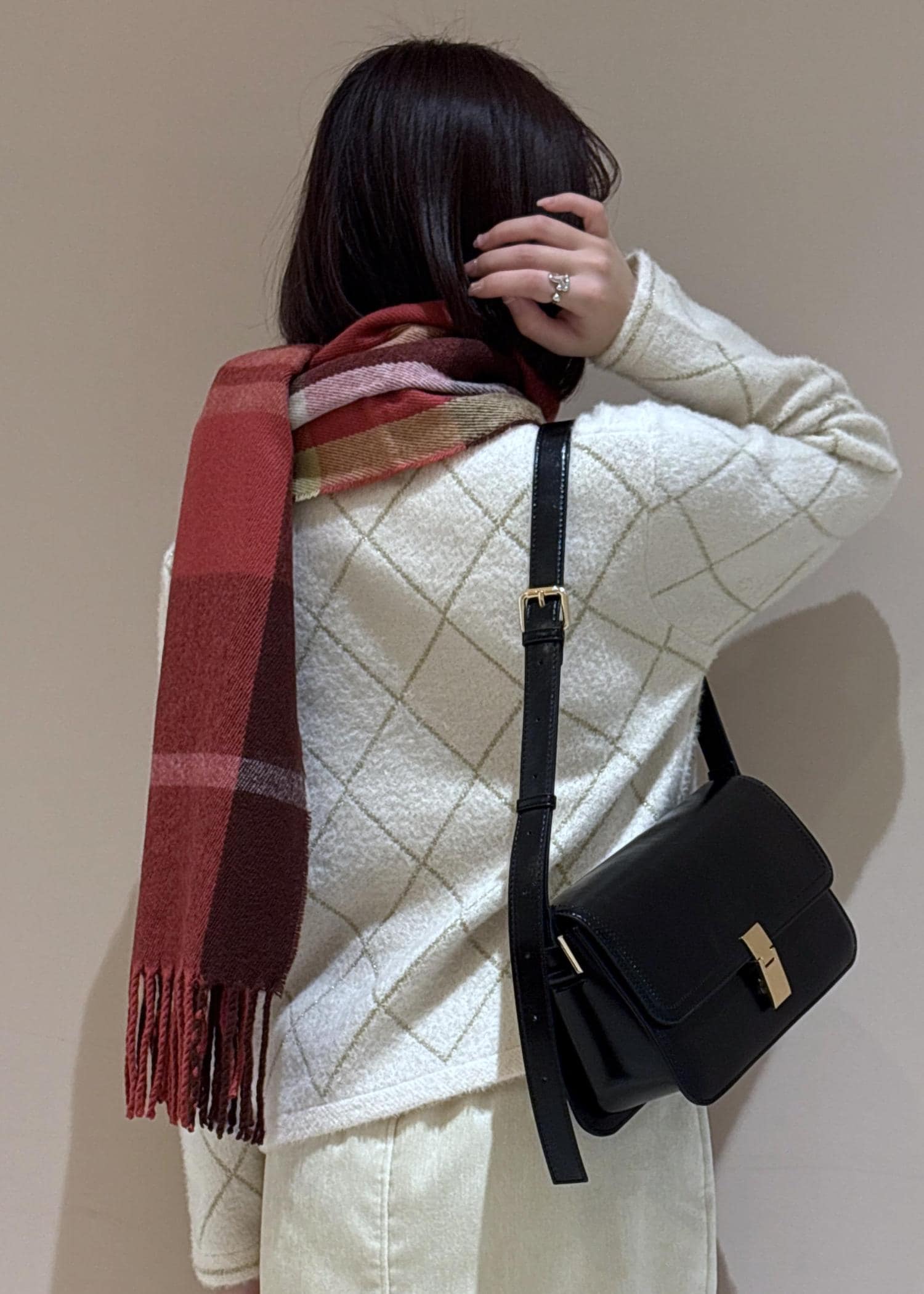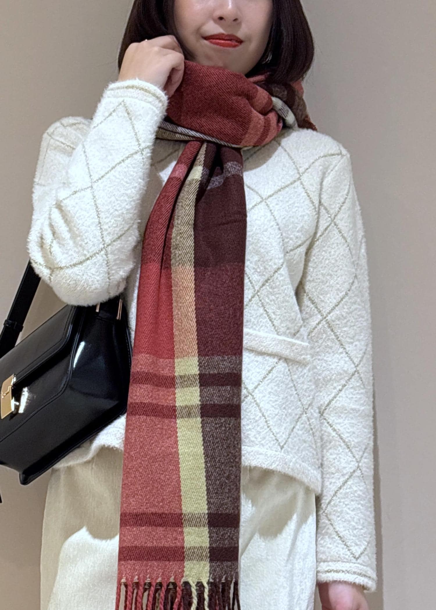 写真映えもしそうなレッドのチェック柄マフラーを巻いて寒さ対策も!
