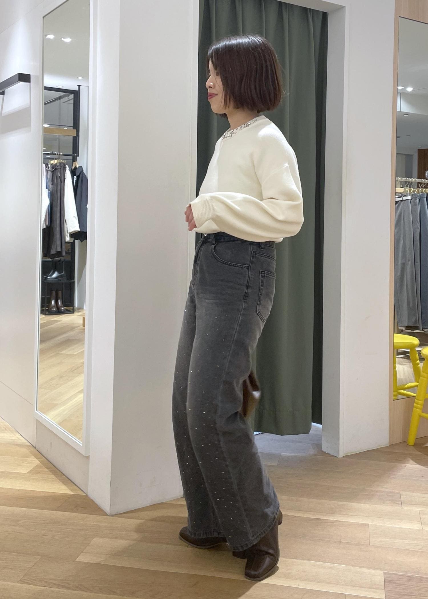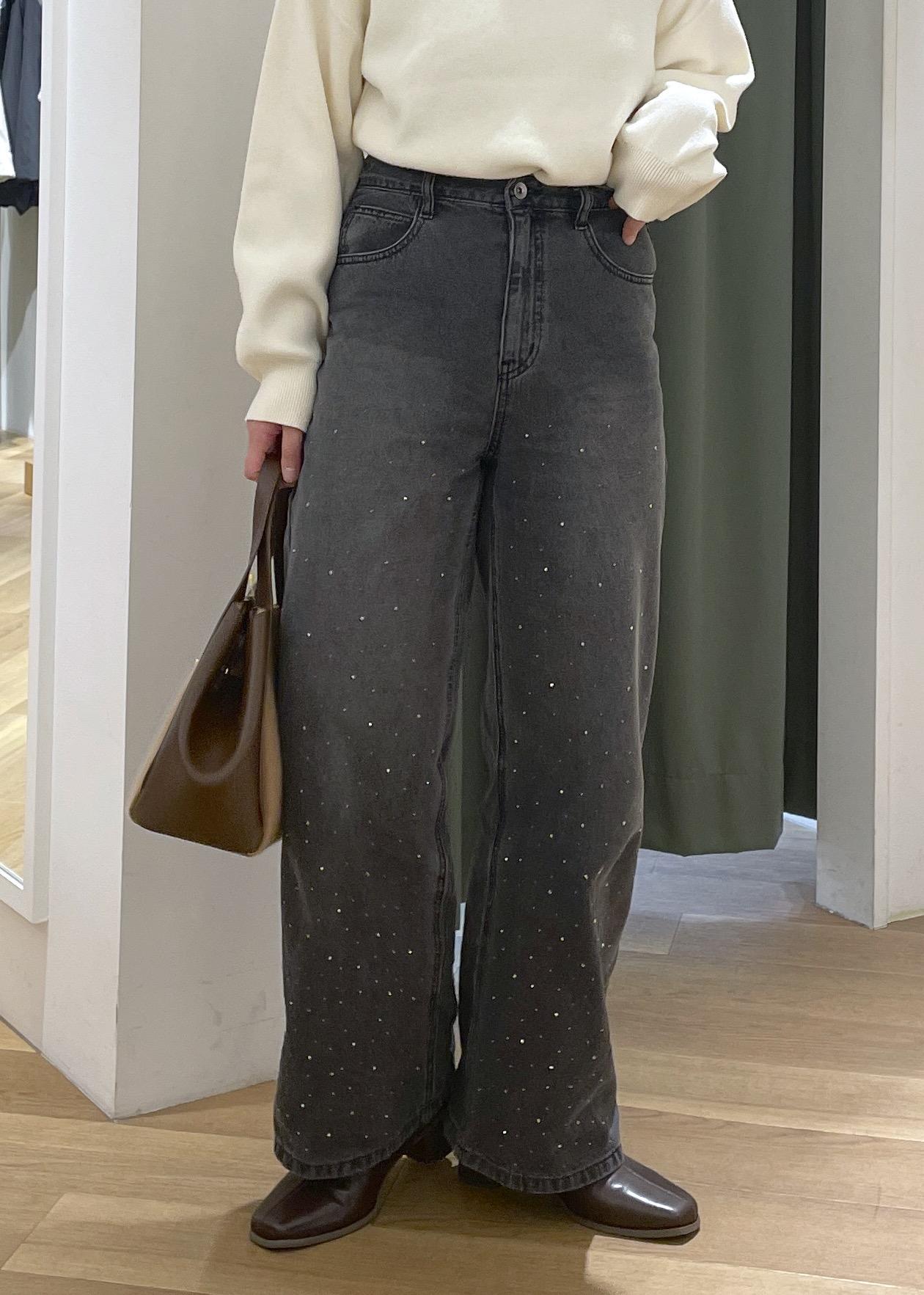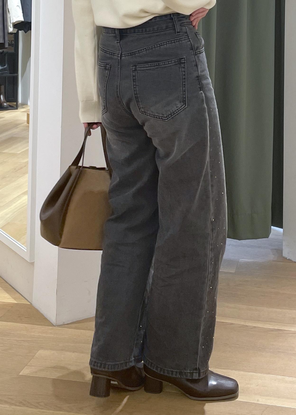 ROPÉ PICNIC【新色追加】キラキラビジューデニムブラック系 / 38¥7,491レビュービジュー使いがいつものデニムスタイルをアップデートしてくれる、主役になるデニムです。細かなビジューなので、そこまで派手過ぎずコーディネートにも取り入れやすいです。シルエットは脚のラインを拾わないワイドシルエットです。ウエストはトップスインできるゆとりがあり、腰回りはジャストなサイズ感でした。着丈は足首が隠れる長さです。
