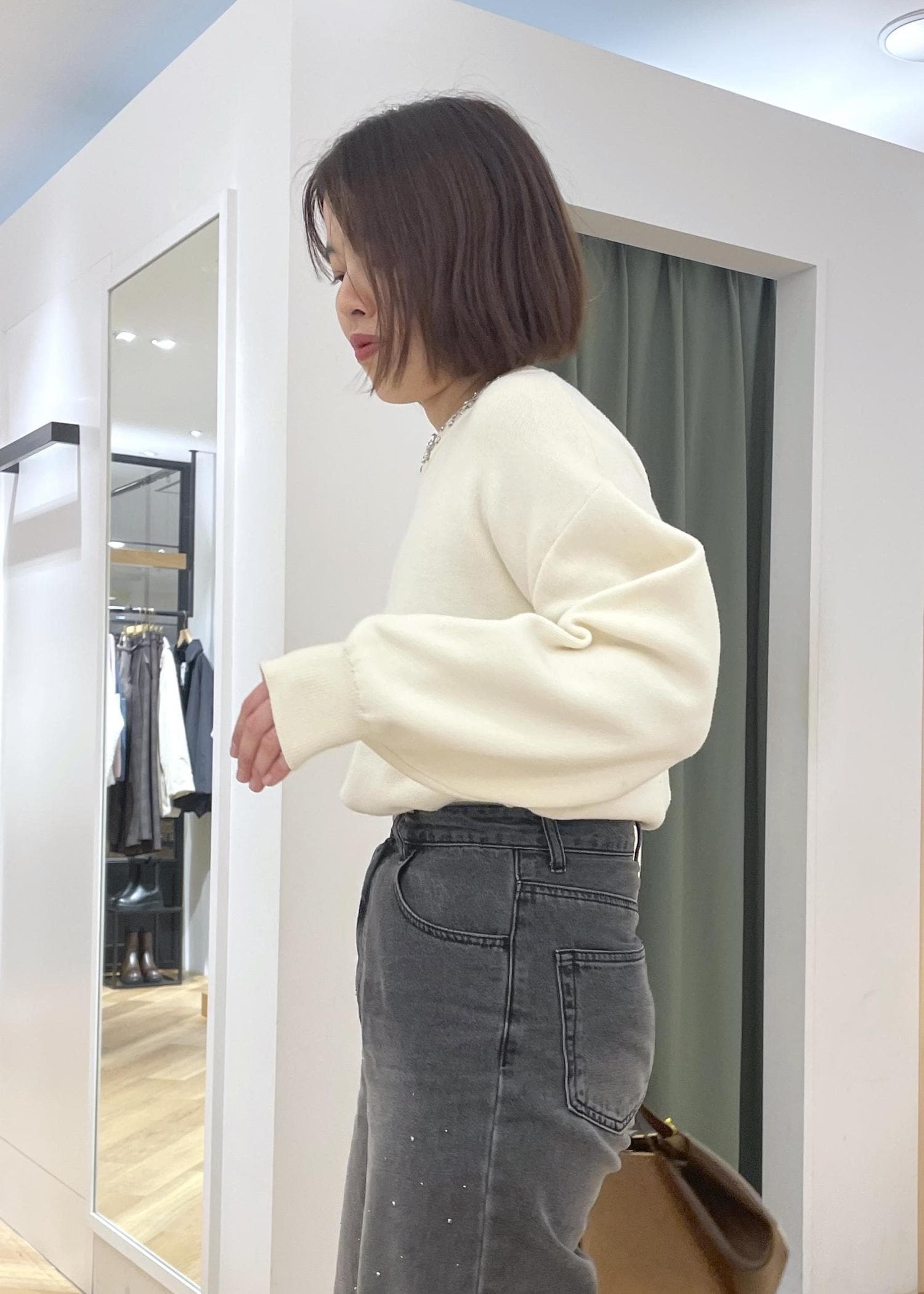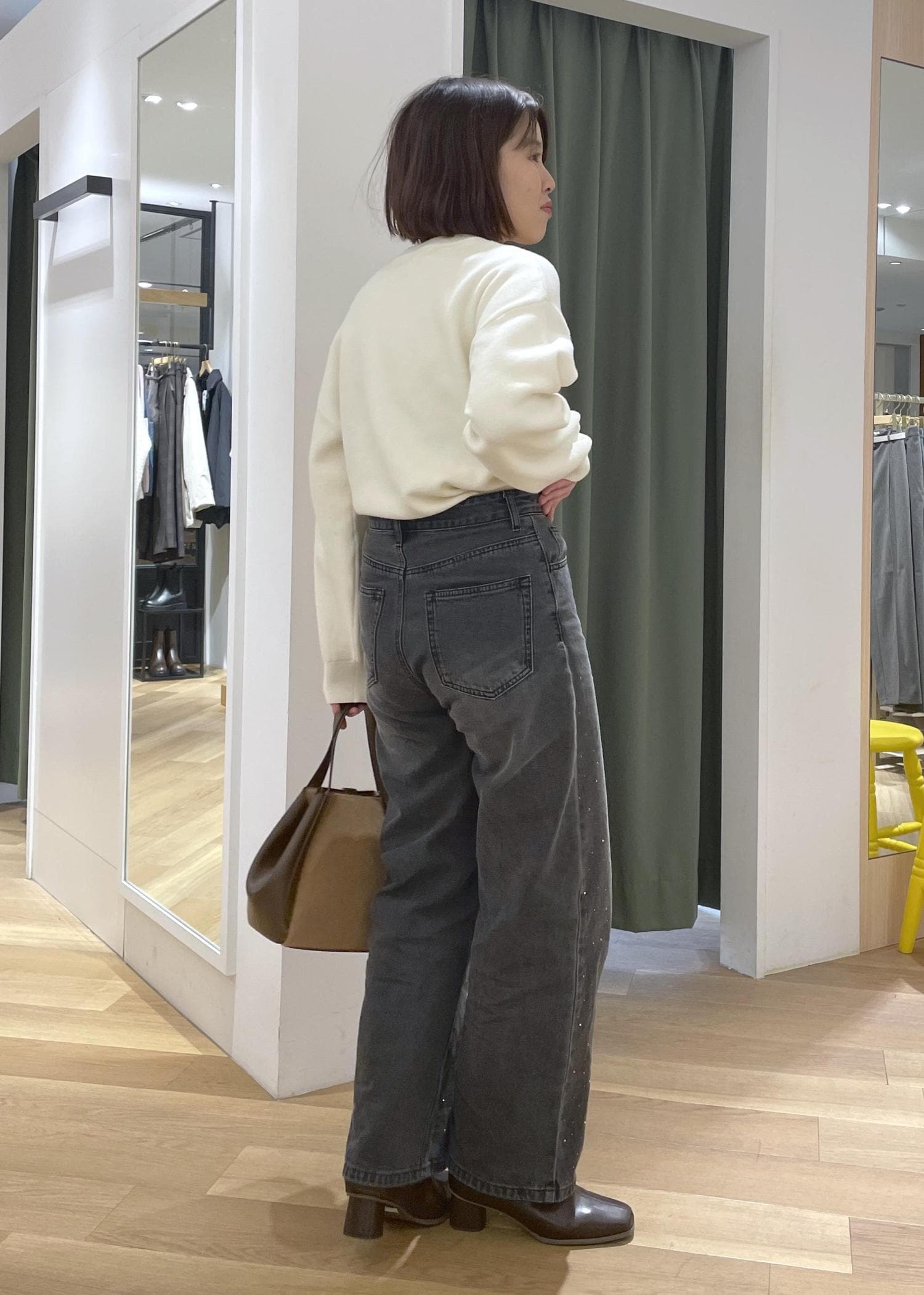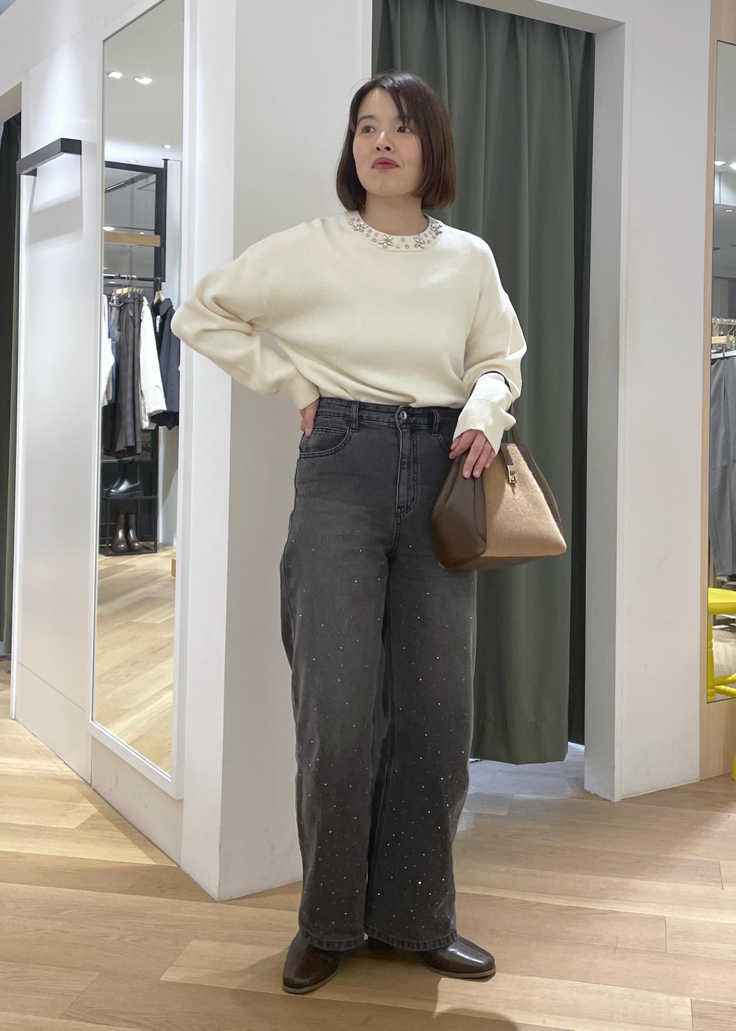 ビジューデニムに白ニットを合わせたきれいめカジュアルコーデです!