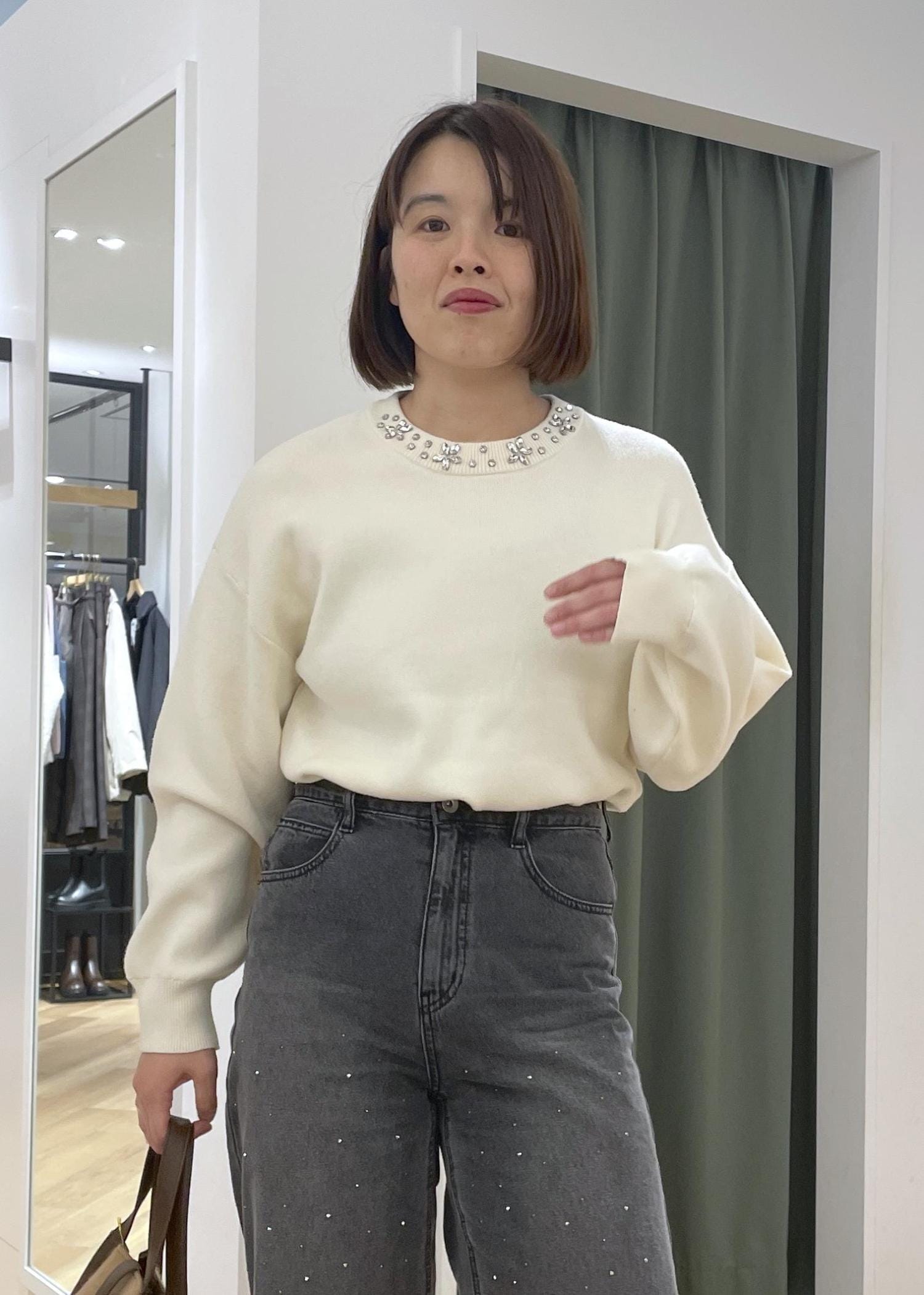 白ニットの襟元にもビジューが施してあるためさり気なく華やかさも演出できるコーデです!