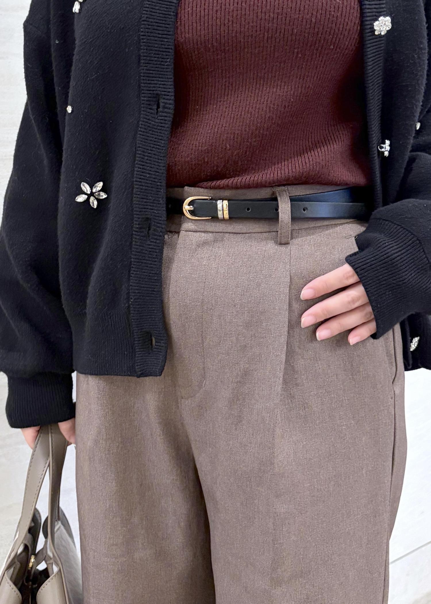 綺麗めスタイルには中央のベルトするとコンパクトなシルエットになり華奢見えします。