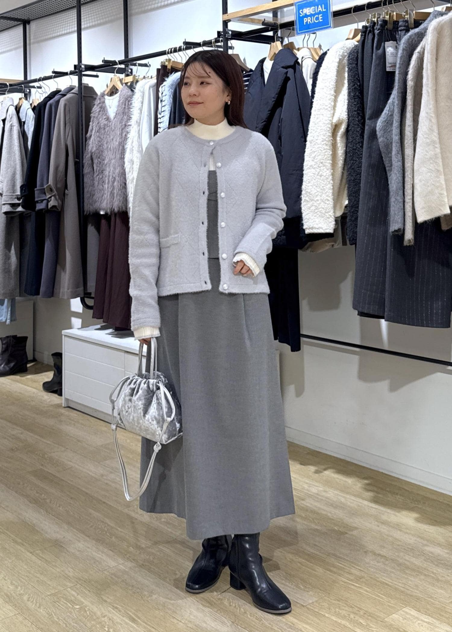 ふわふわ素材のカーディガンを合わせて冬のきれいめワンピースコーデに!