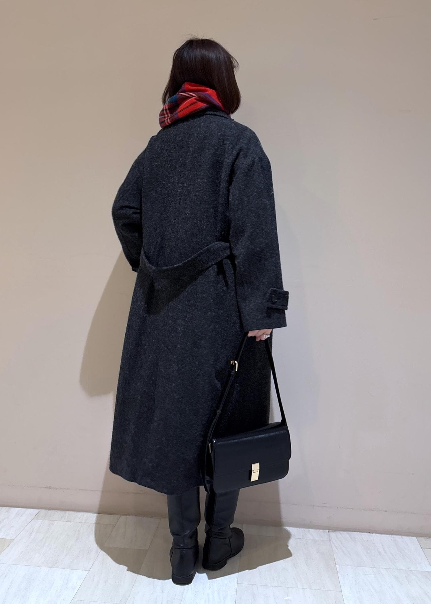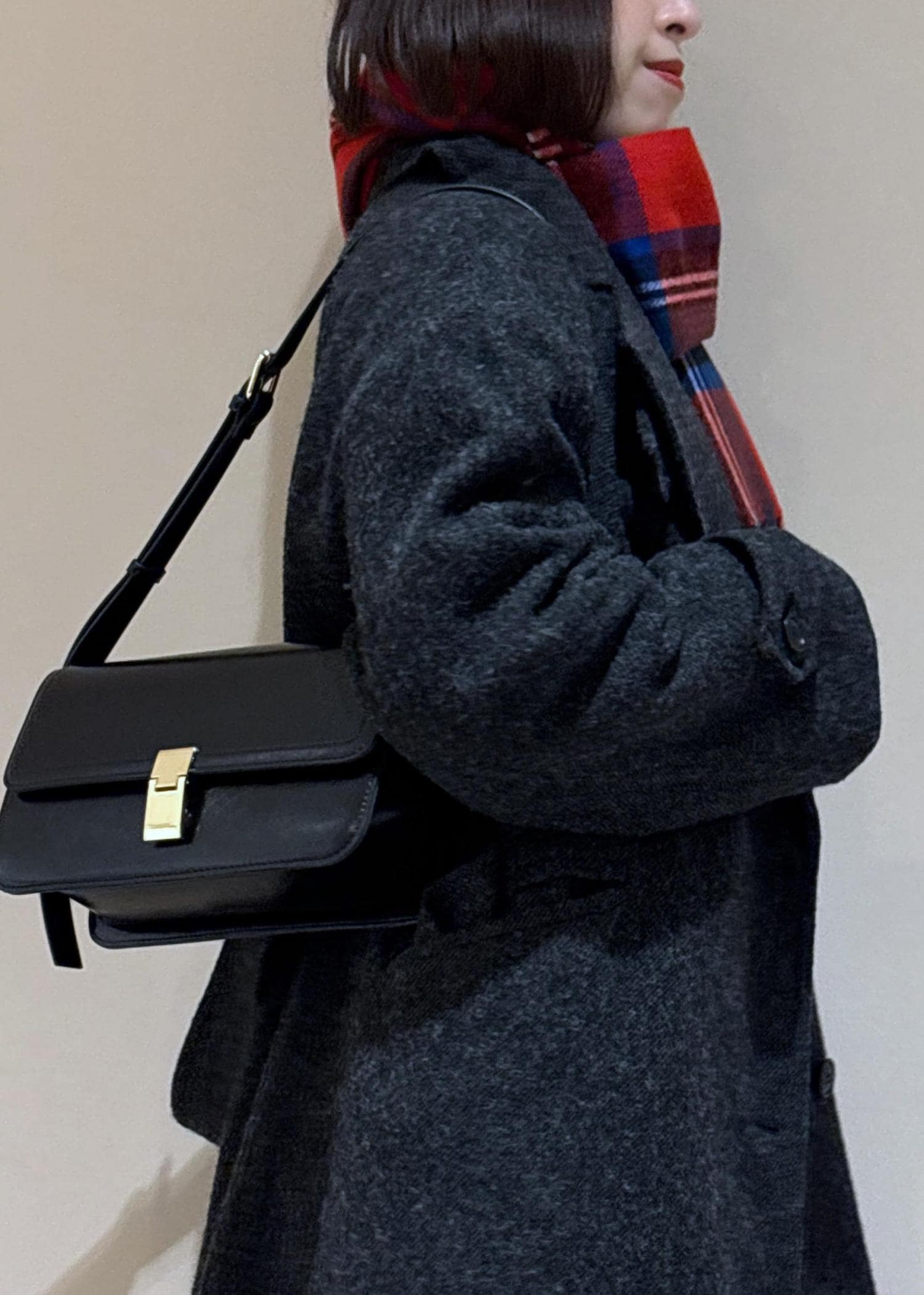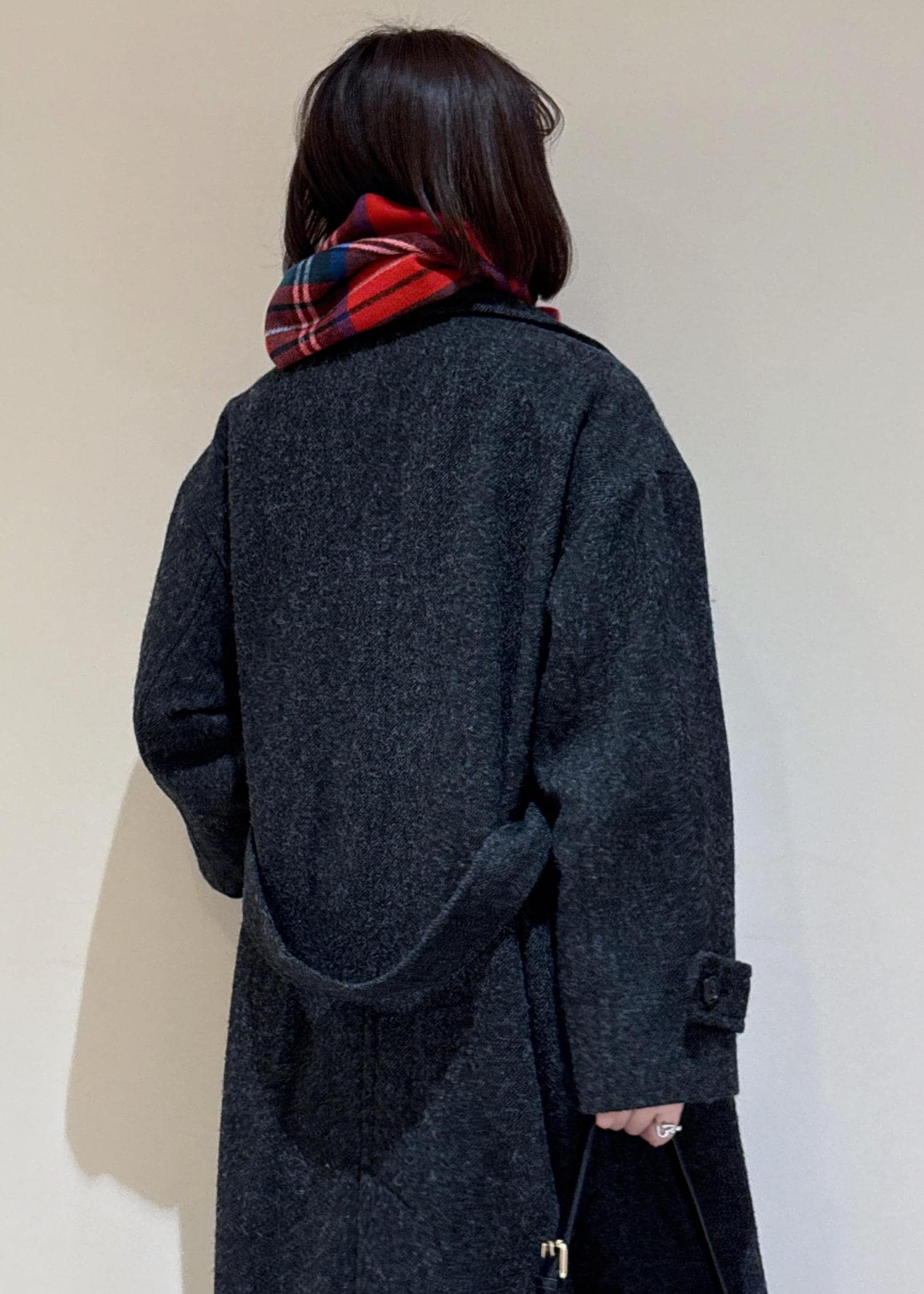クラシックなチェック柄なので、巻いても肩掛けや手持ちでも映えるマフラーです。 -