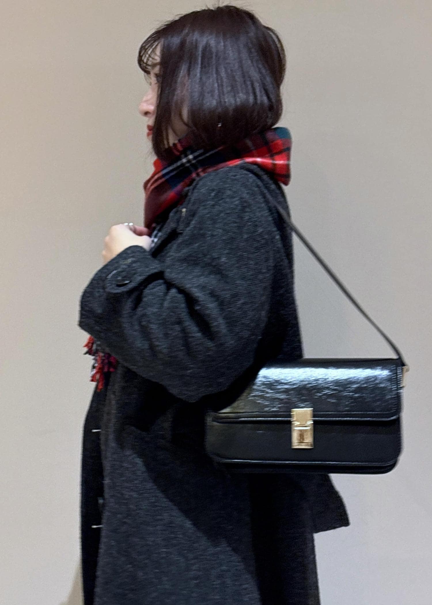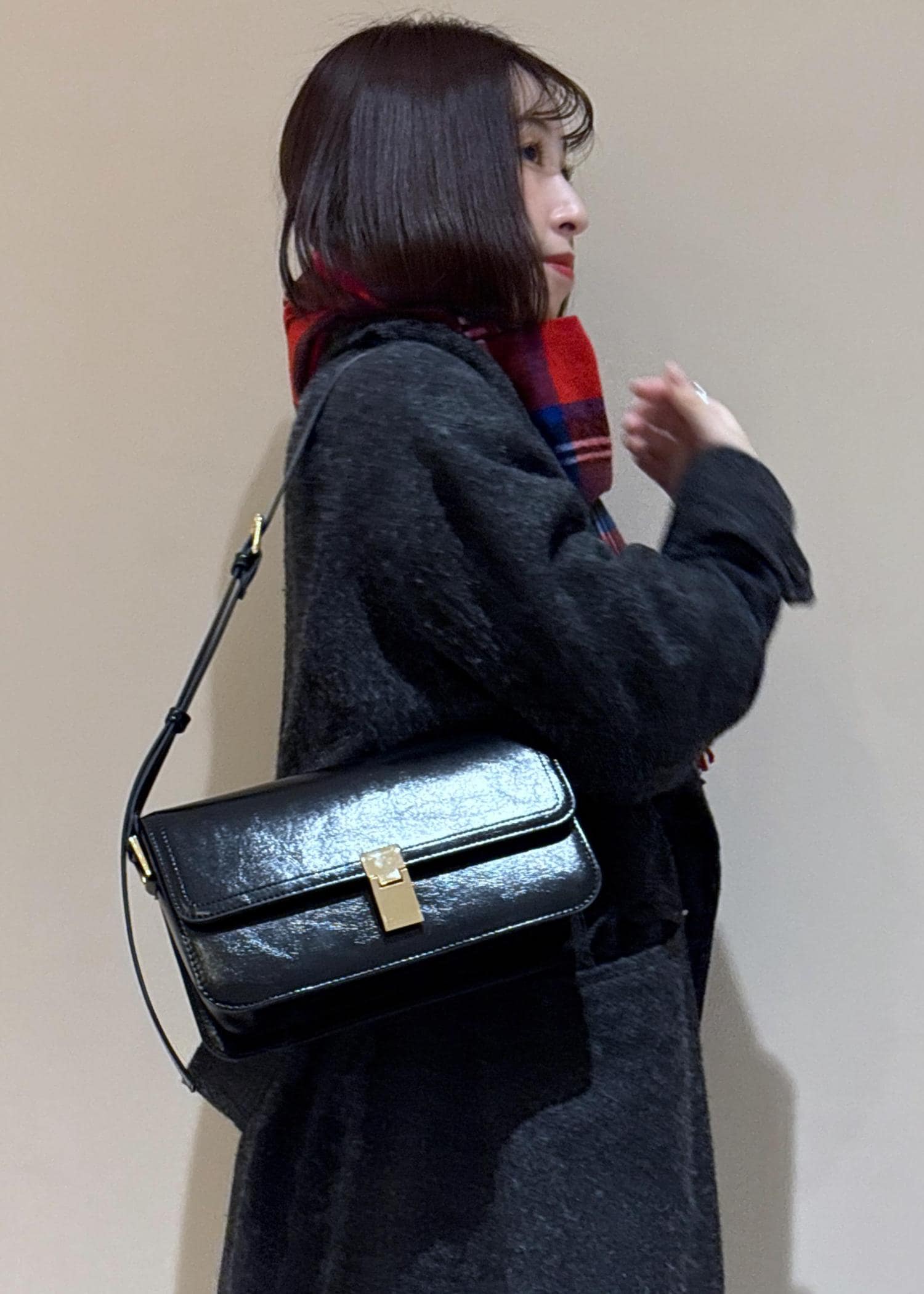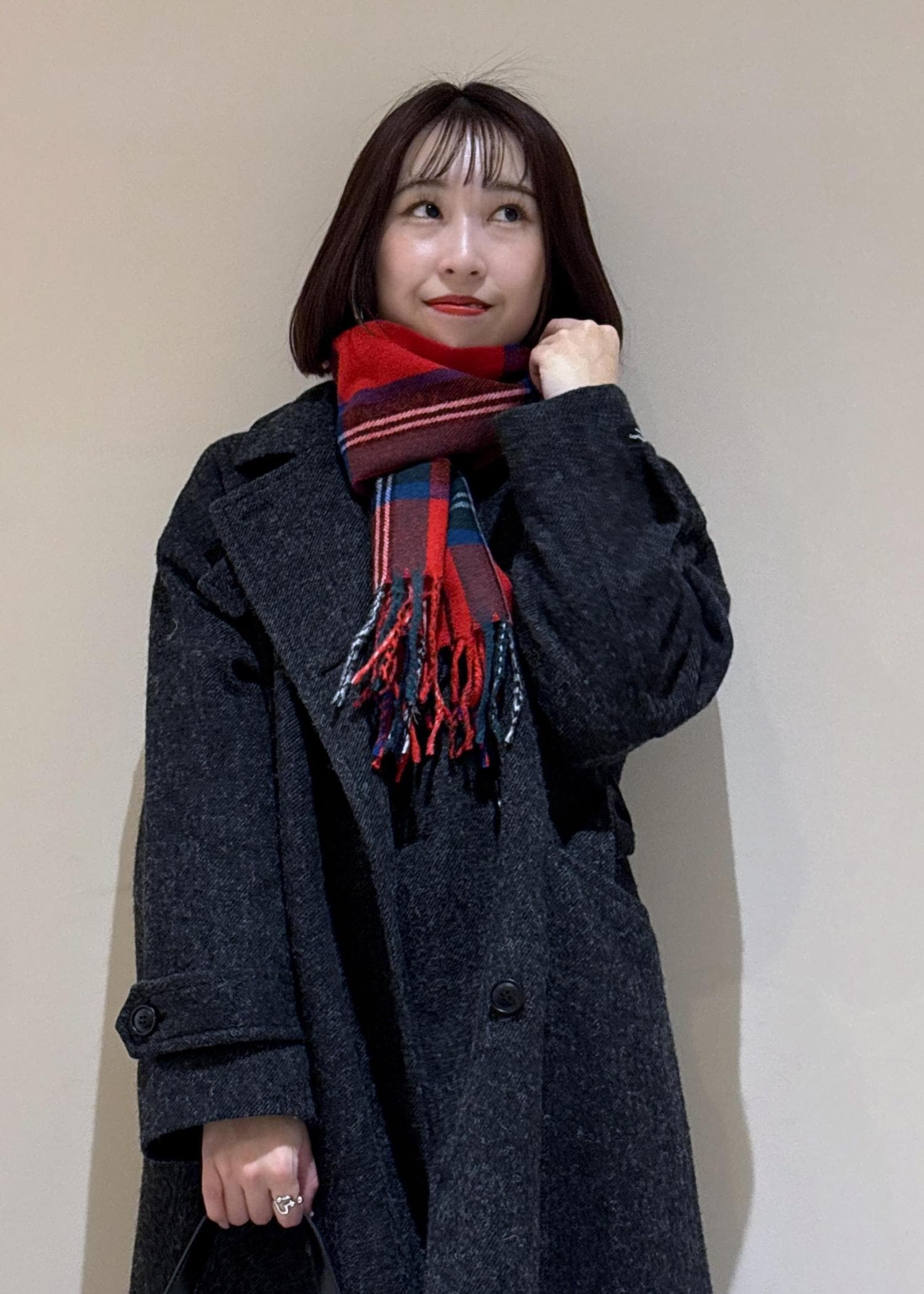 クラシックなチェック柄なので、巻いても肩掛けや手持ちでも映えるマフラーです。 -