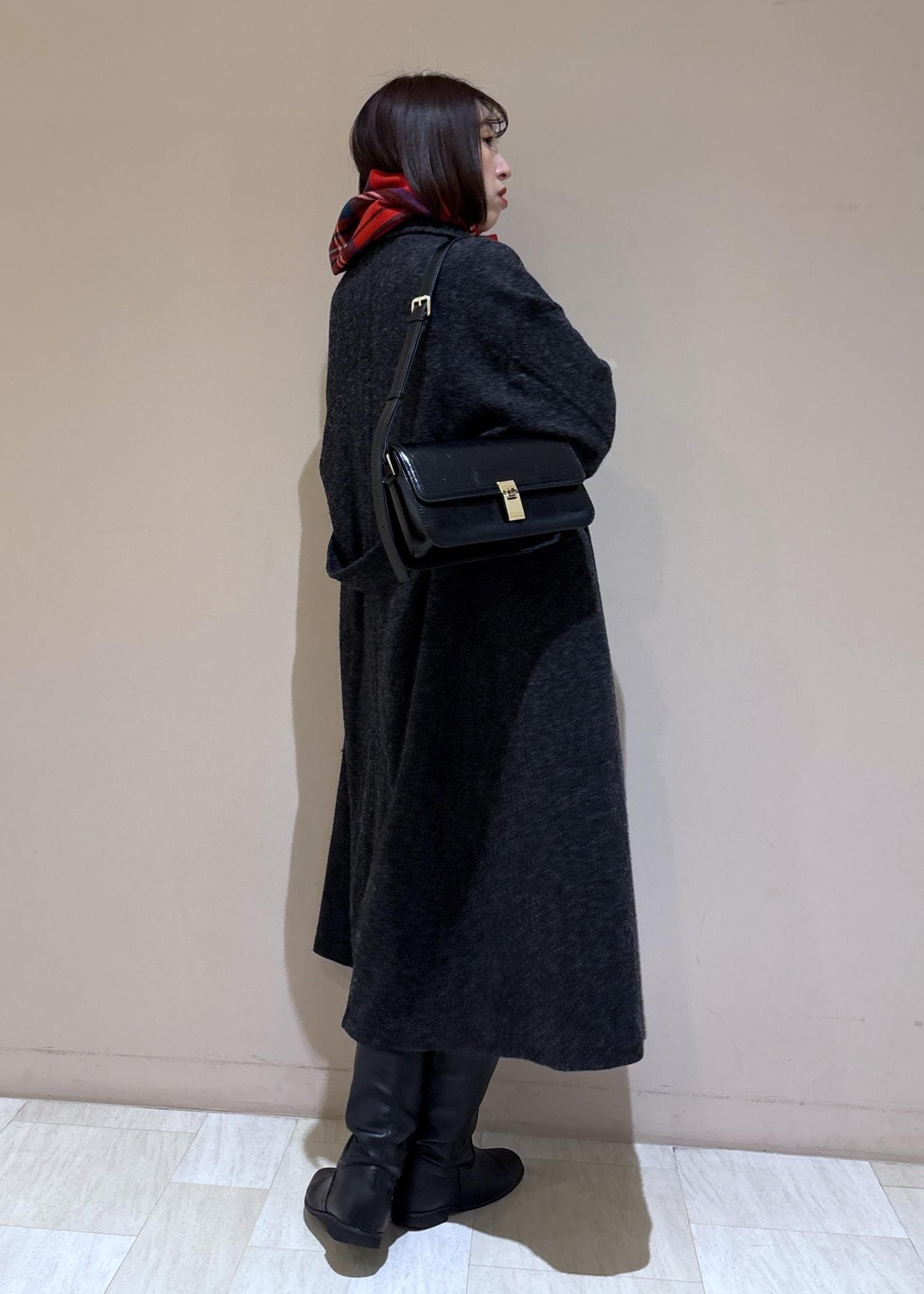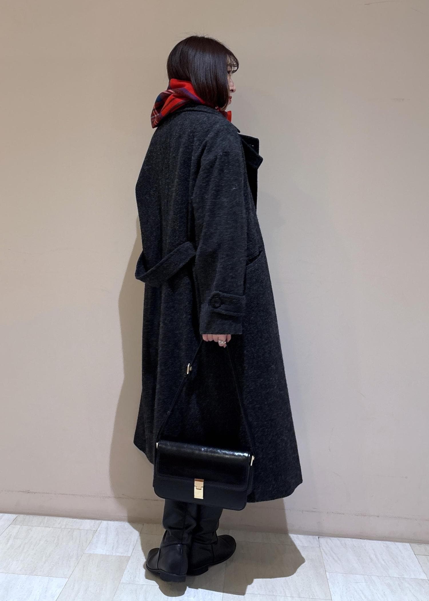 毎年人気のジャパンファブリックのロングコートはブラックにして、スカートと小物も同系色でまとめて女っぽ大人女子コーデに。