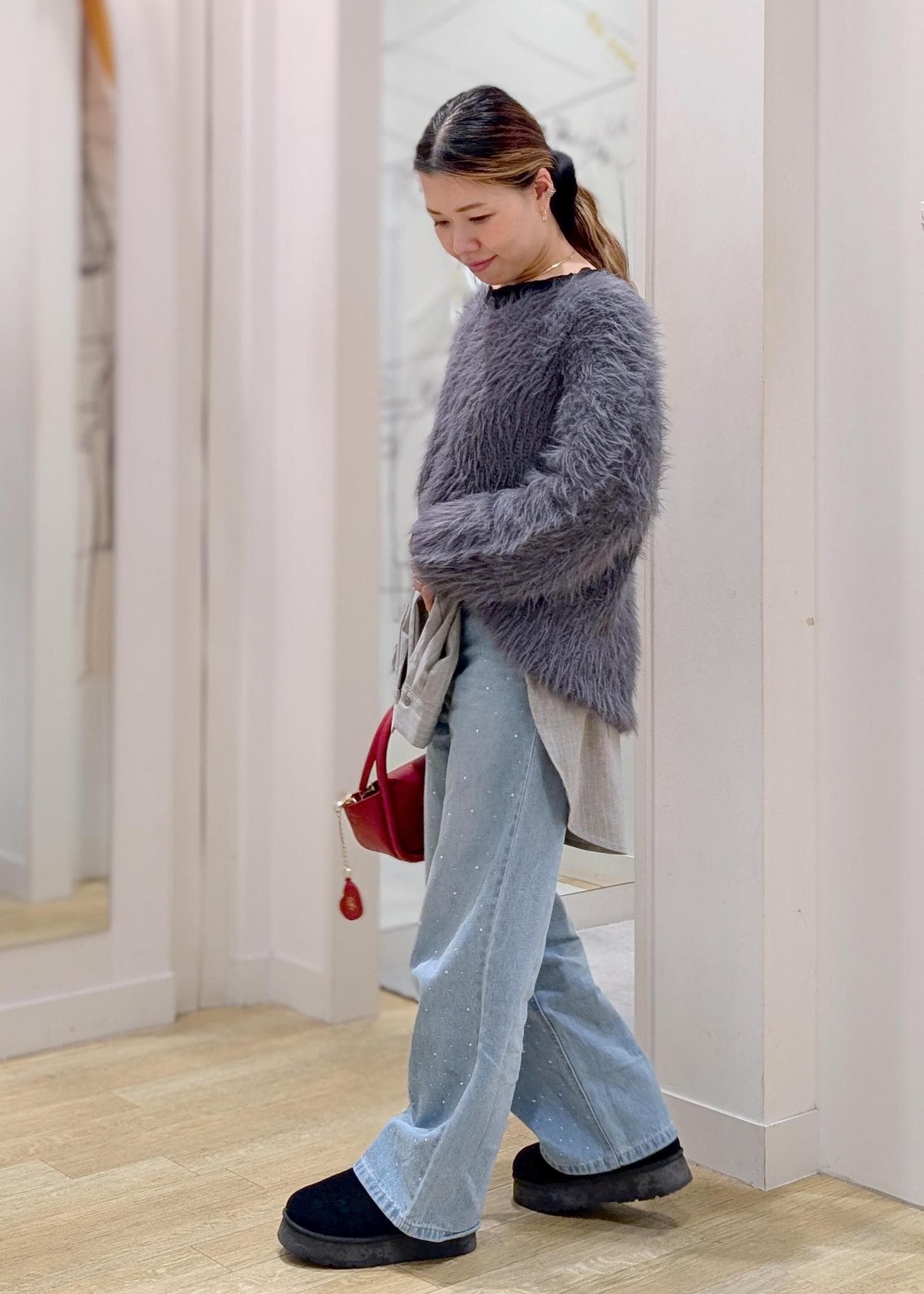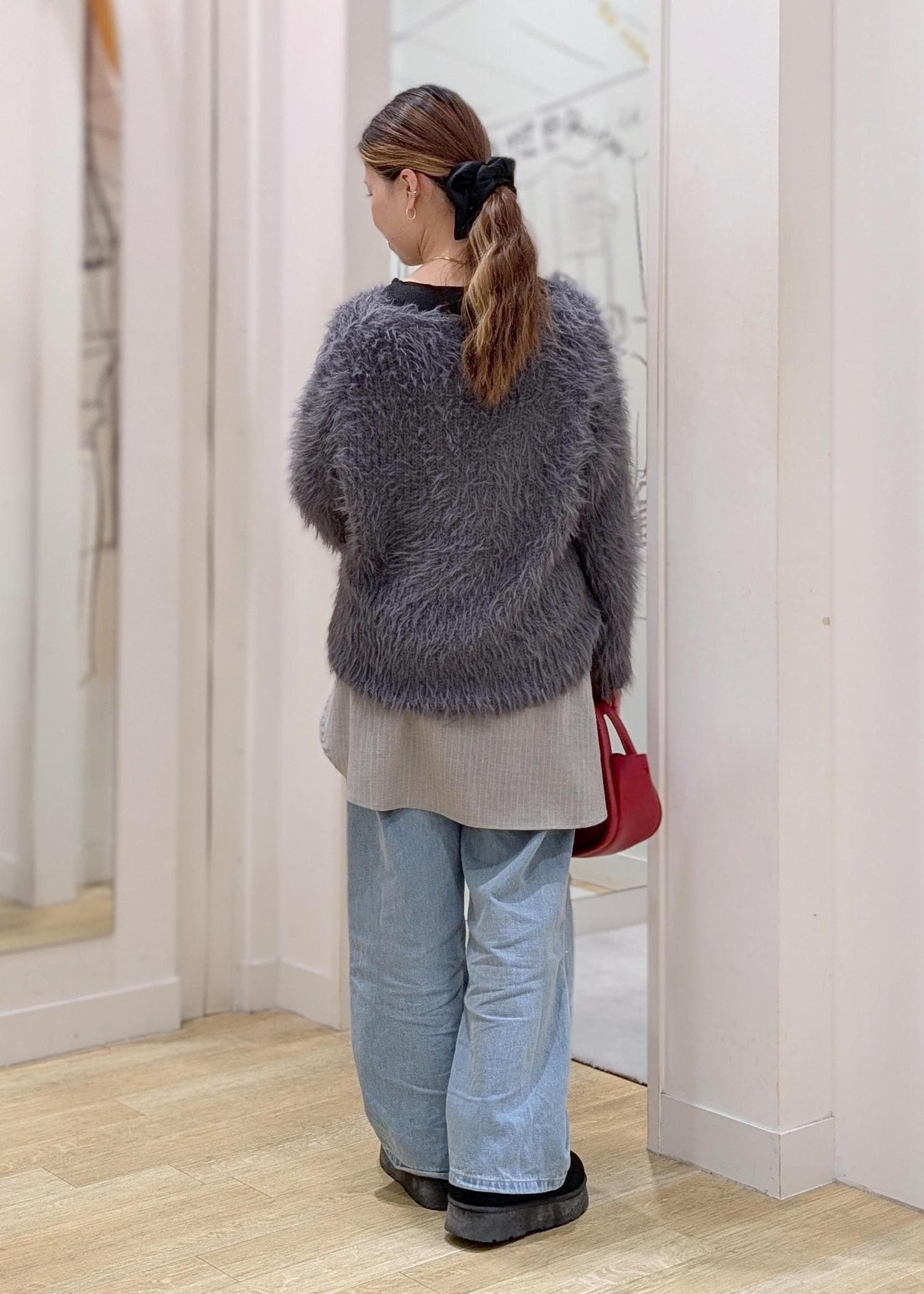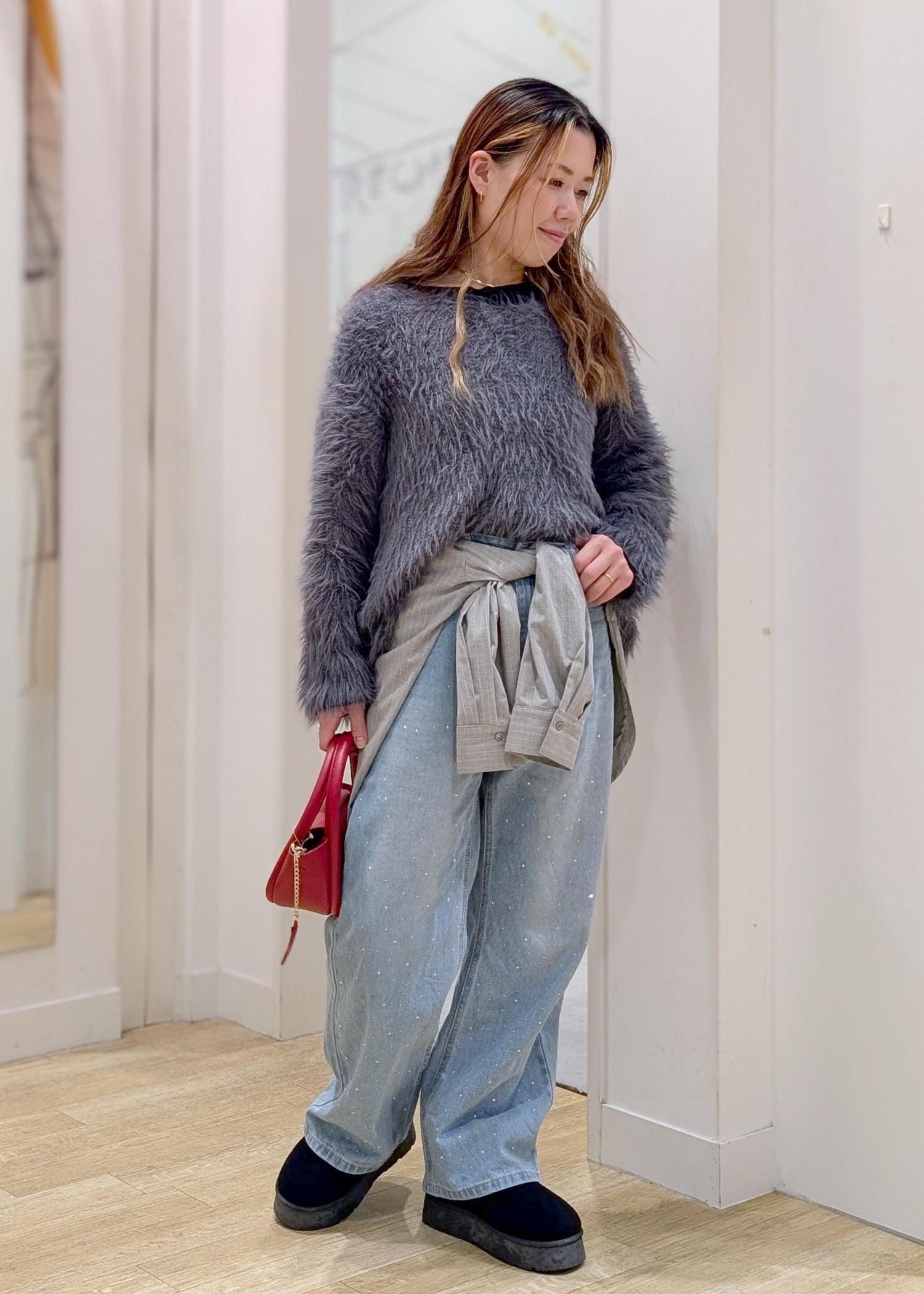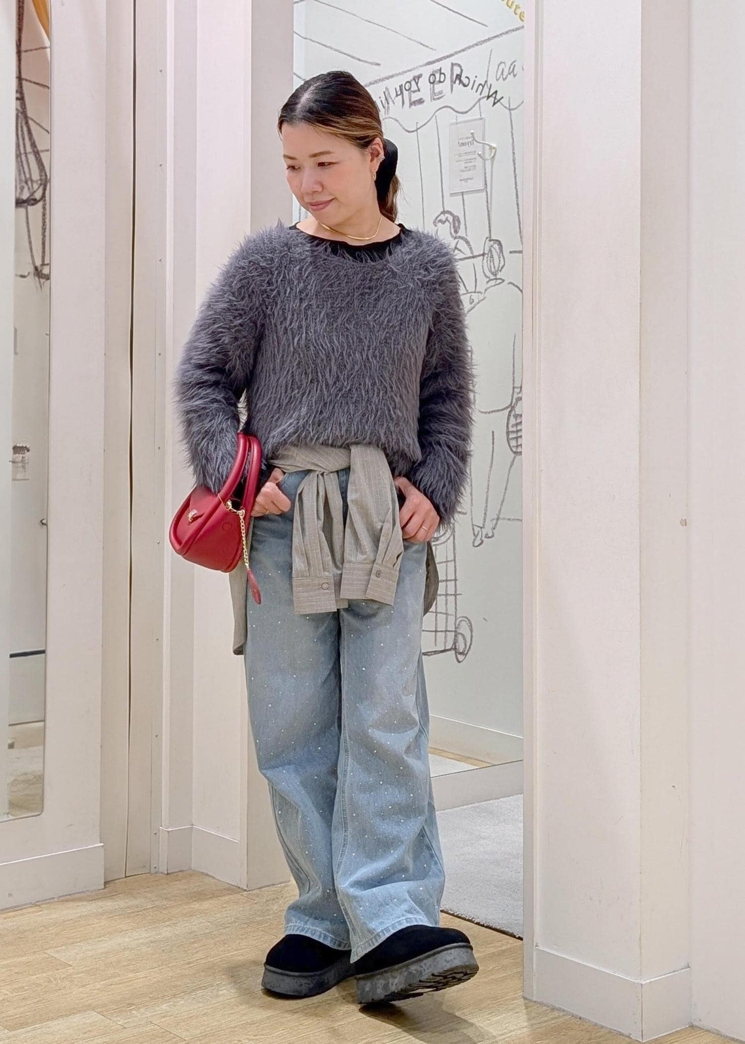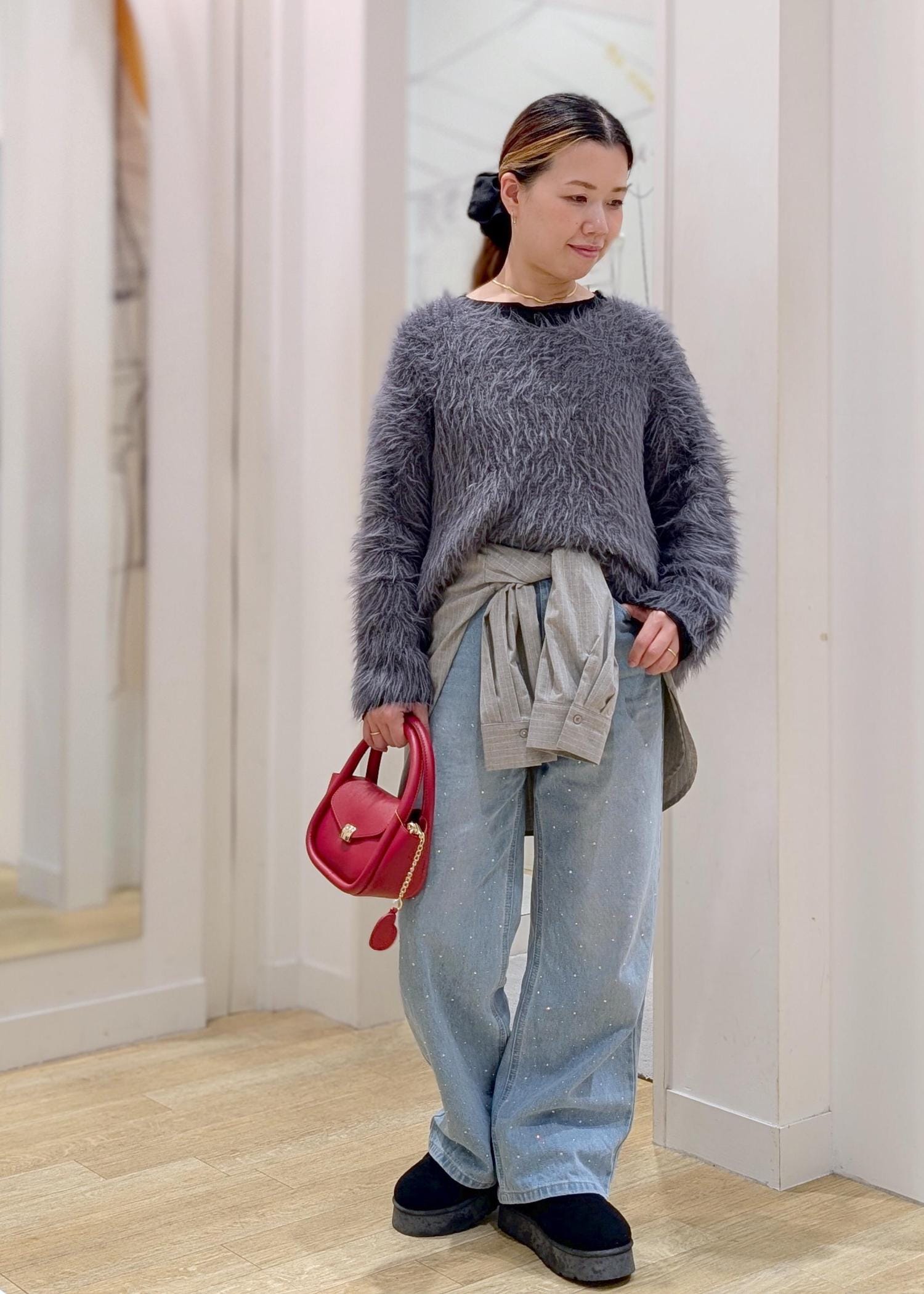 毛足が長いフェザーニットなので、甘めな印象になりがちなんですがデニムと合わせることでカジュアルMIXで着ても可愛いです♪