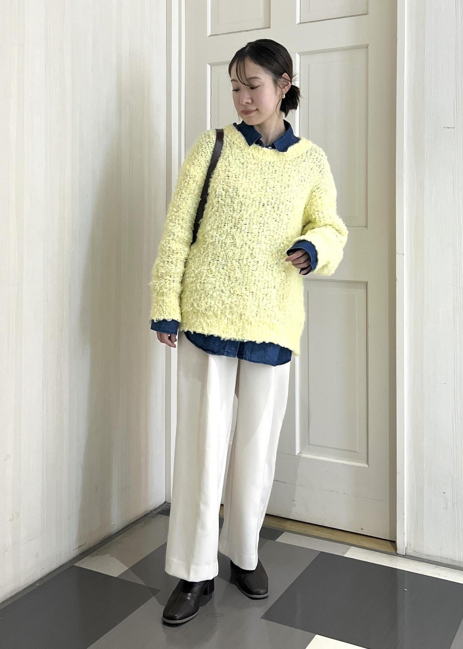 ROPÉ PICNICブークレカラーニットイエロー / F¥3,842レビューゆったりサイズで、ふんわりとした着心地でした。袖丈は手が隠れるくらい、着丈はヒップが隠れるくらいです。