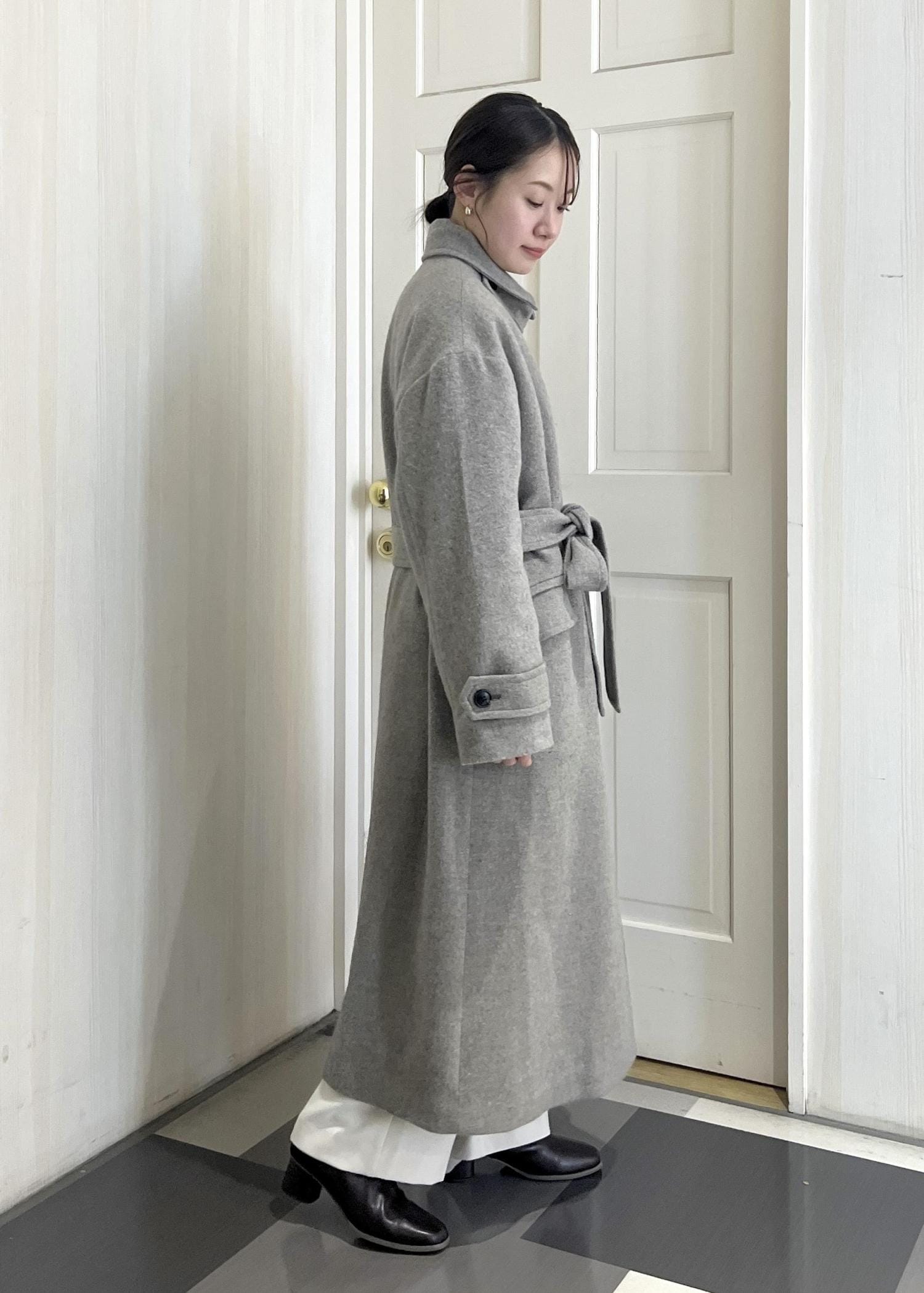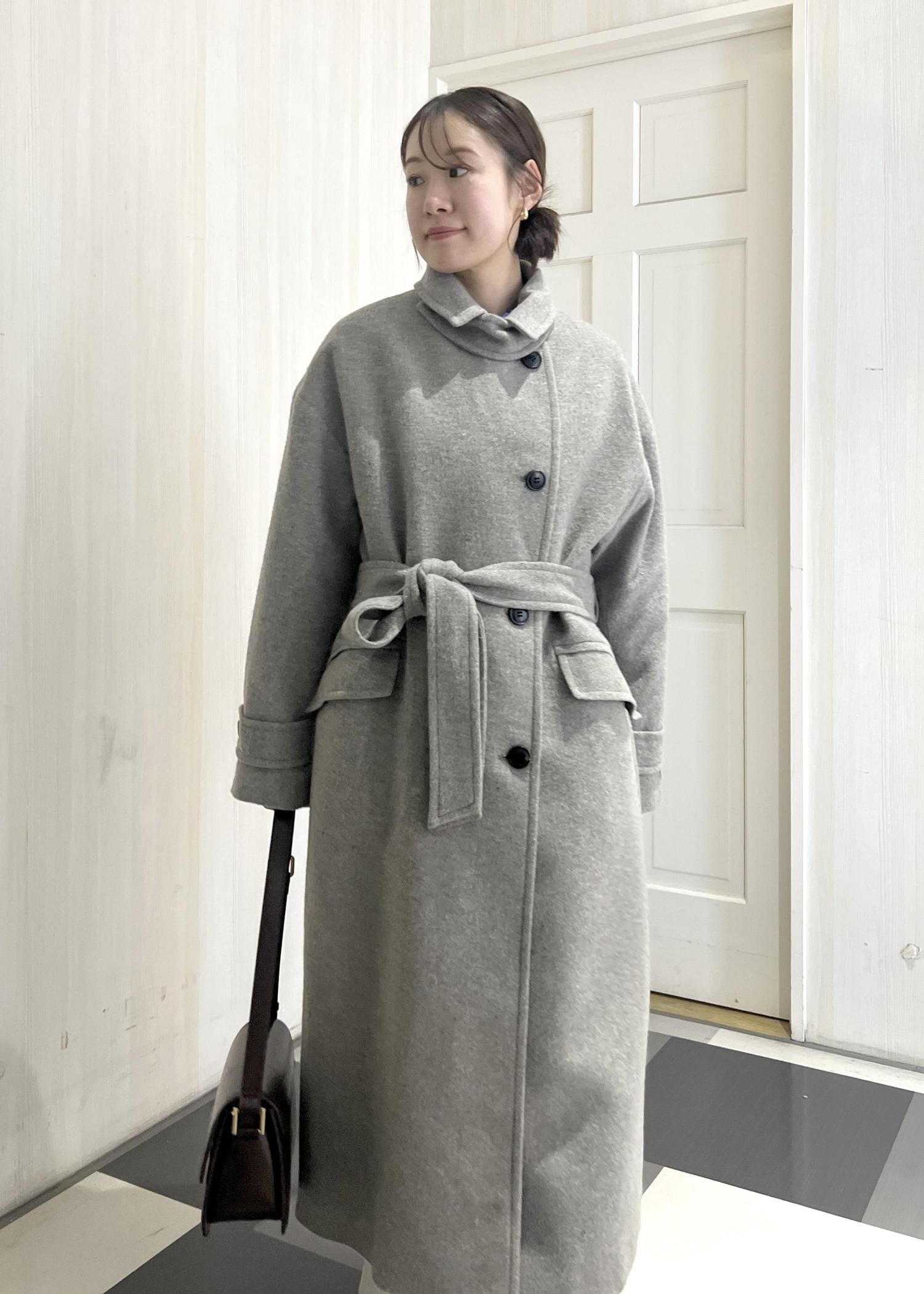 こちらのロングコートはVネックにもスタンドカラーにもなるので、ストールなしでもあたたかくお召しいただけます。