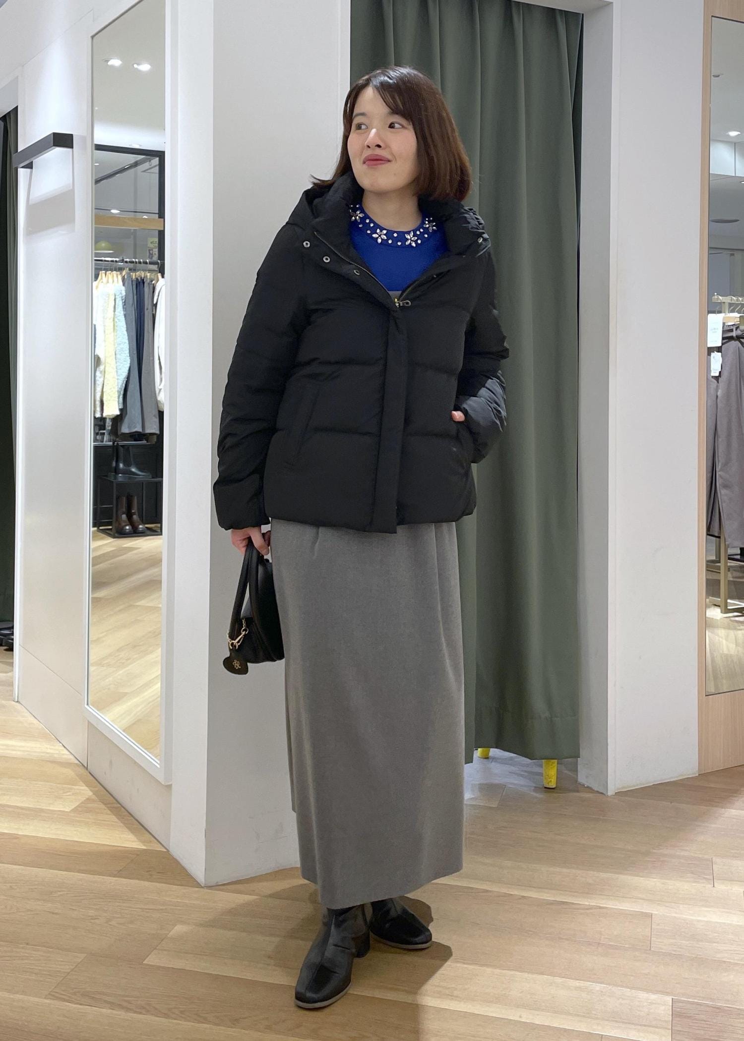 全体をブラックやグレーのモノトーンでまとめて、ブルーのビジューニットをポイントで合わせて、華やかさも演出しています◎