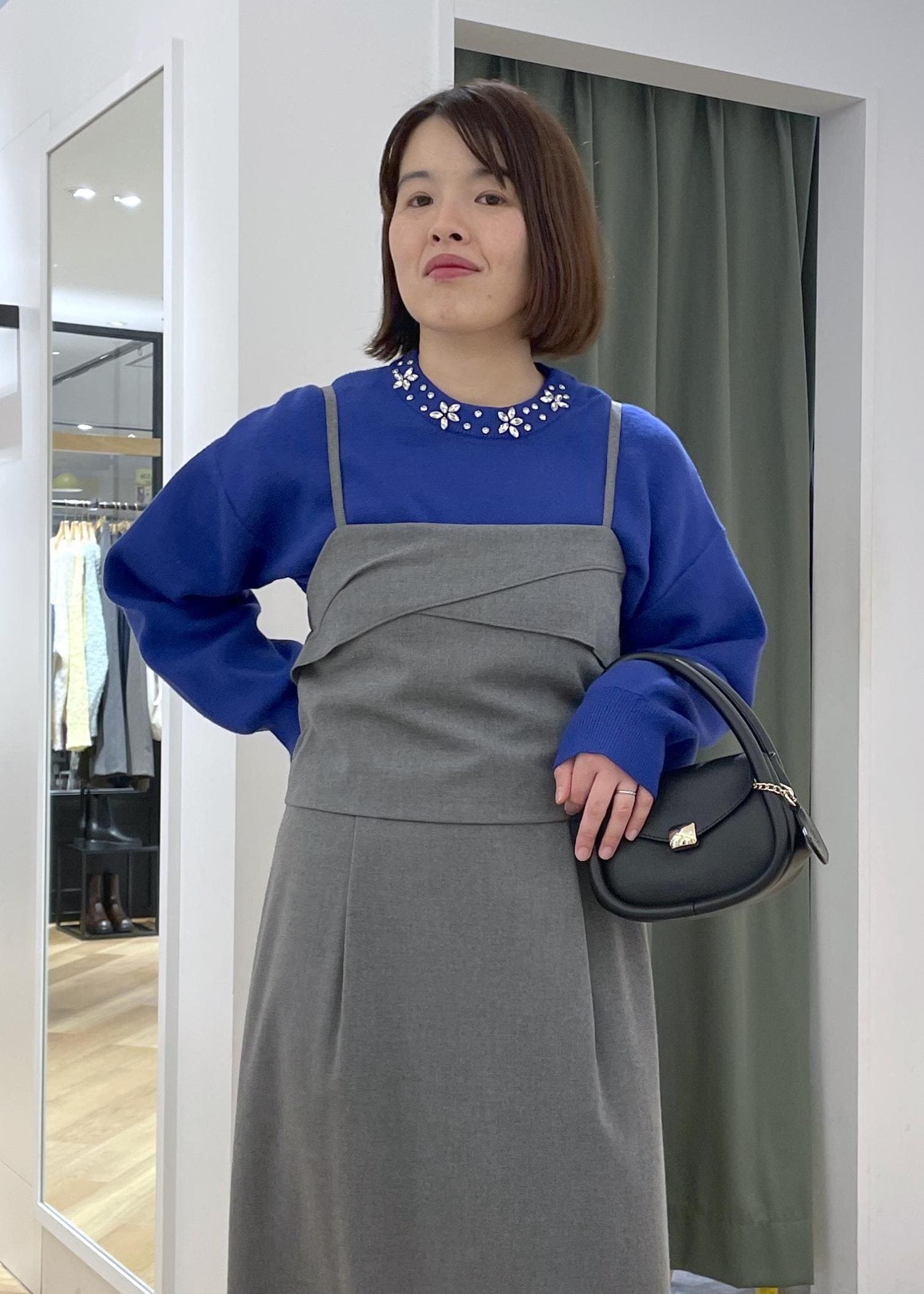ROPÉ PICNICビジューニットプルオーバーブルー / F¥3,842レビュー襟元のビジューのデザインが華やかさを演出してくれるニットです。もちっとした肉厚の生地感で、温かく着心地も良いです。サイズ感は身頃は程良くゆとりがあり、お袖は少しボリューム感のあるシルエットとなっております。