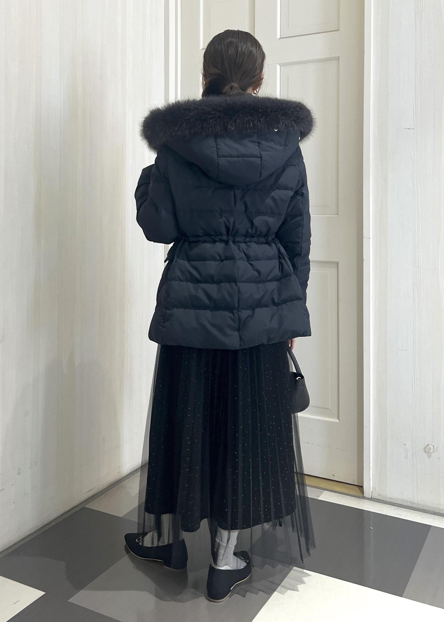 キラキラきらめくスカートにダウンコートを合わせて、落ち着いたきちんとコーデに。
