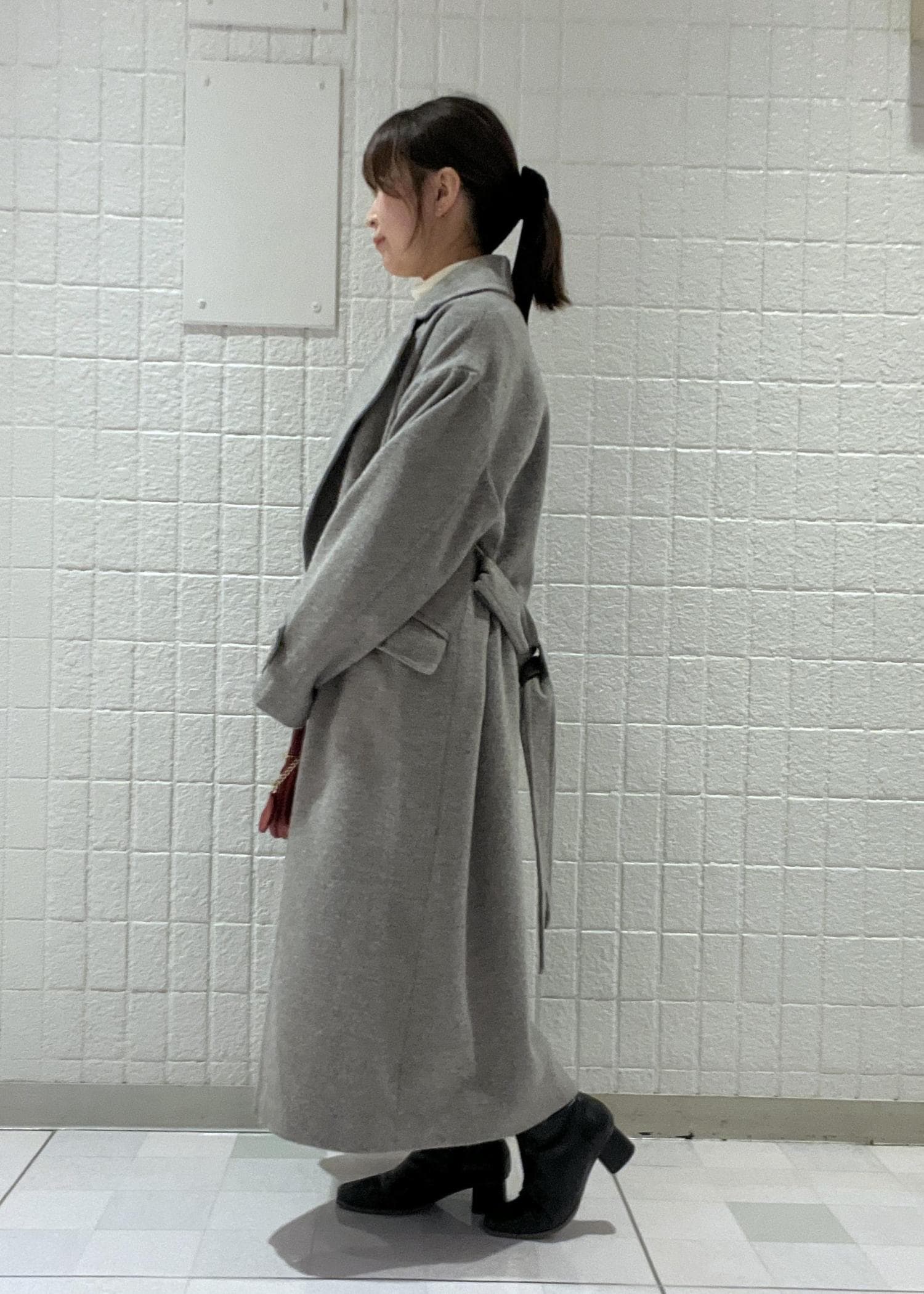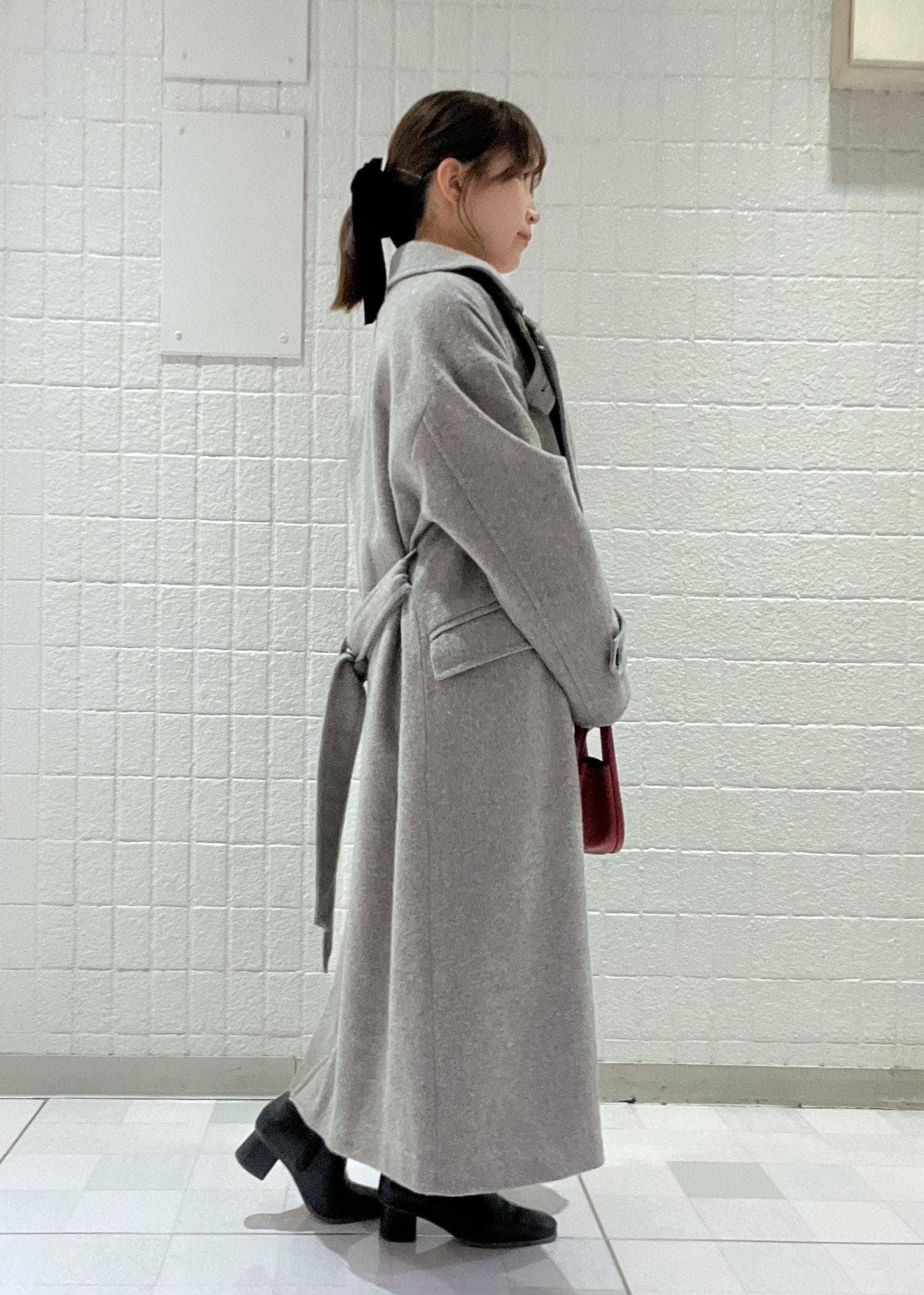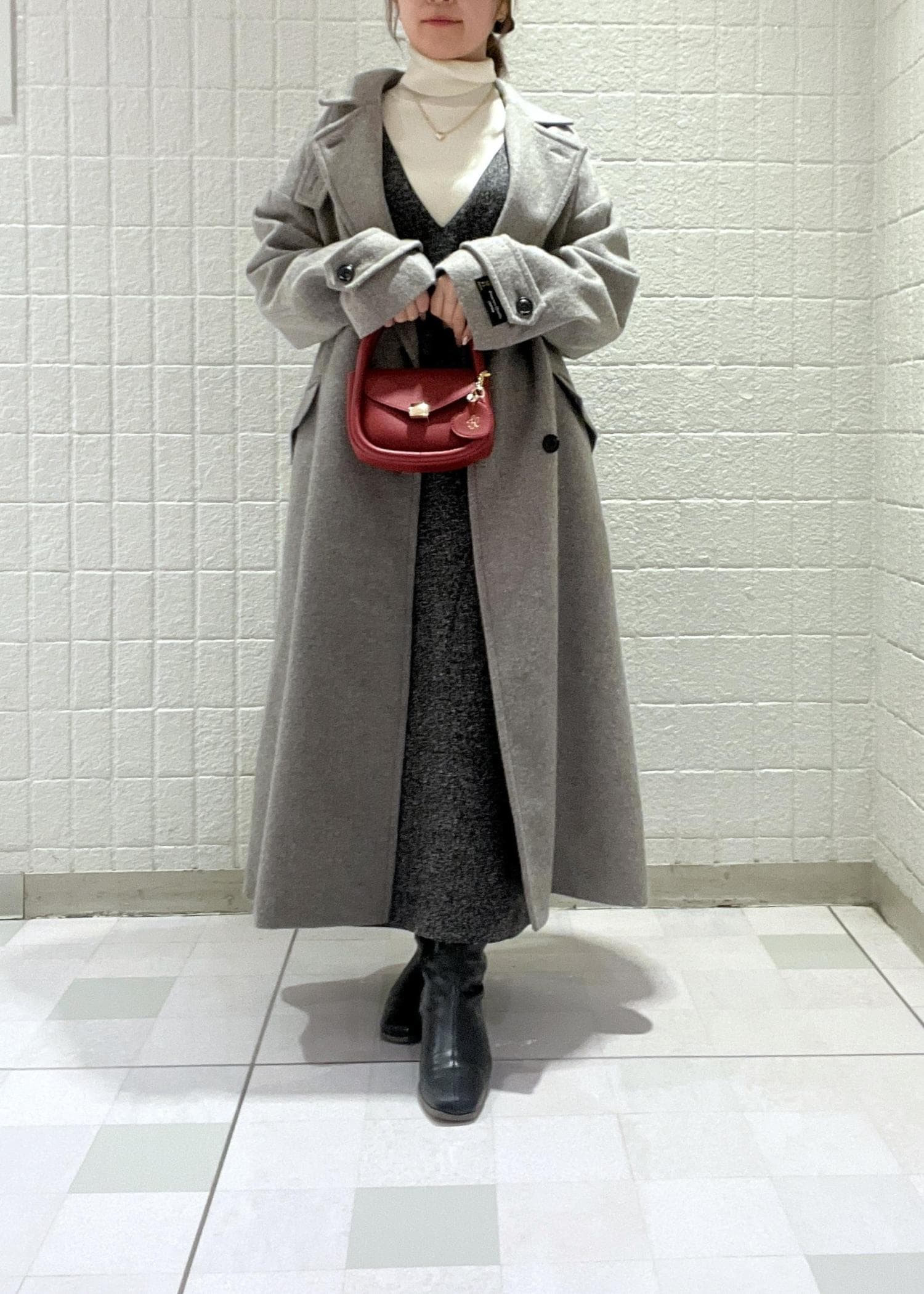 しっかり暖かいウール素材のロングコートに、上品なシルエットが魅力のペプラムワンピースを合わせた大人きれいめコーディネート。