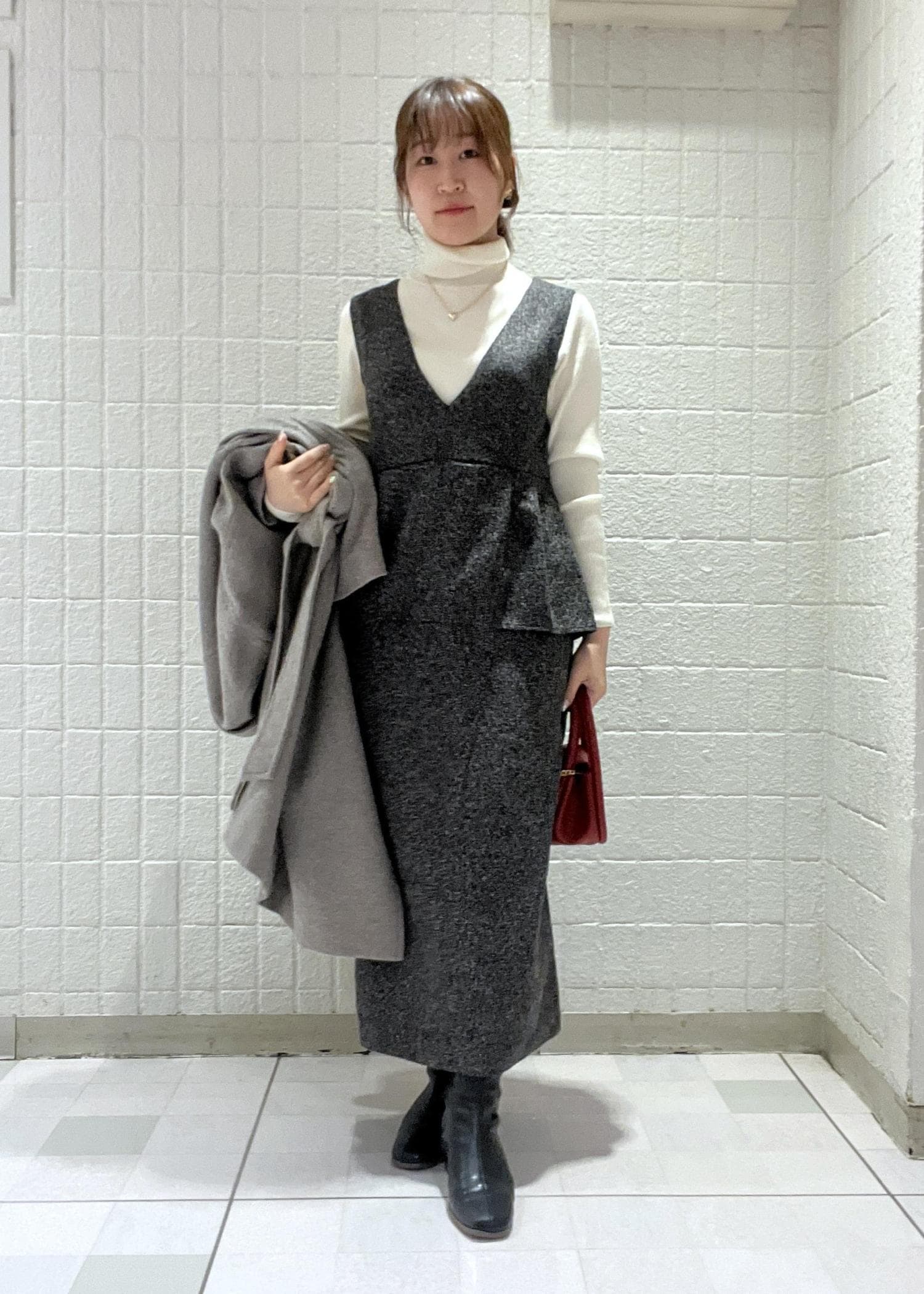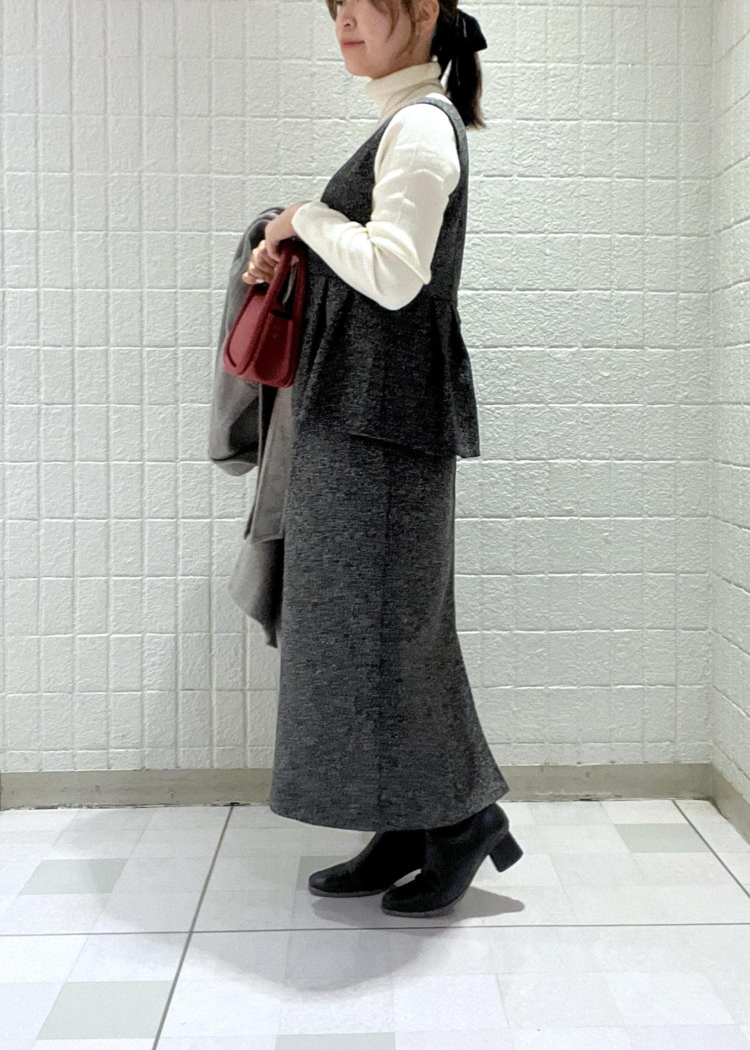 タートルネックを重ねることで防寒性を高めつつ、縦ラインを強調してすっきりとした印象に仕上げました。