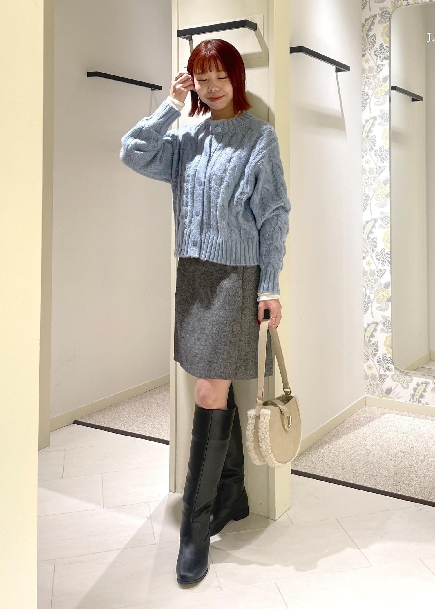 ブルーのカーディガンをアクセントに、グレー系で統一感のあるコーディネートにまとめてみました。