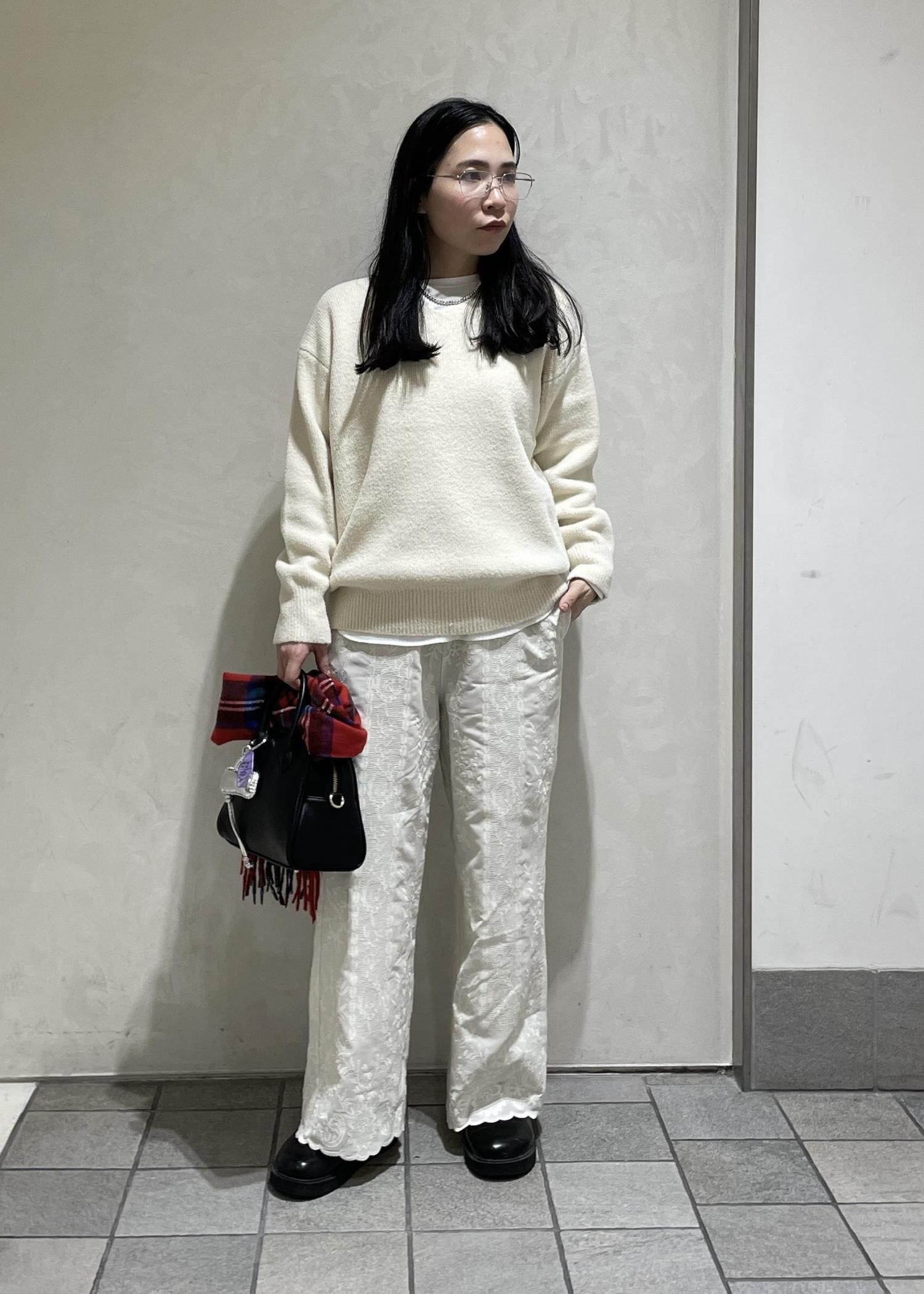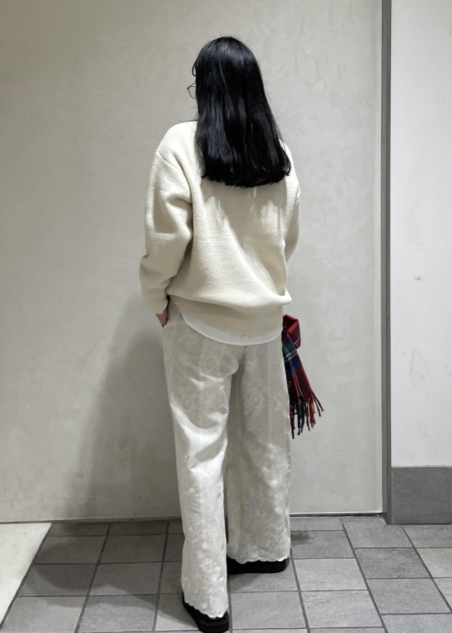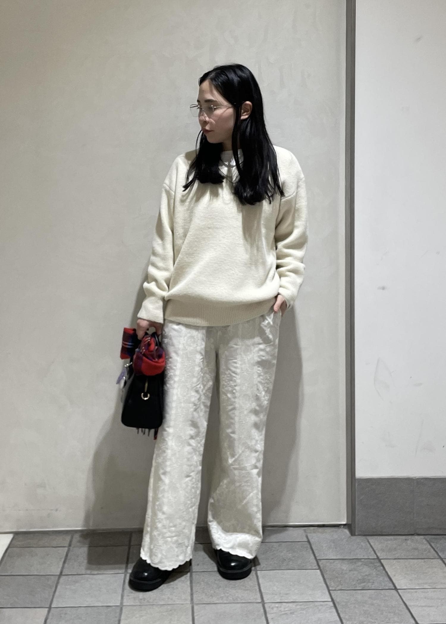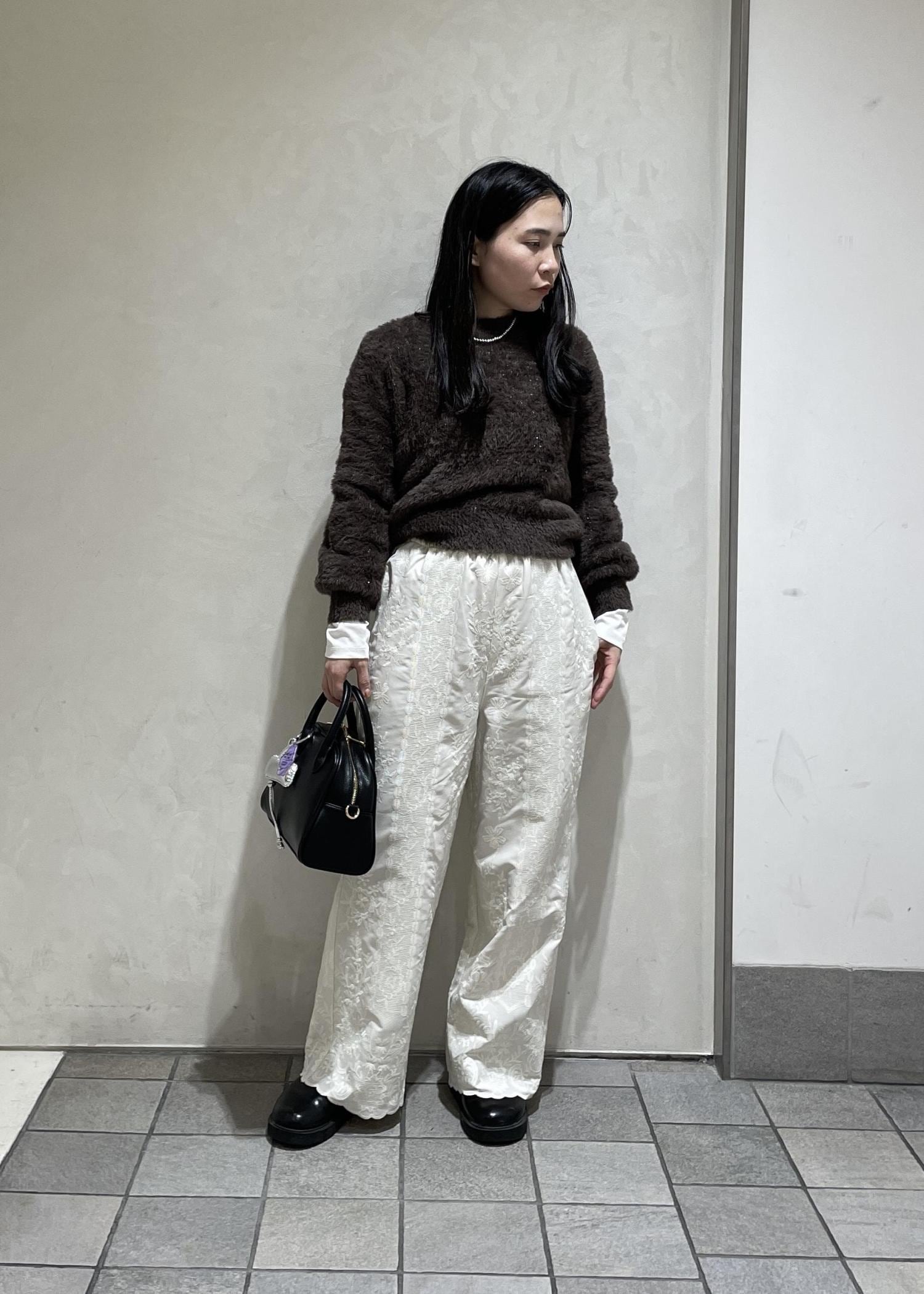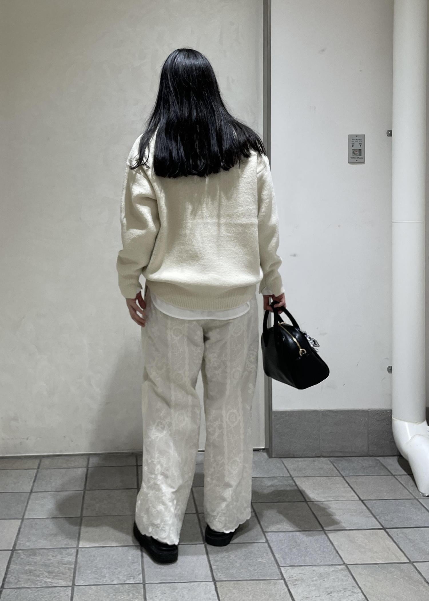 刺繍パンツをメインにホワイトのワントーンスタイリングにしました。