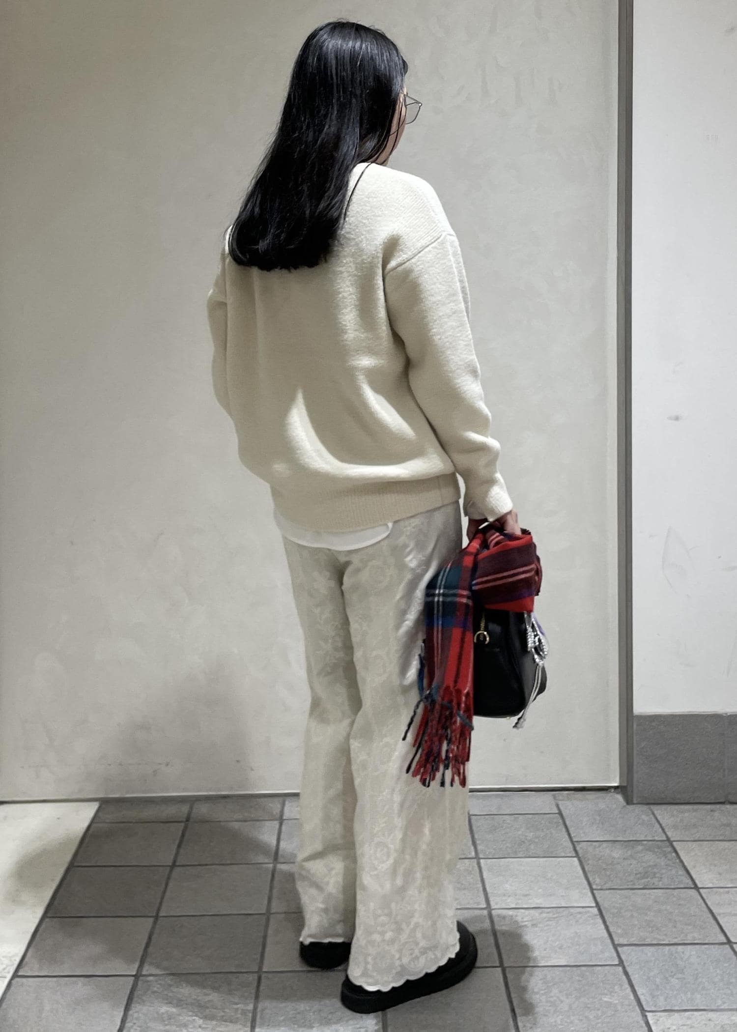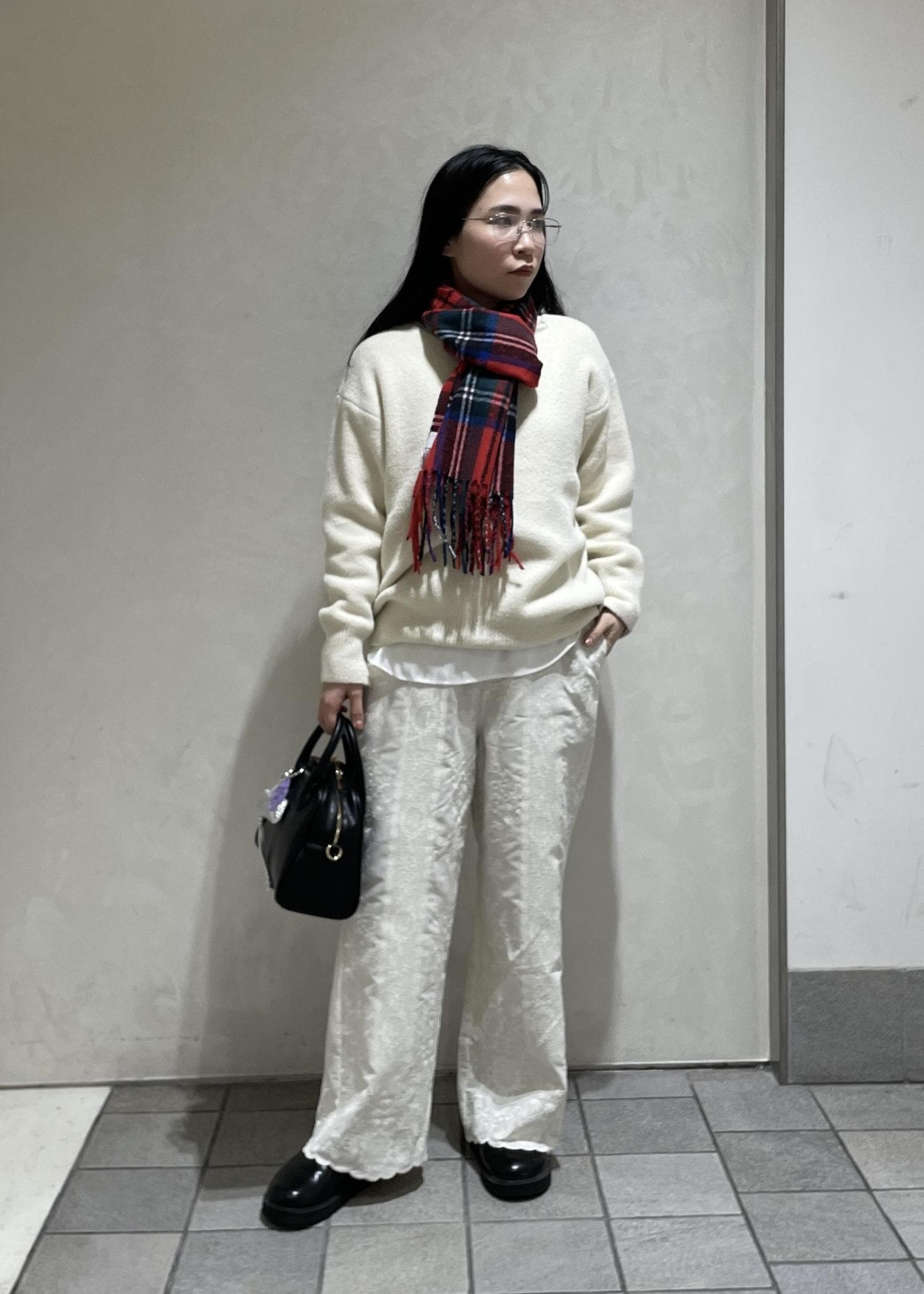 バックと靴は黒でしめて、赤いマフラーを差し色にしました!