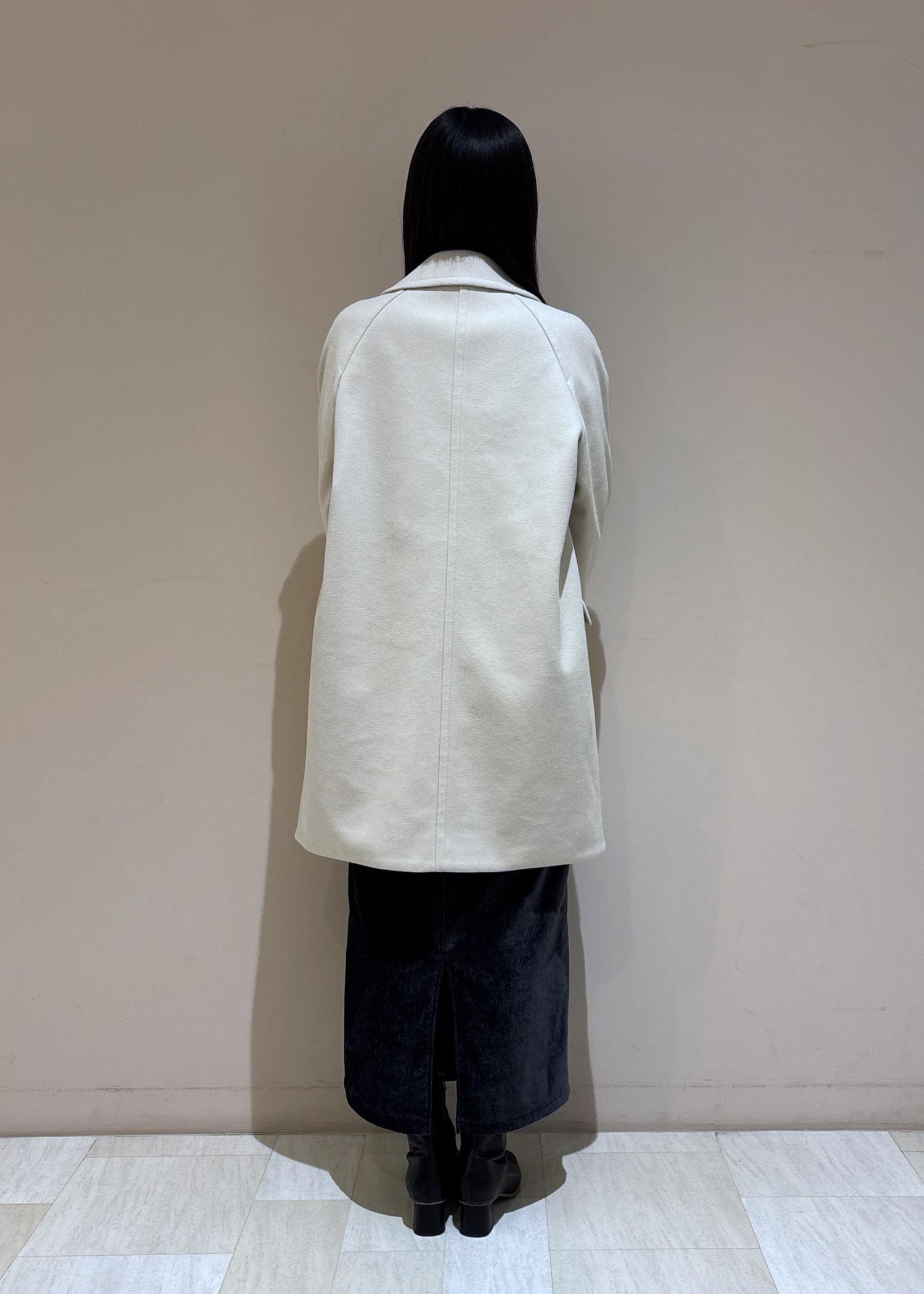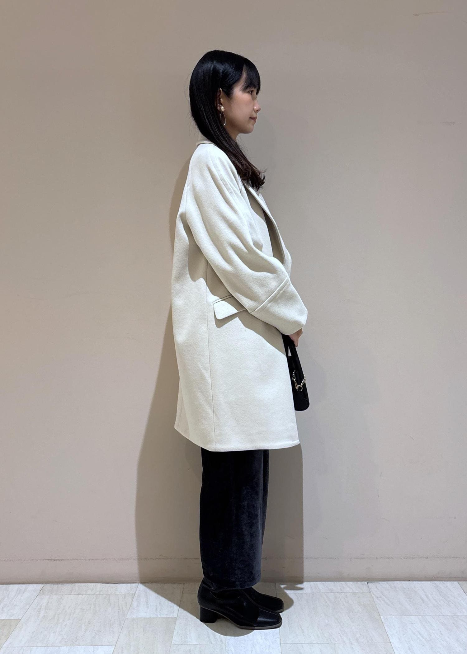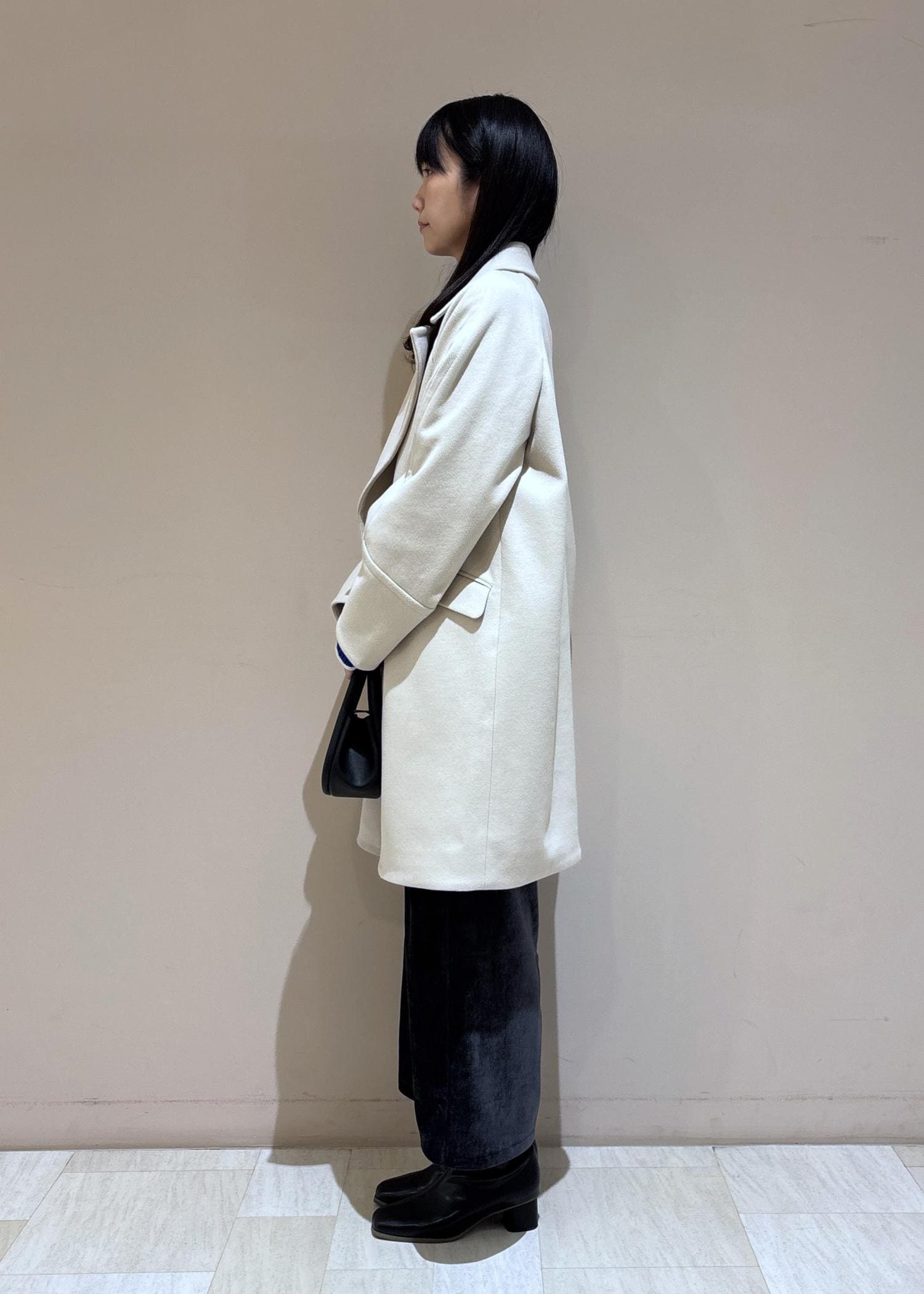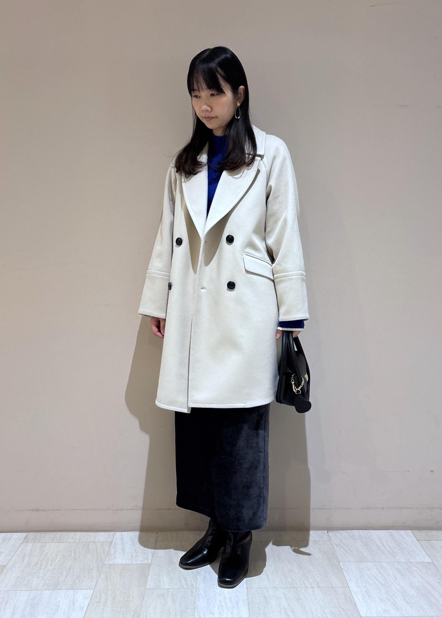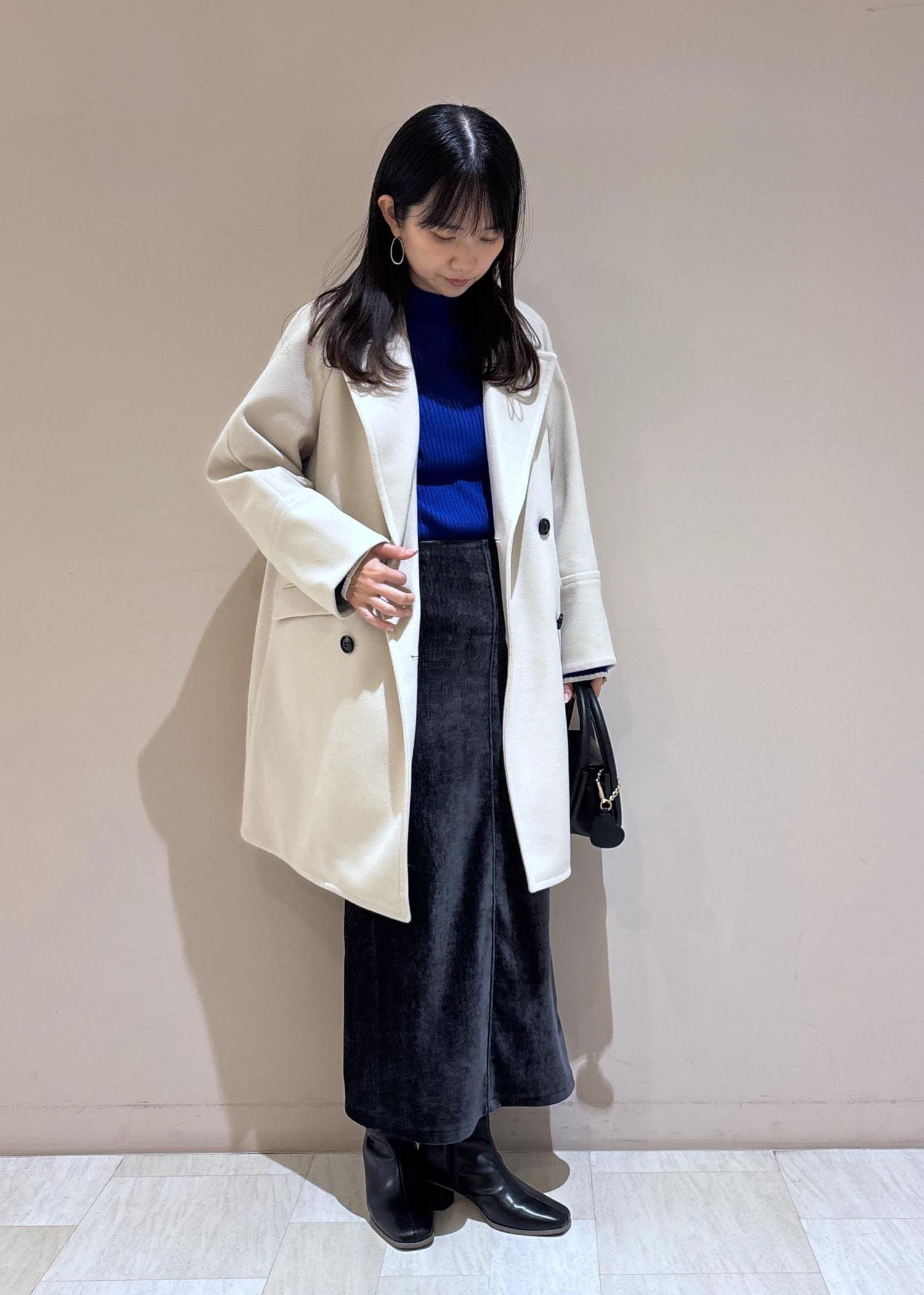 シックな印象のブルーとブラックのコーデですが、コートを明るいベージュにして顔まわりを明るくしてみました。