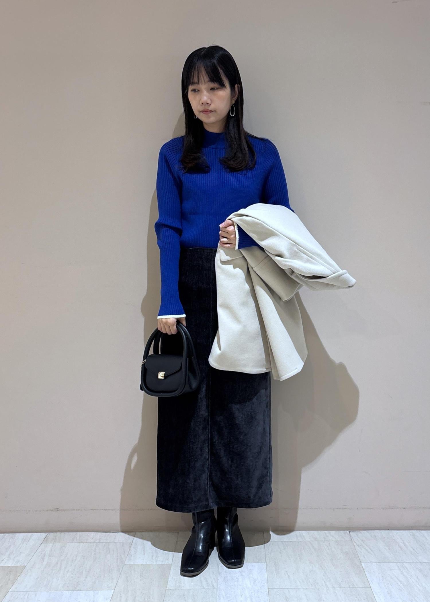 ブルーのリブニットをメインにしたスタイリングです。
