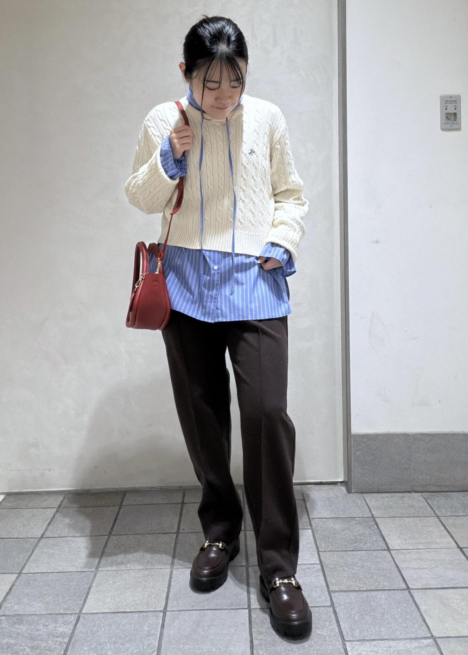 今年トレンドのレイヤードスタイルでコーディネートを組んでみました!シンプルなホワイト、ブラウンをベースに、レイヤードシャツや小物で色を持ってきたのがポイントです