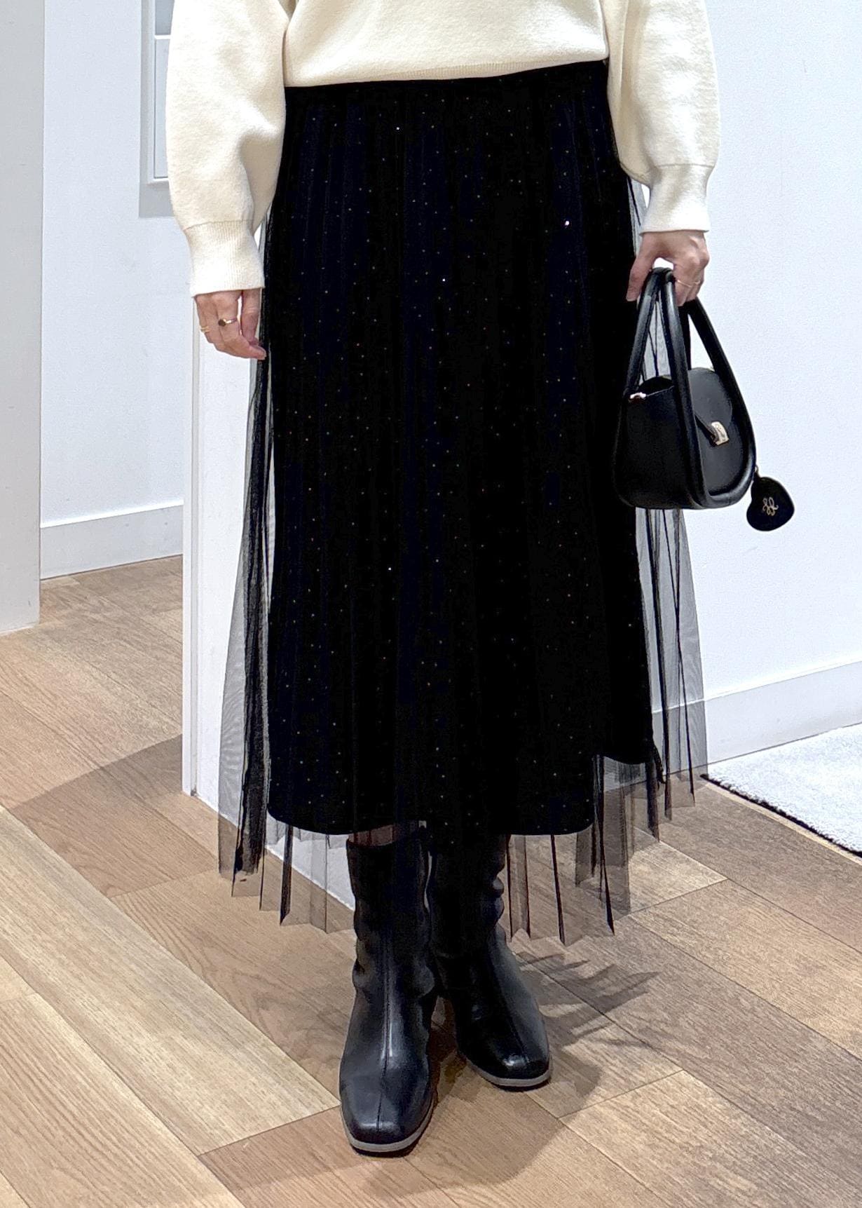 ROPÉ PICNICキラキラチュールプリーツスカート/着丈が選べるブラック / MT¥6,490レビューチュール×キラキラが印象的なスカートです。162㎝MTで足首が出るくらいで、上のチュールはくるぶしくらいの長さでした。