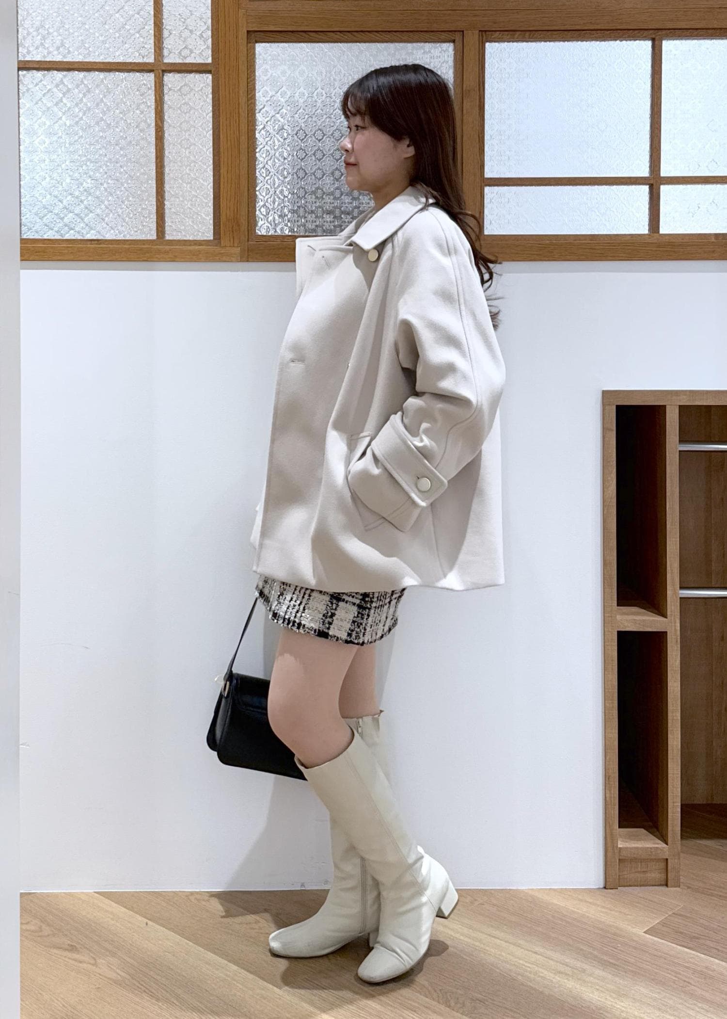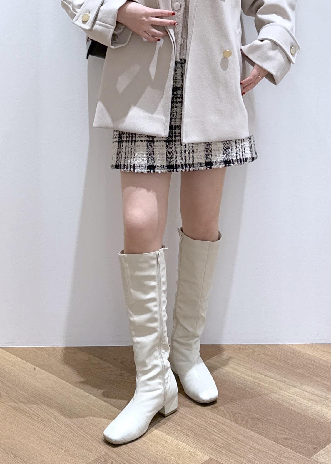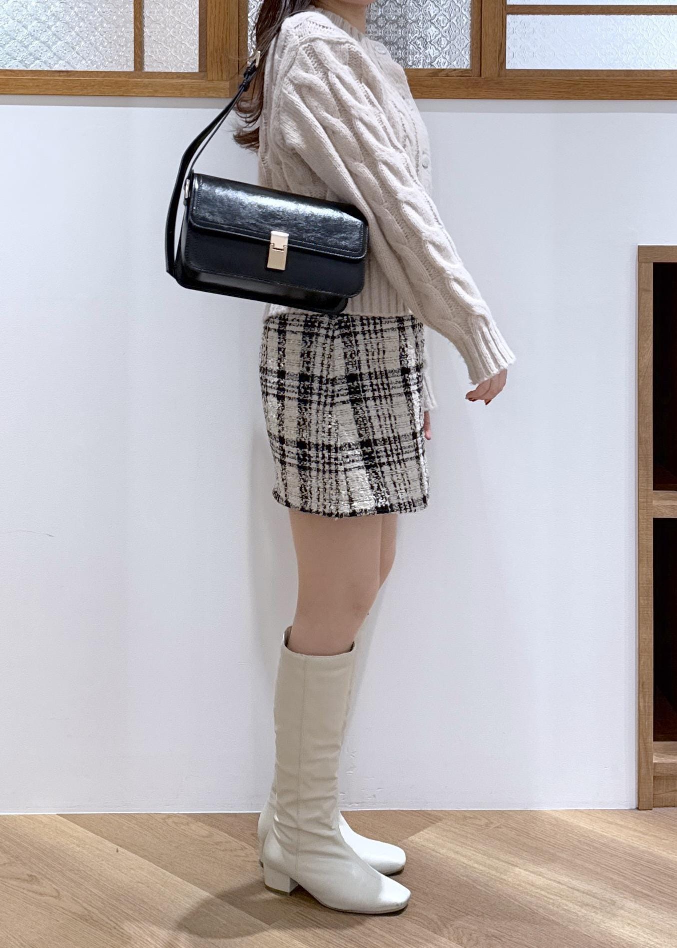 ミニ丈のボトムにロングブーツを合わせ、抜け感をプラス。