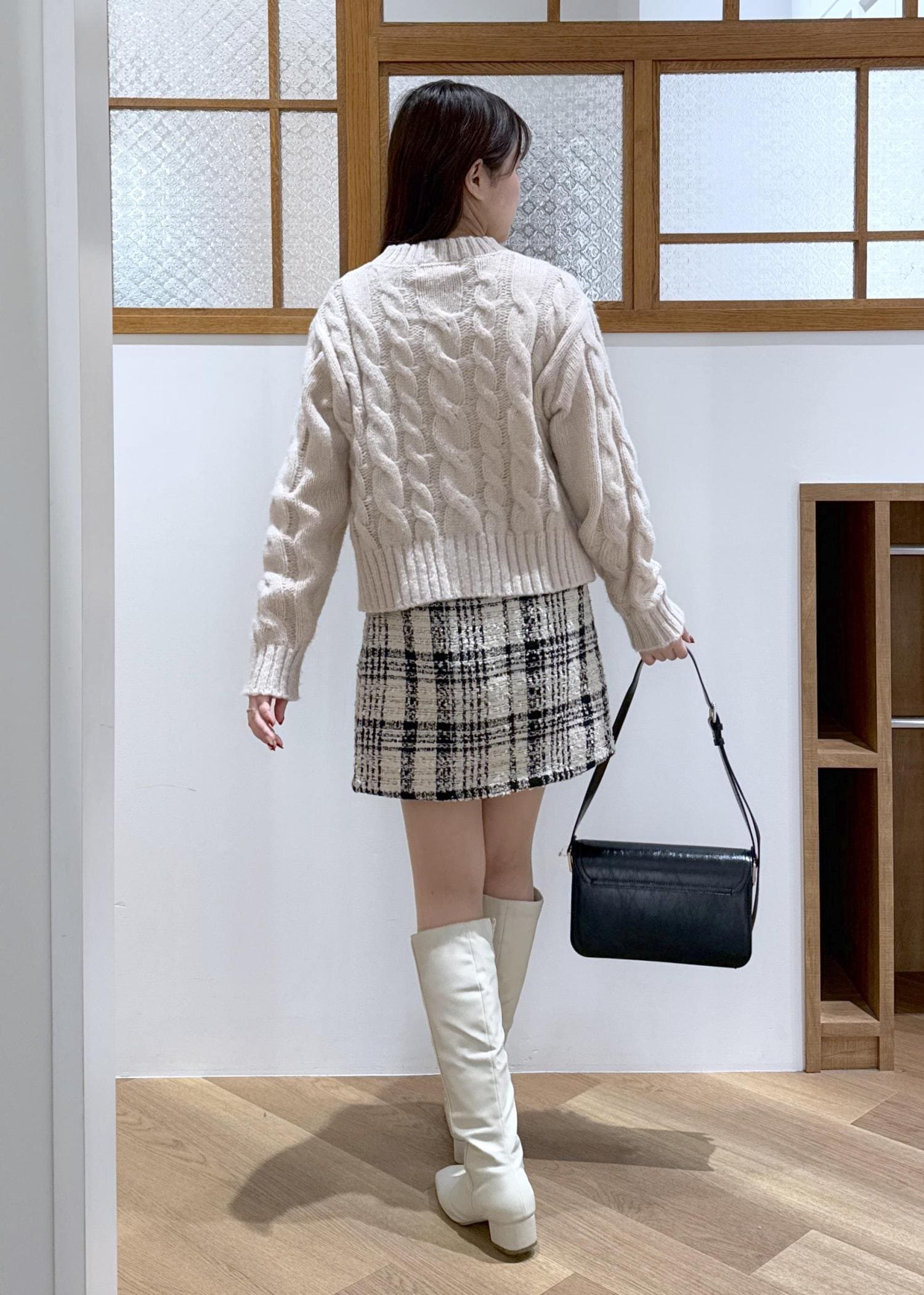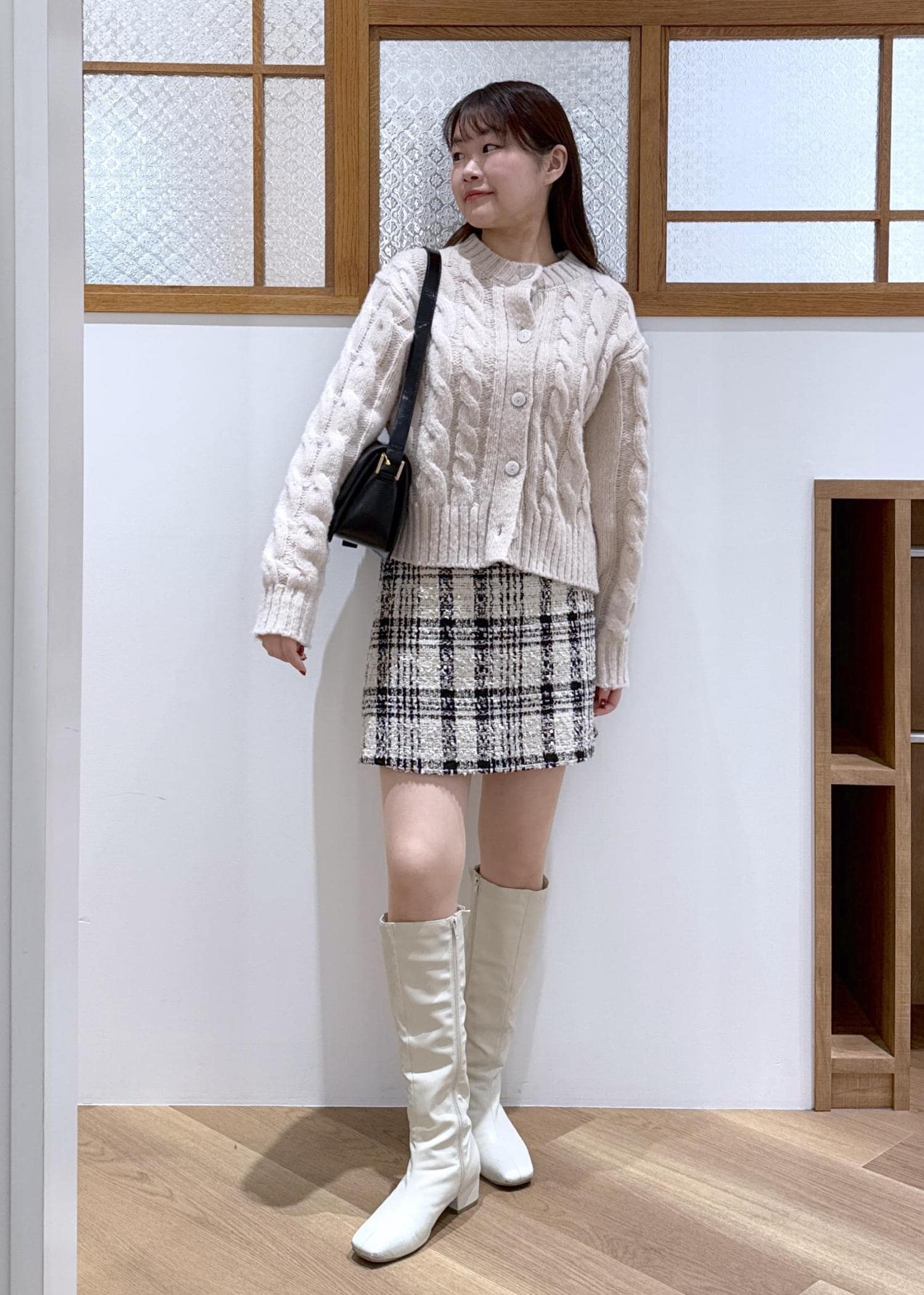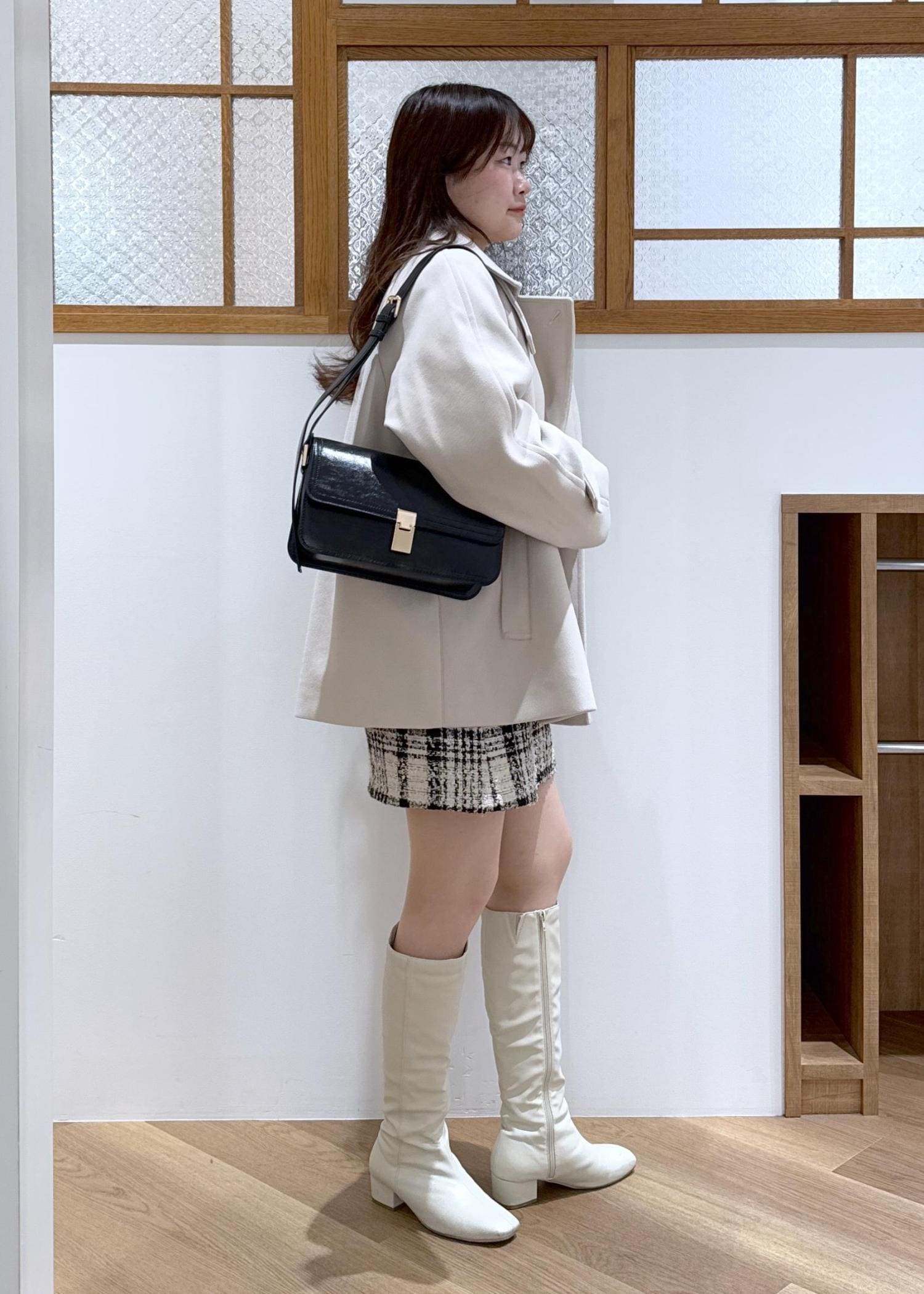 ミニ丈のボトムにロングブーツを合わせ、抜け感をプラス。