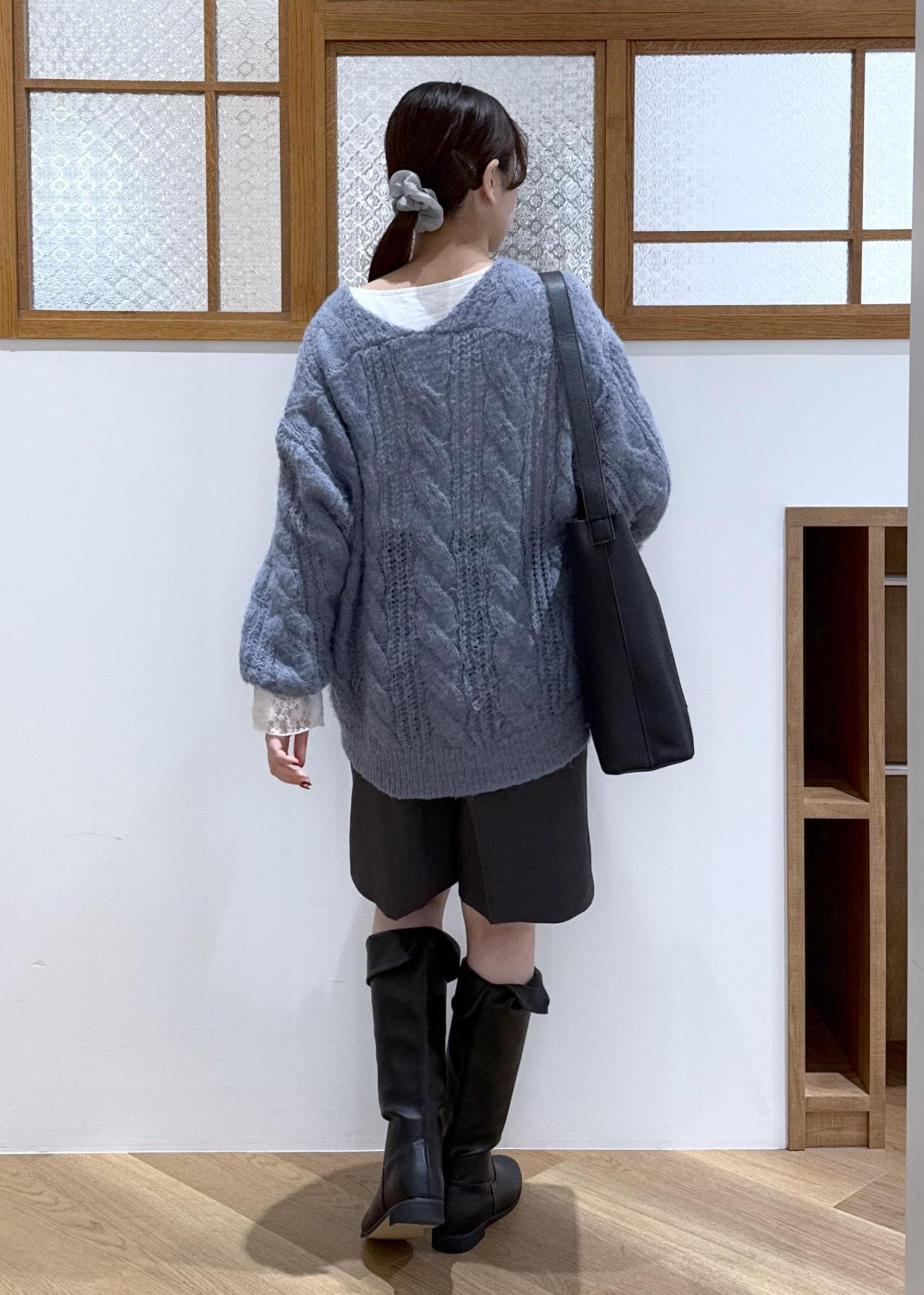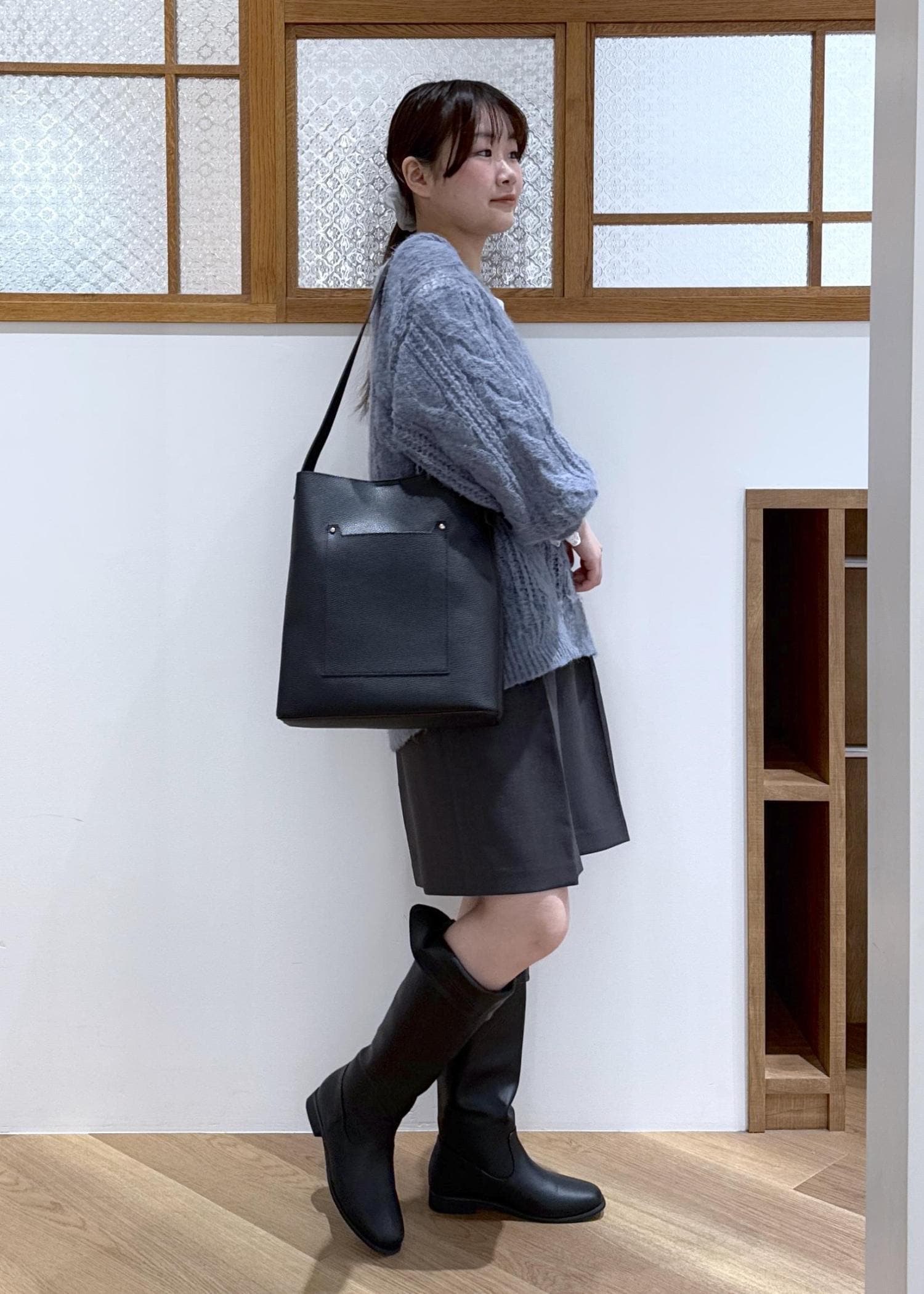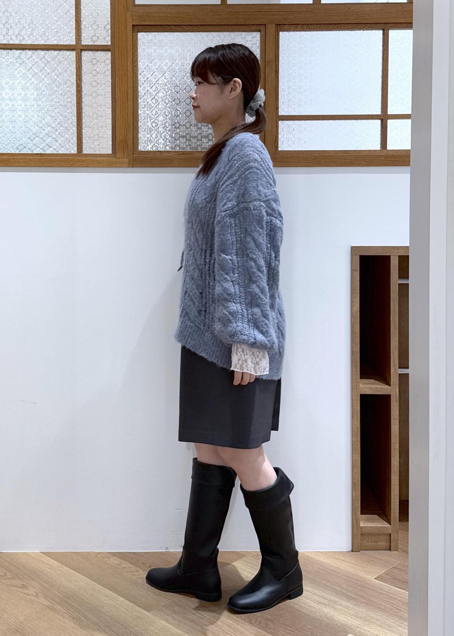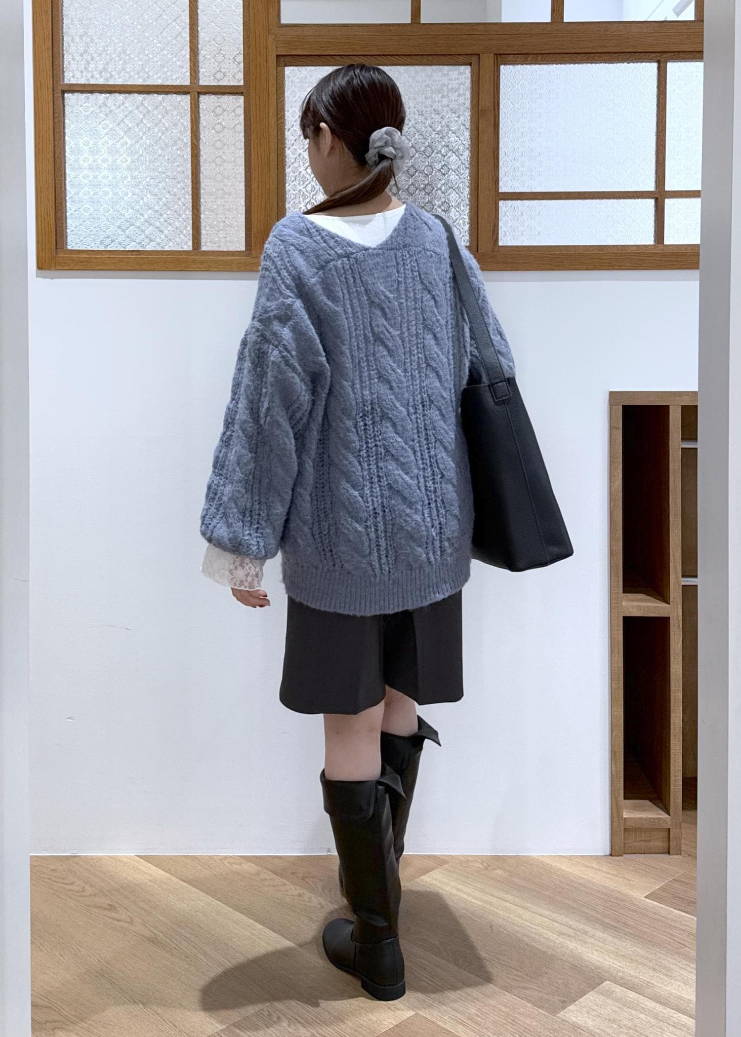 ブルーニットを主役に寒色でまとめたコーディネートです。