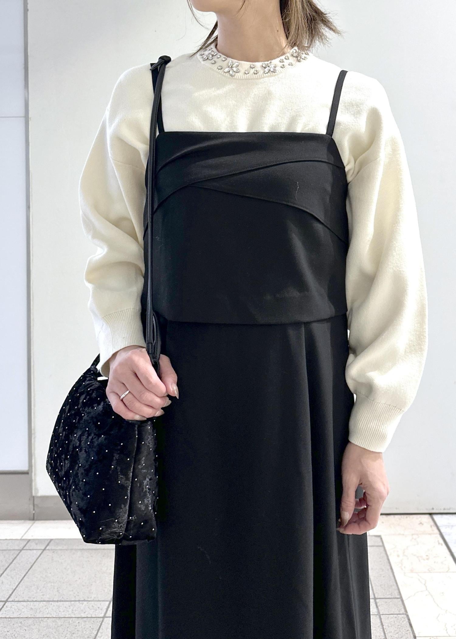 着丈は腰まわりにかかる位の長さ。首元のビジューが煌めき、アクセサリーをつけなくても華やかさのあるデザインです。 -