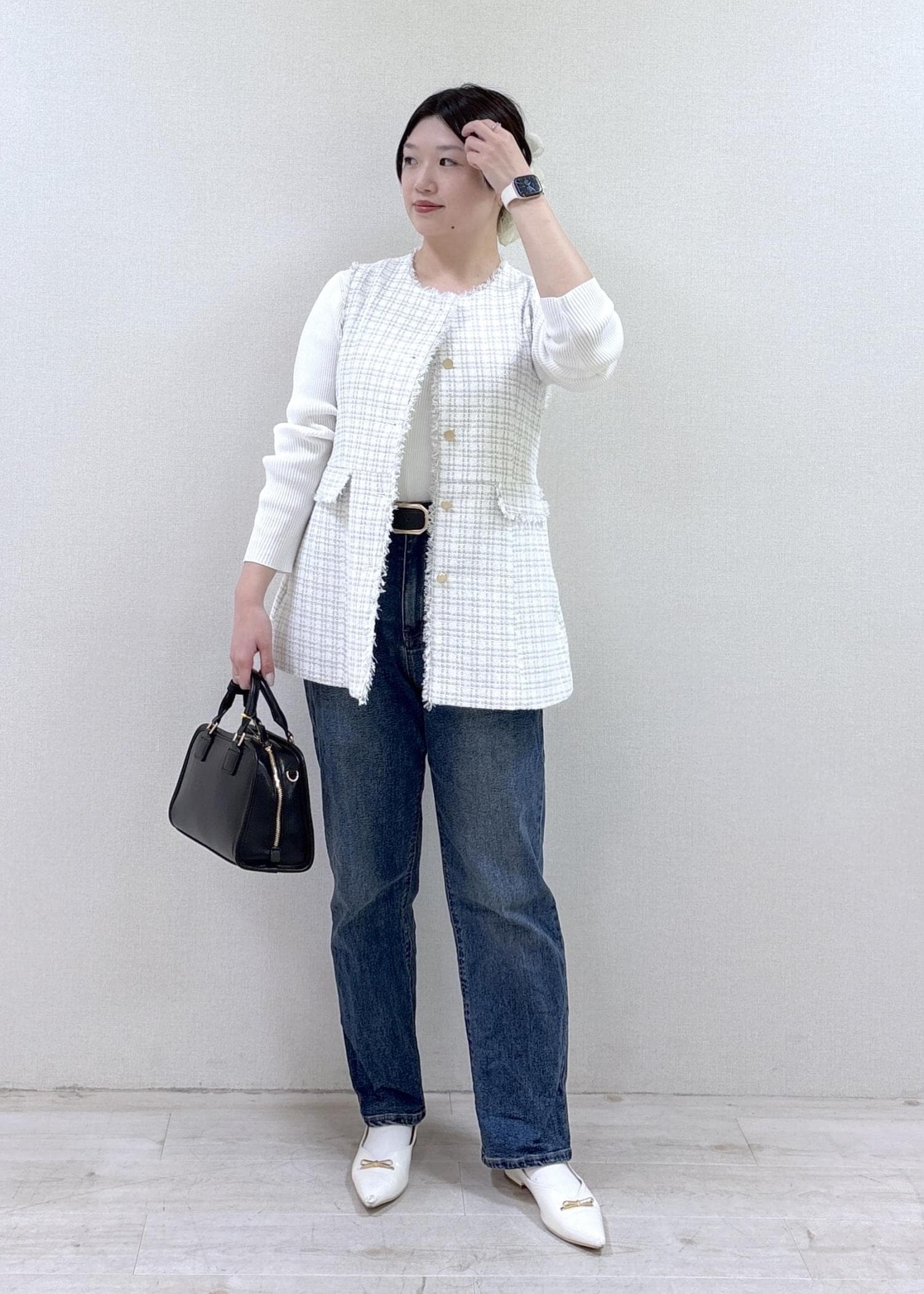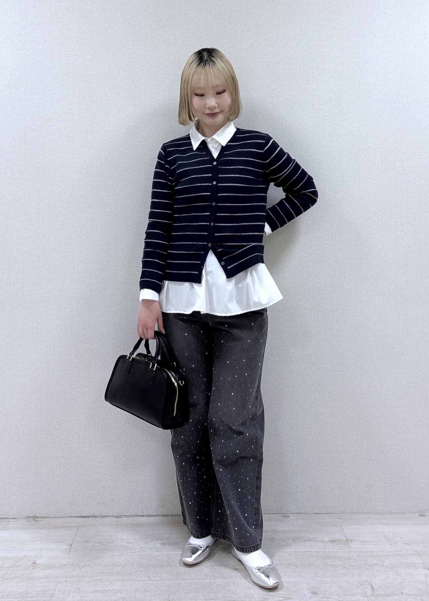 フェザーのニットとレースのインナーを合わせ、フェミニンなコーディネートにしてみました。