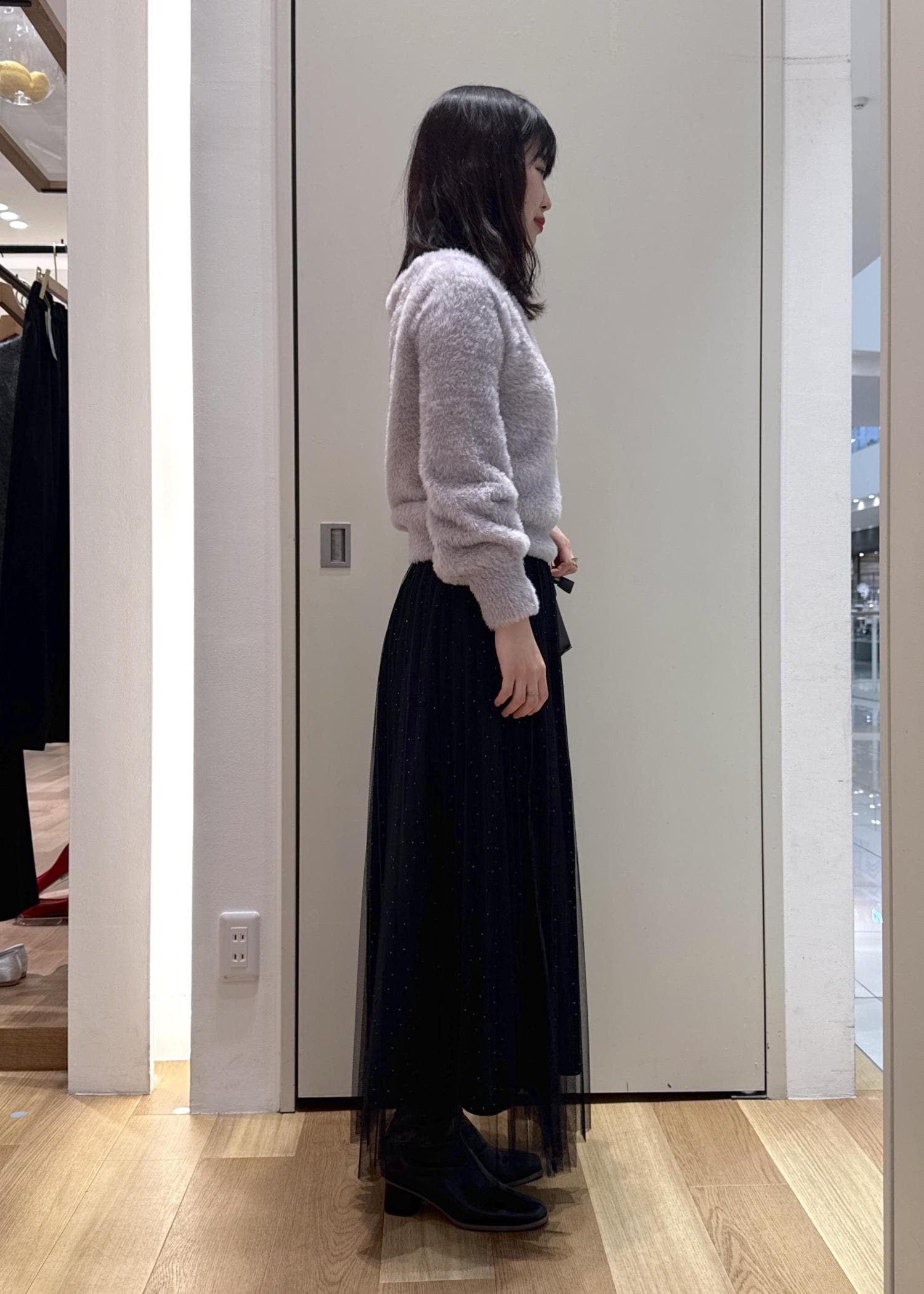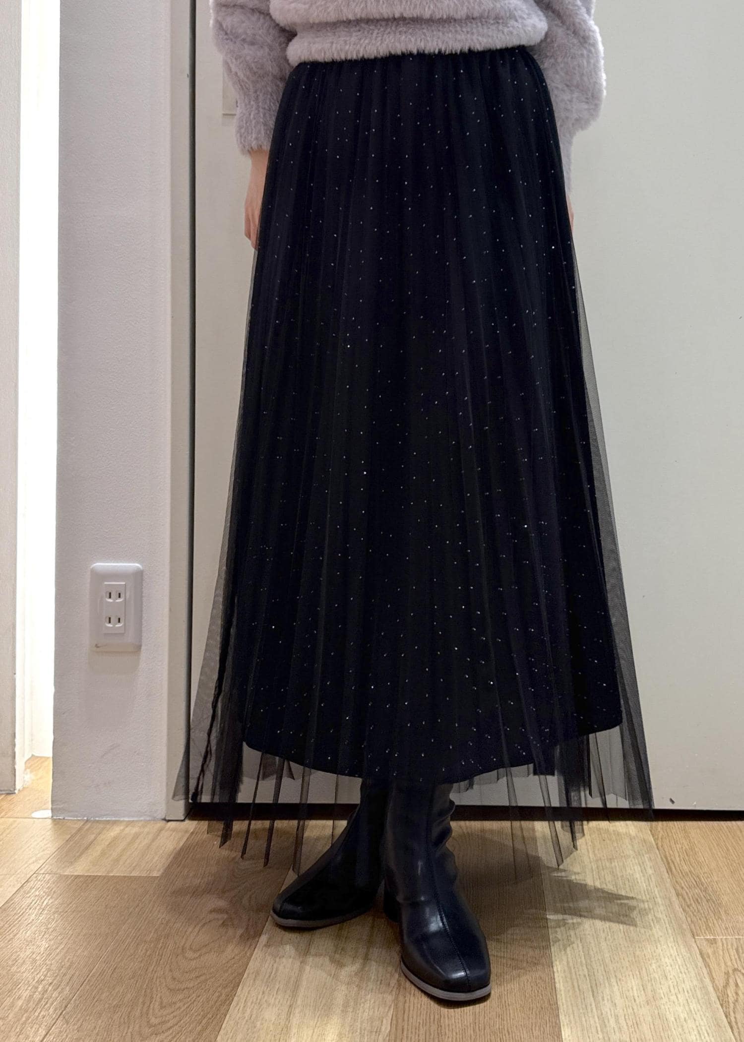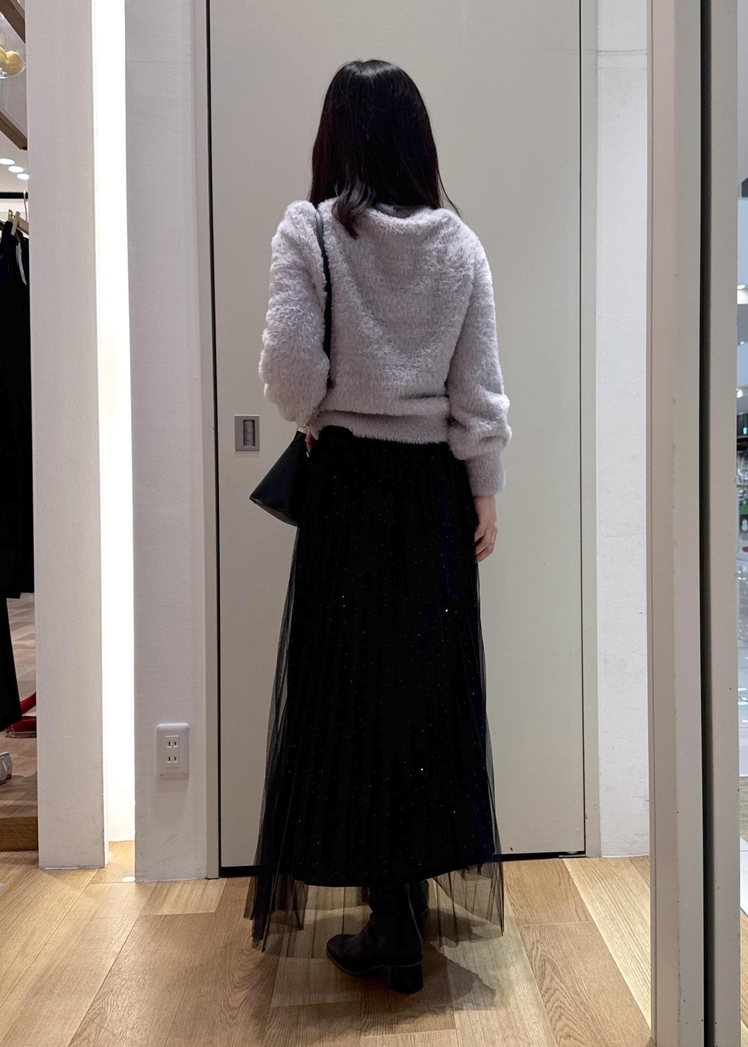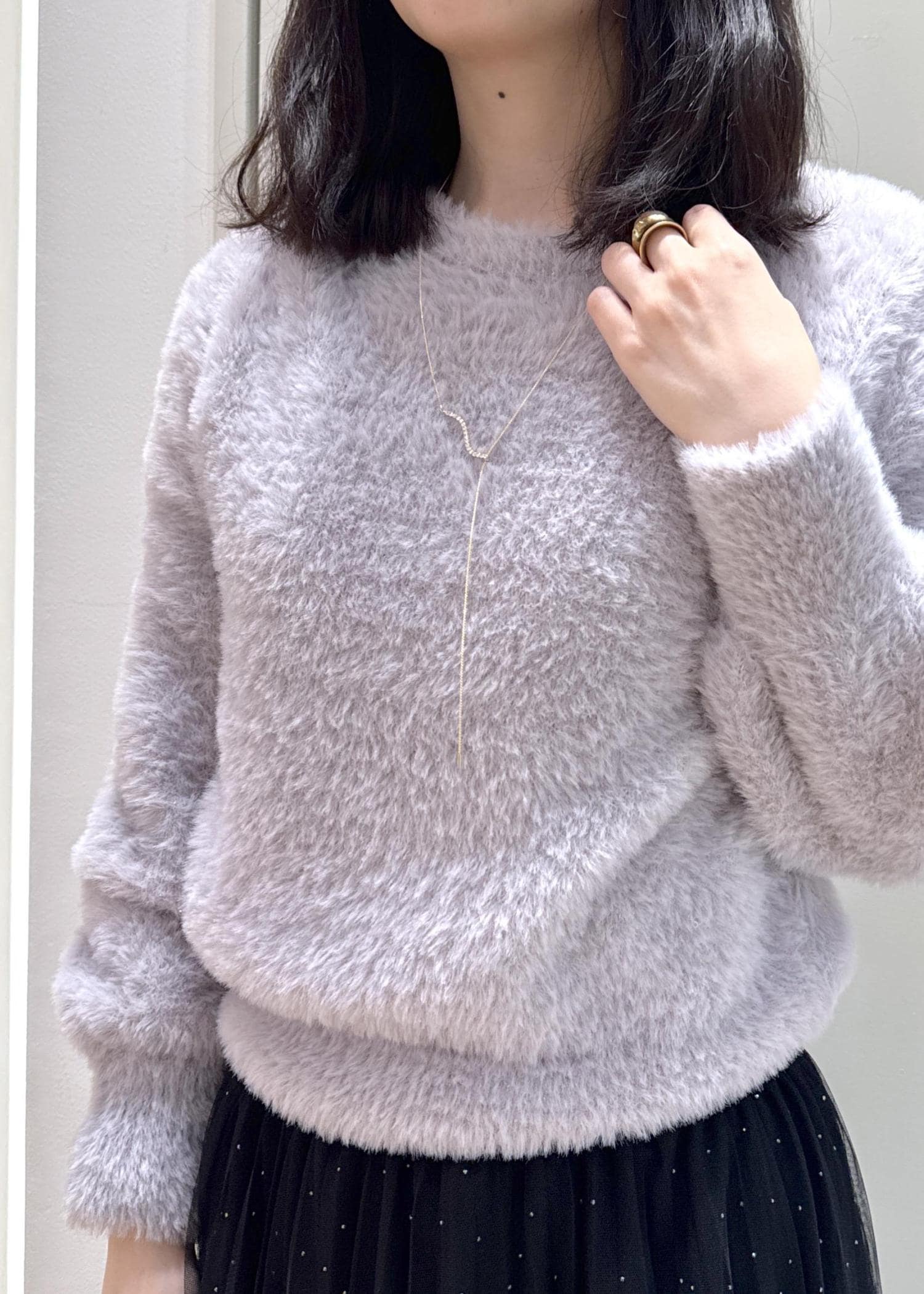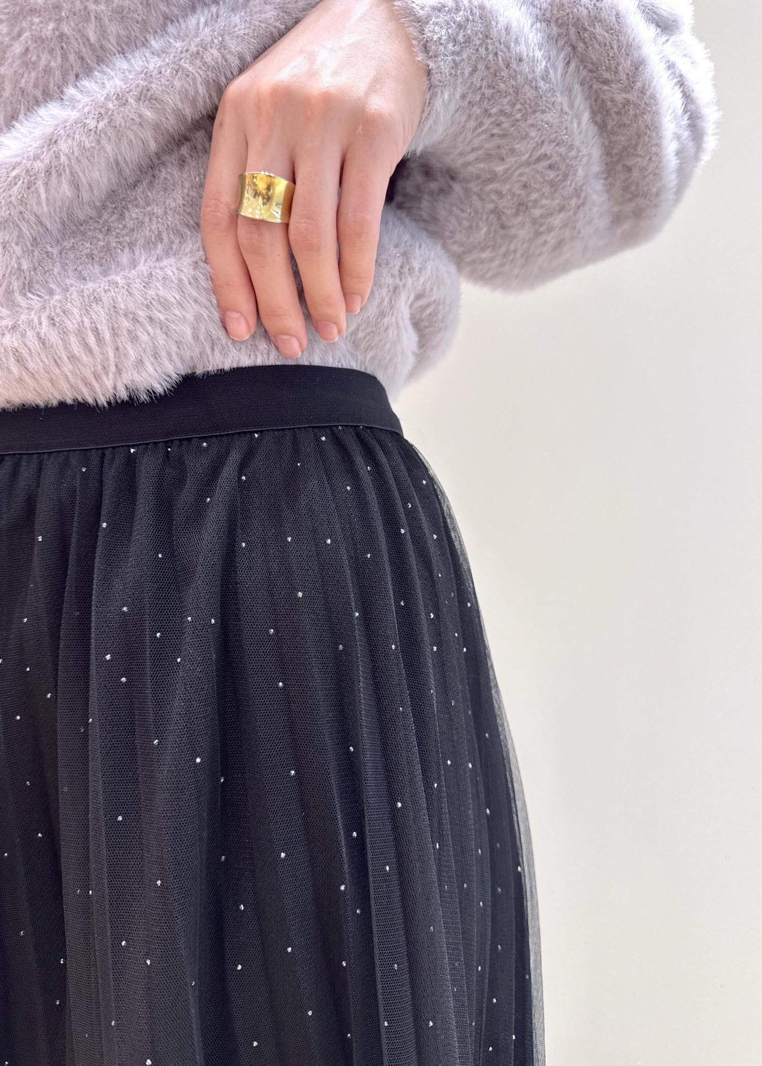 細かなラメがポイントのショートフェザーニットとキラキラがアクセントのチュールスカートを合わせたフェミニンコーデです。