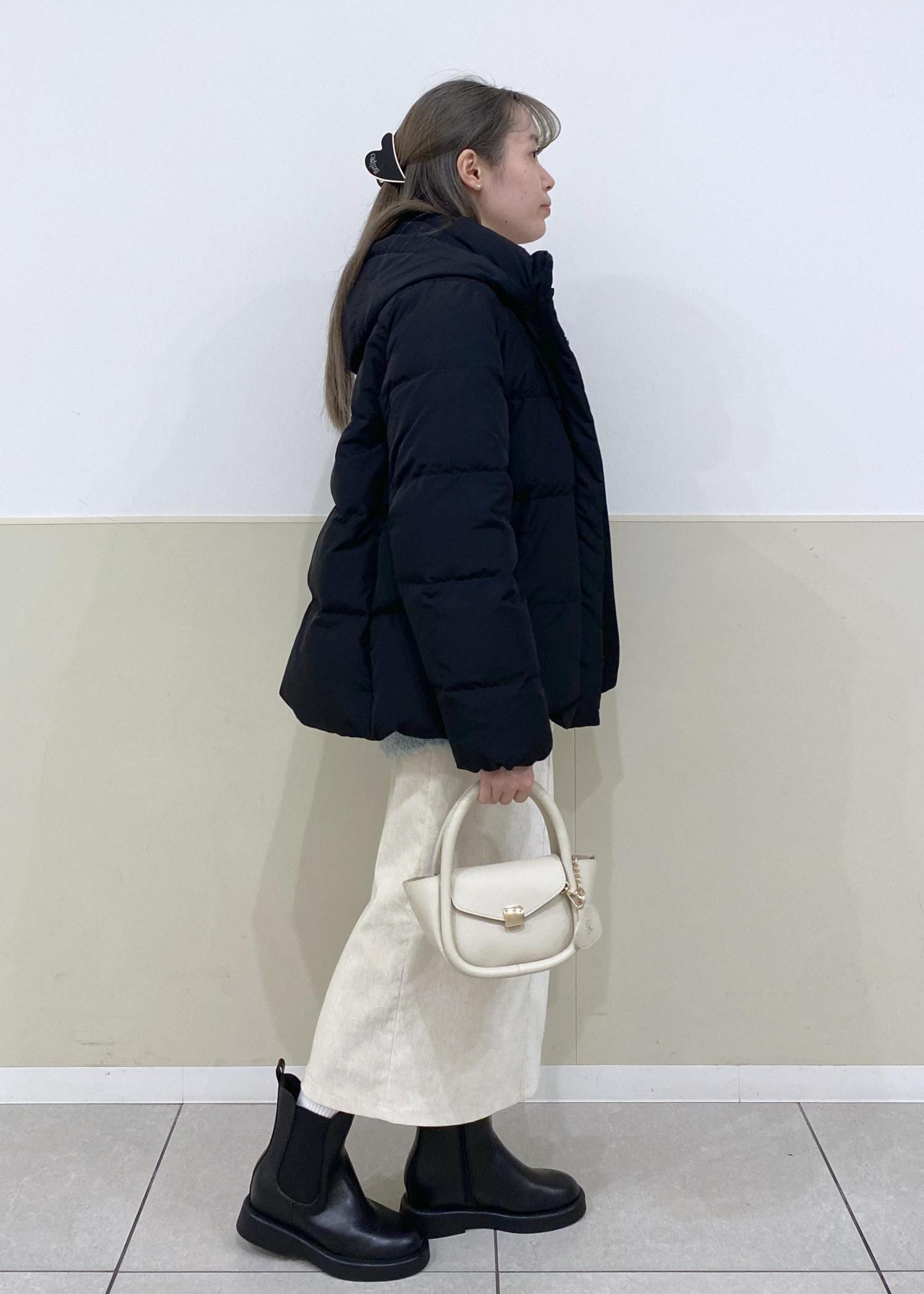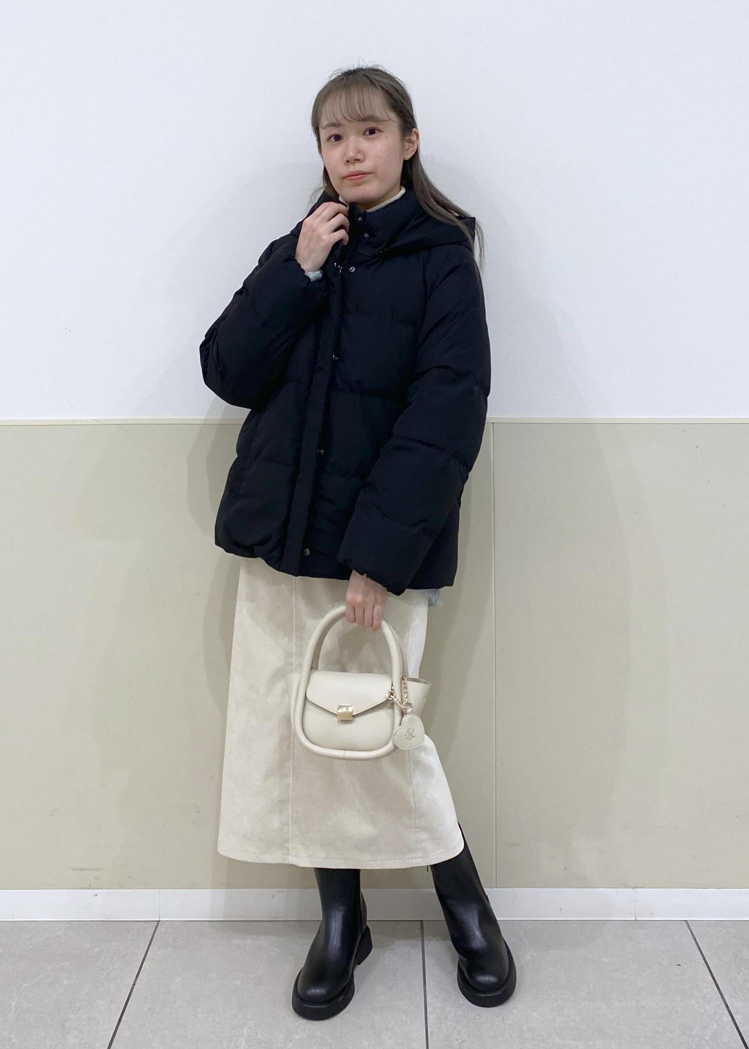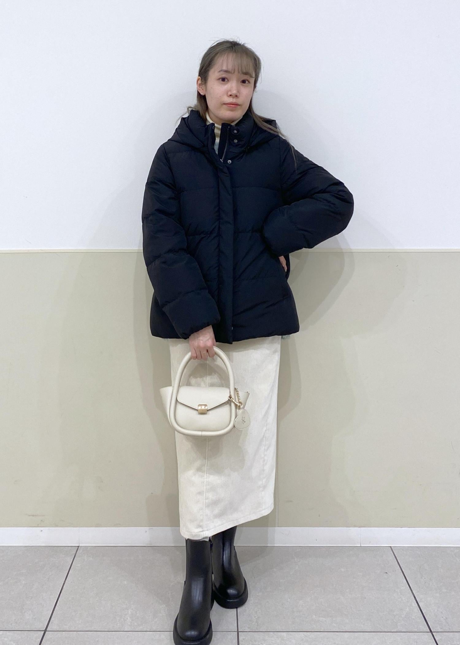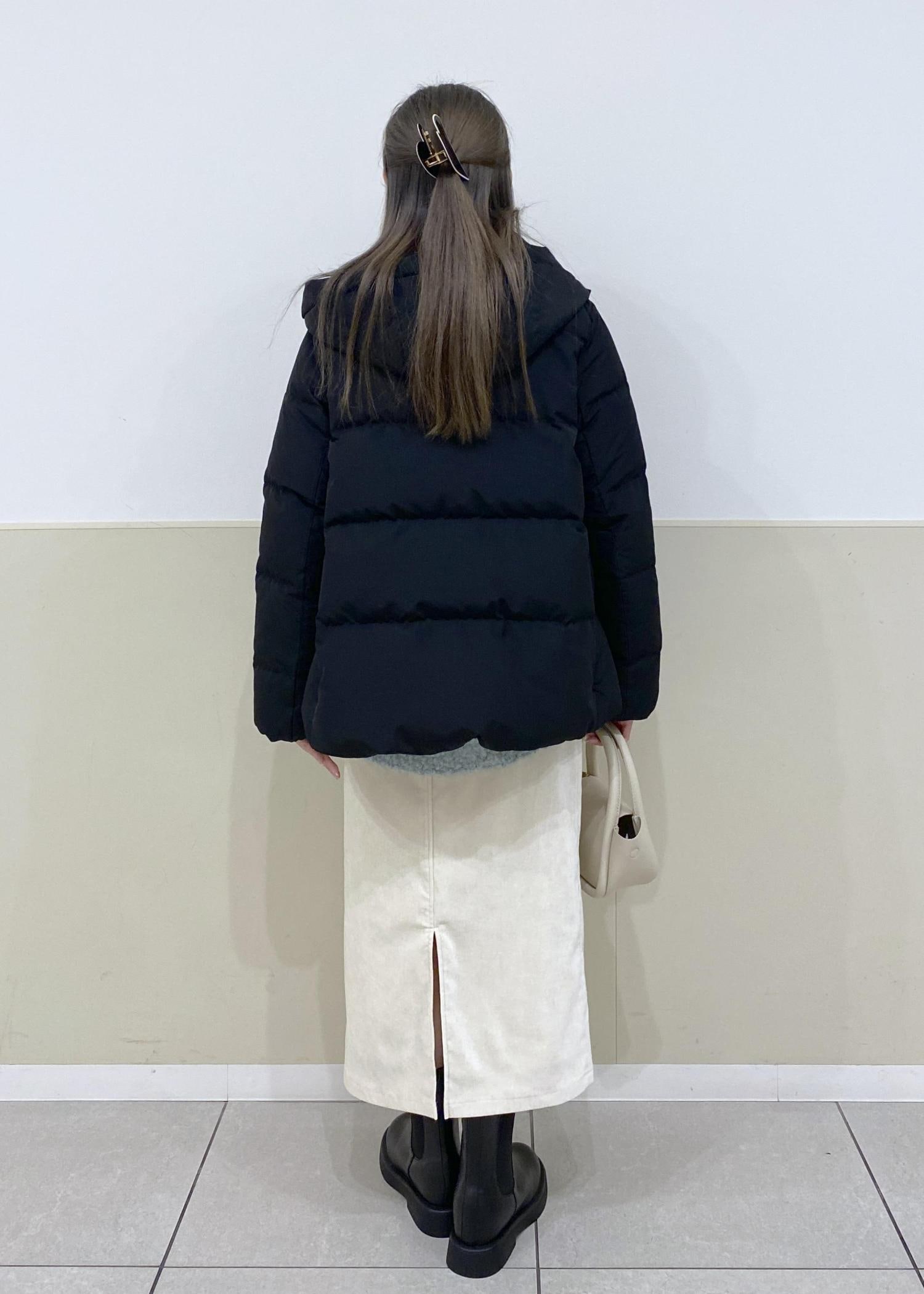 ボリュームの出るダウンコートには、Iラインスカートを合わせて全体のシルエットのバランスを取りました。