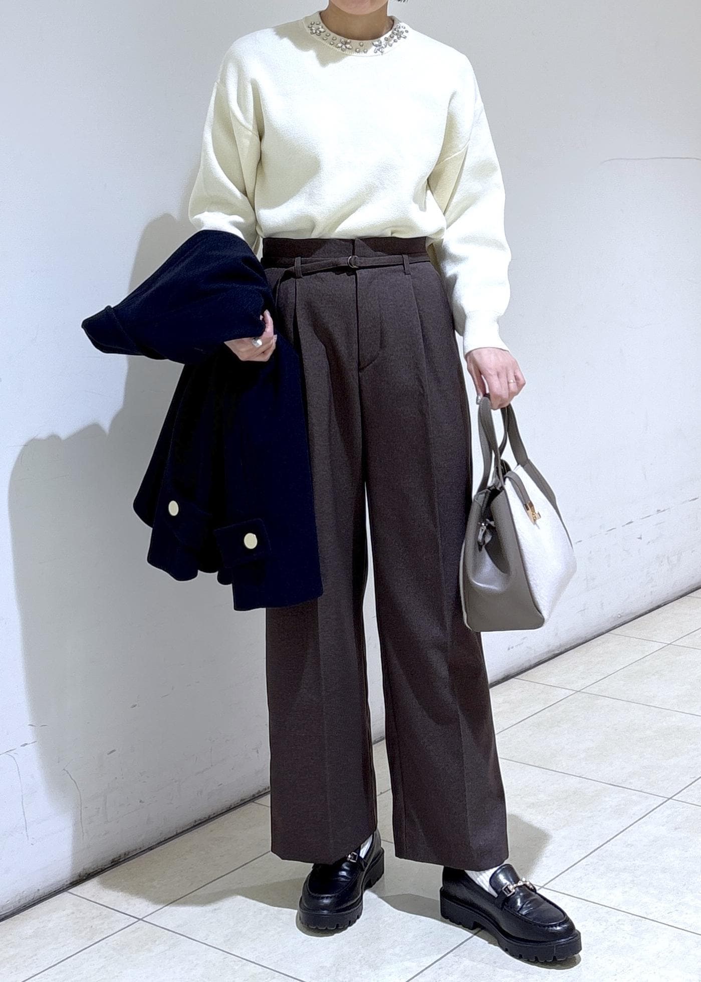 ワイドパンツを合わせたきれいめカジュアルコーデ。