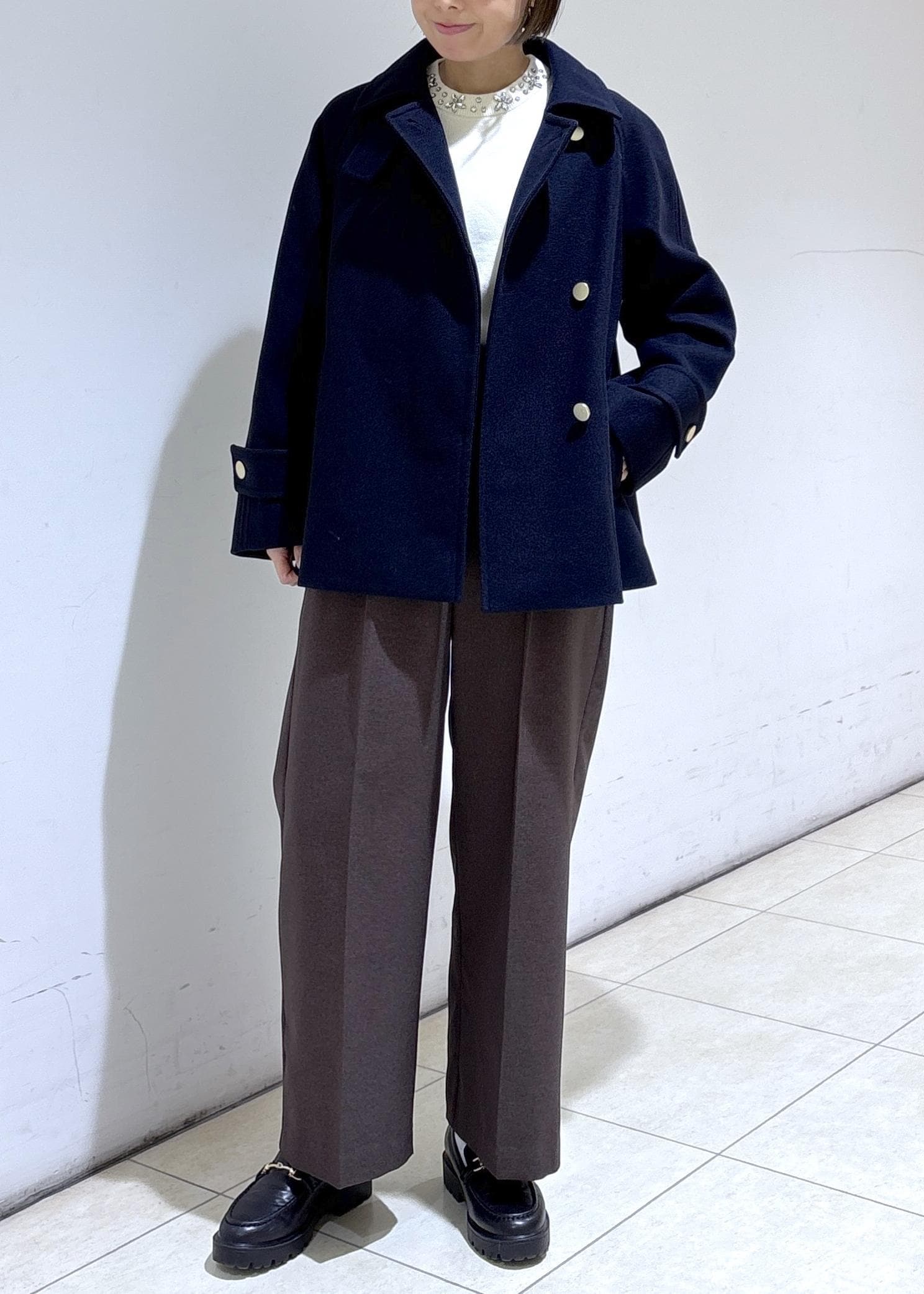 寒い日は首もとを、スタンドカラーとして着用するのもおすすめです◎ -
