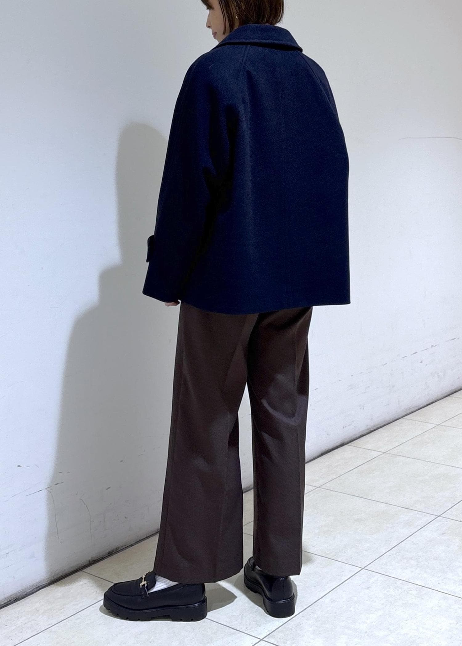肩まわりは程よくゆとりがあるので厚手のニットを重ねても窮屈感なく着用できます。