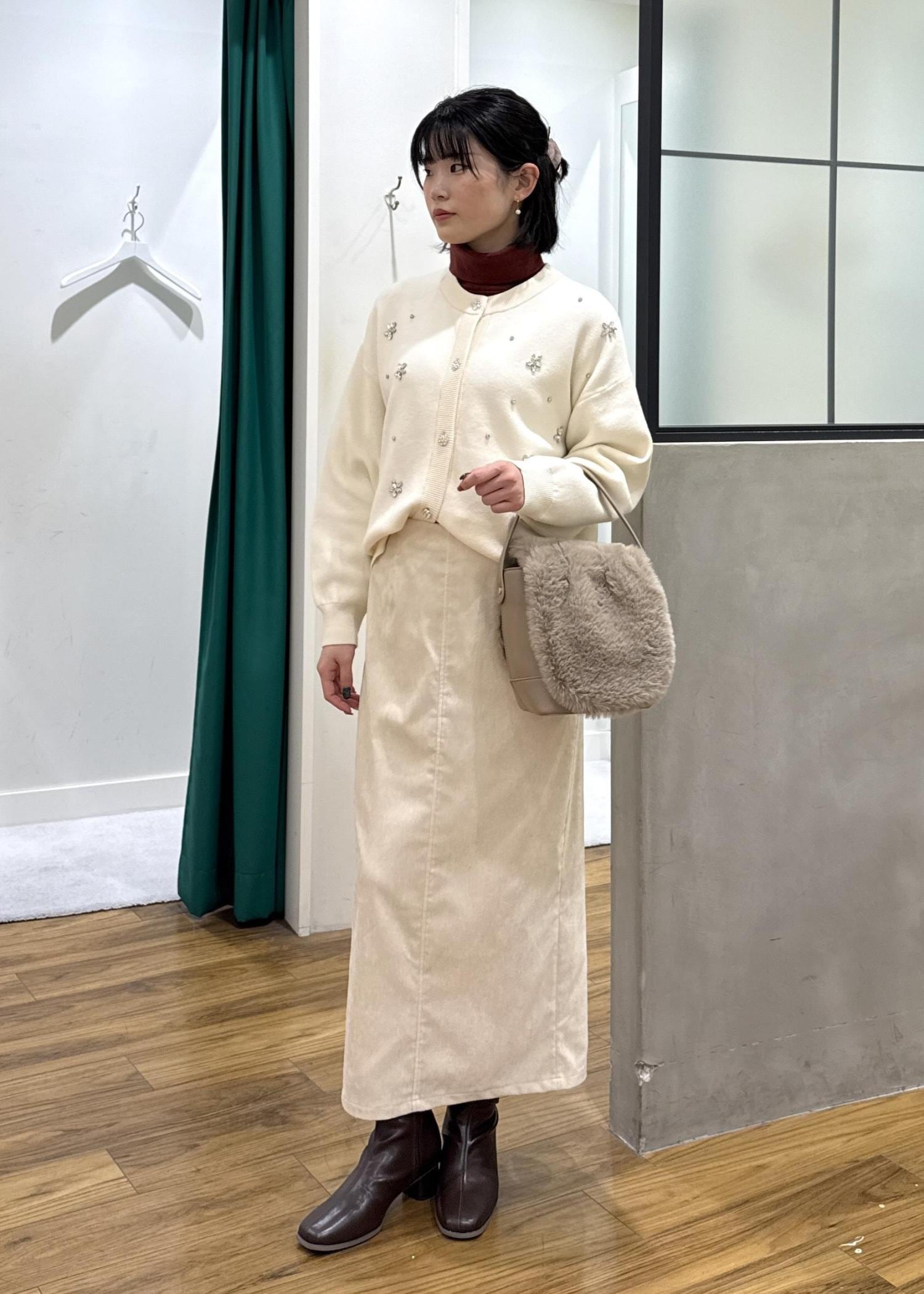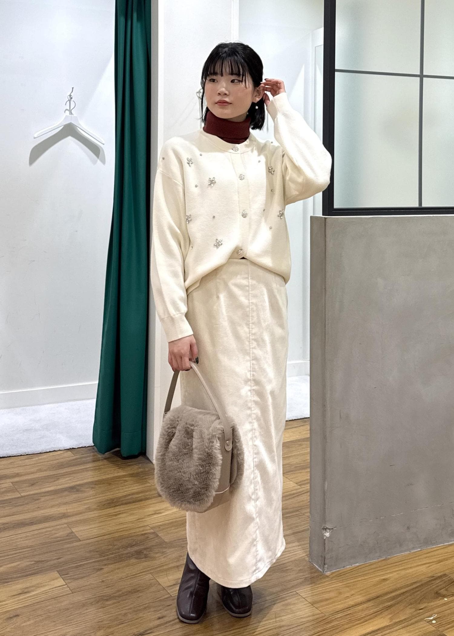 白を基調としたコーディネートの中に、トップスのキラキラとインナーで赤色を合わせ、シンプルですがクリスマス感を取り入れたコーディネートにしました!
