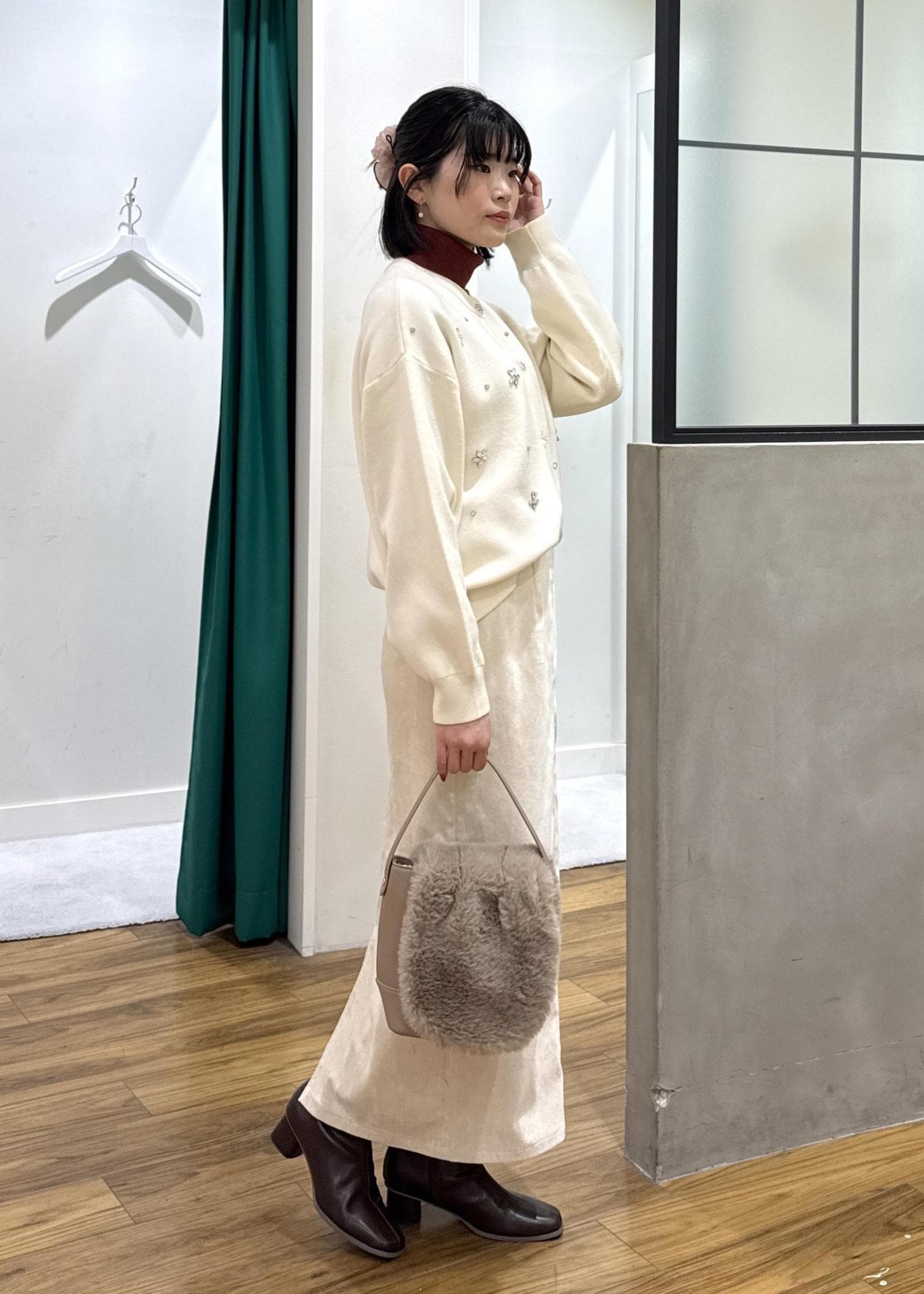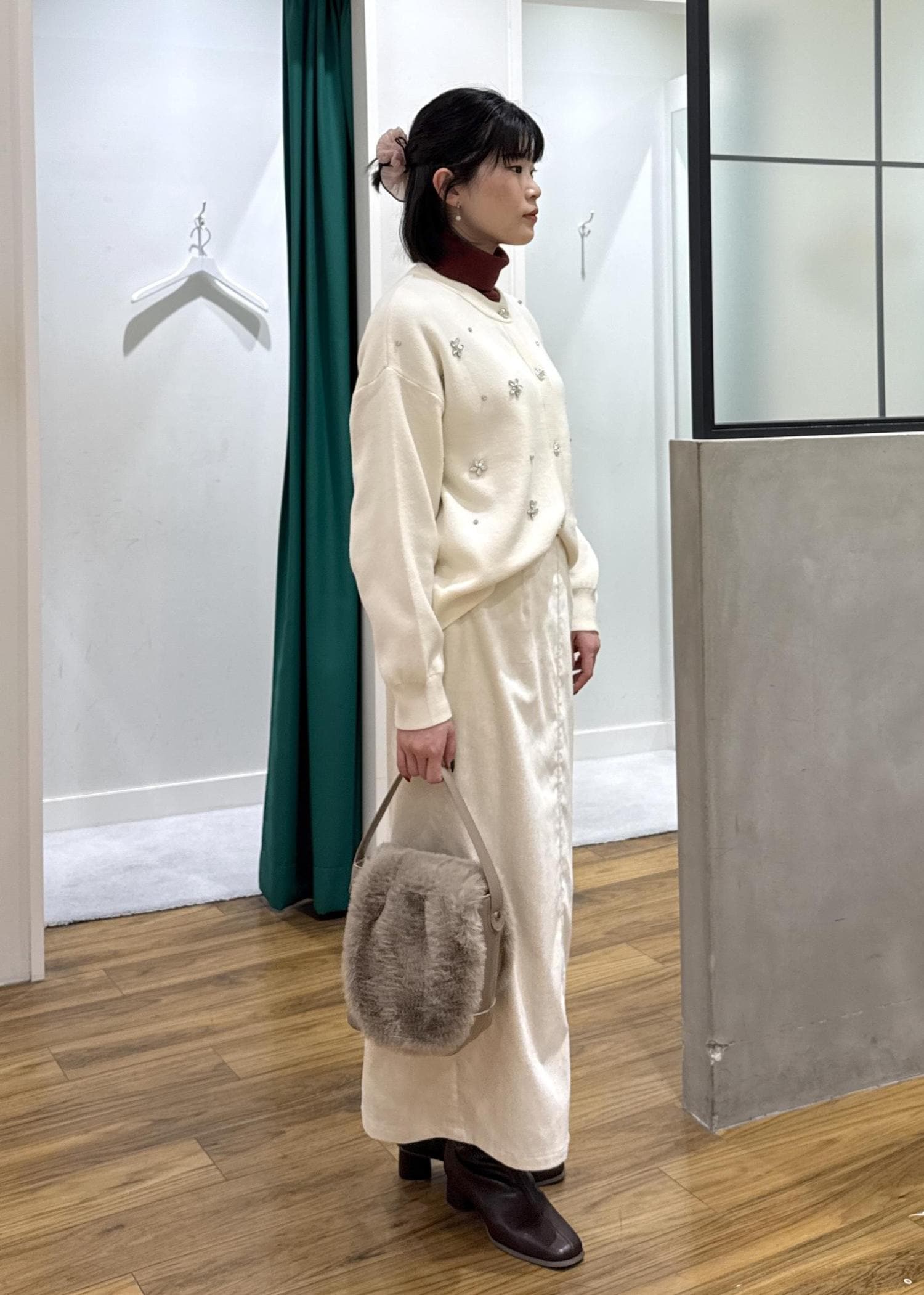 シンプルな形ですが、ビジューがあることで華やかな印象になり暗めになりがちな冬服を明るくしてくれます。 -