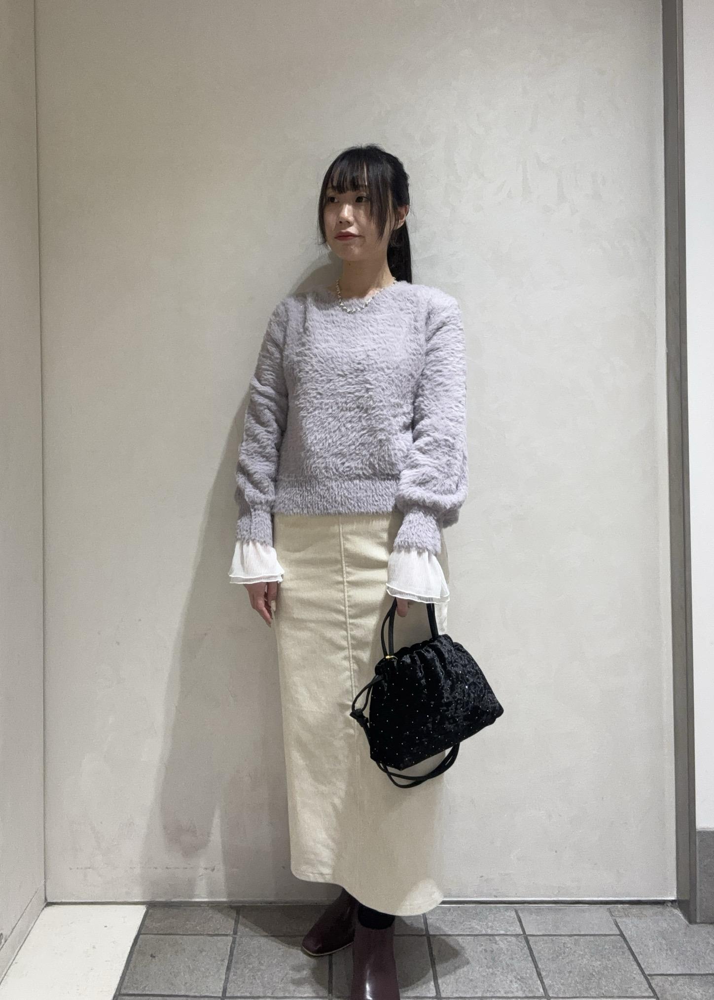 ふわふわのフェザーショートニットとシェニール織のスカートは素材感が柔らかく華やかな印象になります!