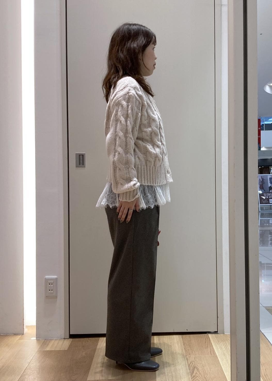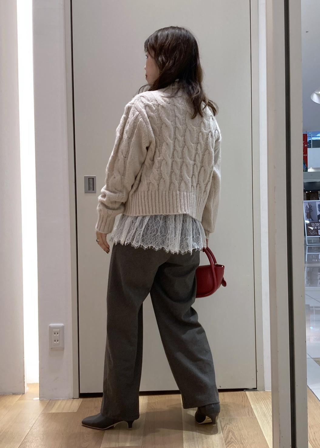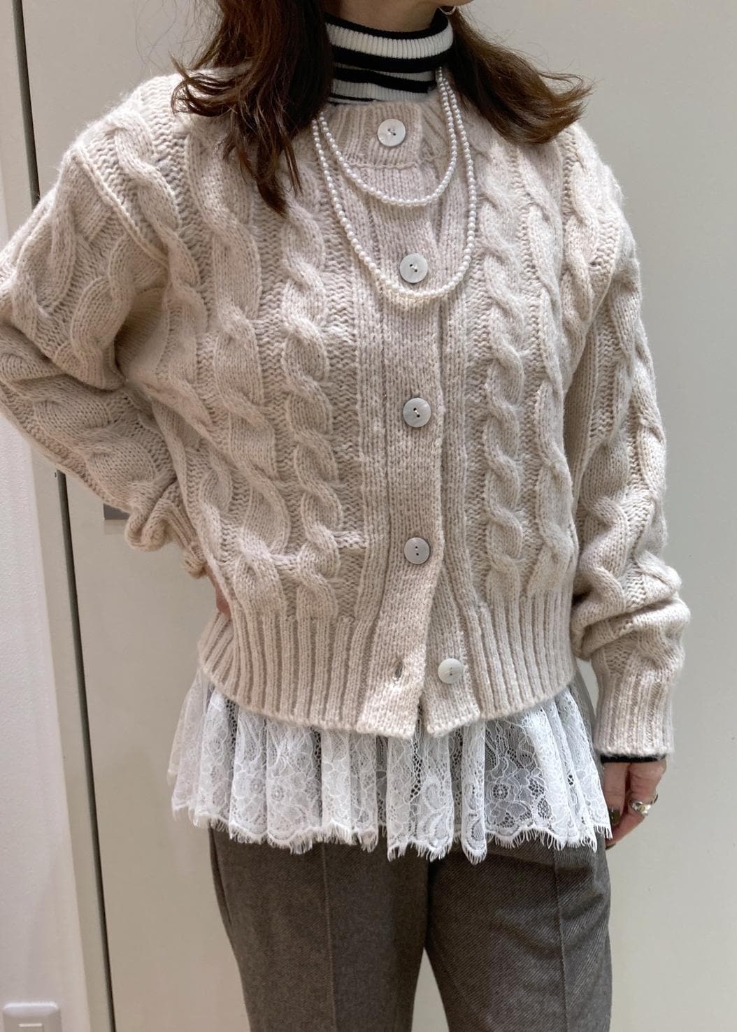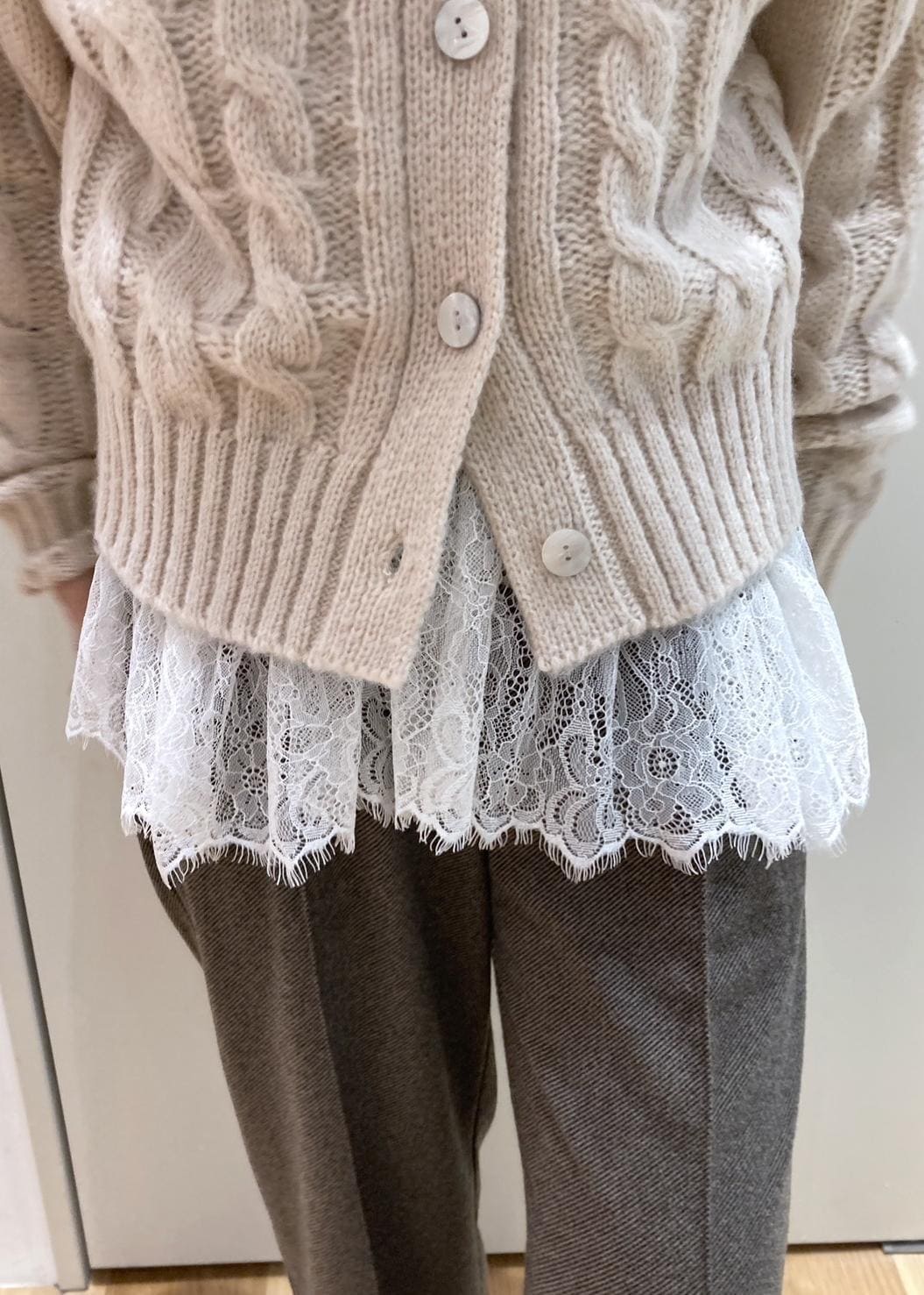 ケーブルカーディガンにボーダーのタートル、レースキャミを重ねたレイヤードスタイルに。