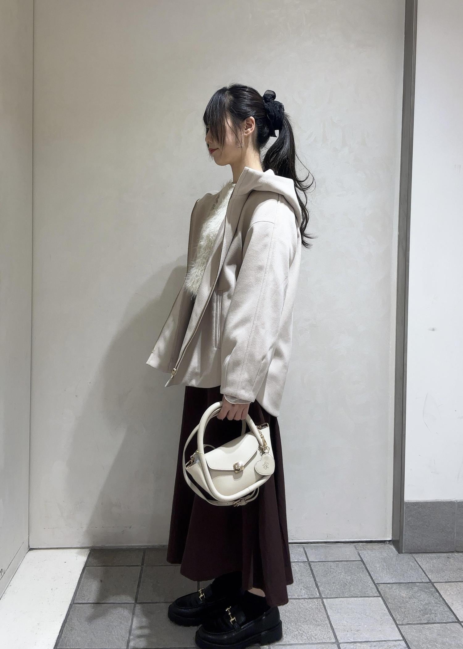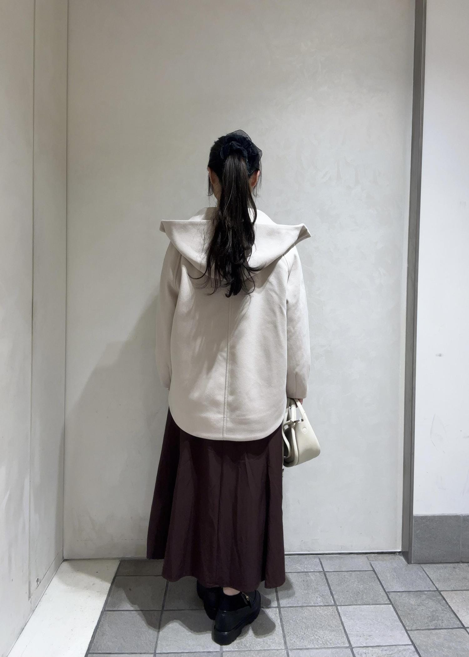 人気のフーデットコートをロングスカートと合わせてきれいめカジュアルなスタイリングです!