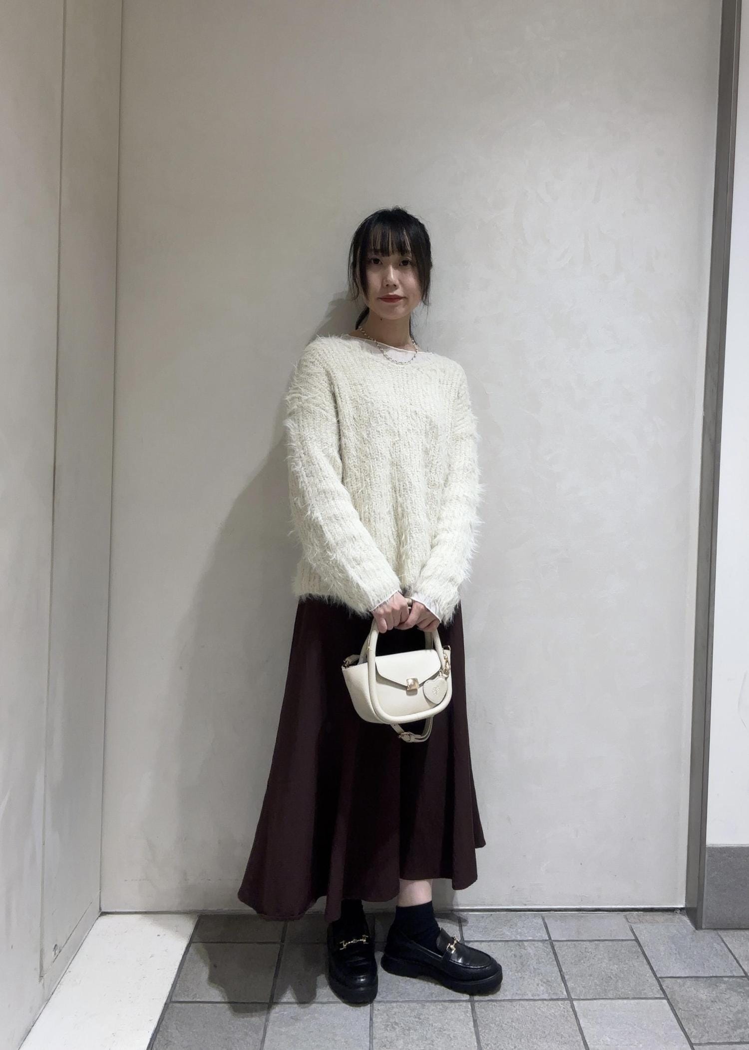 ふわふわで毛足の長いフェザートップスで寒い冬も暖かく過ごせます!ロングスカートはボルドーを選び、ホリデー感をプラスしました◎