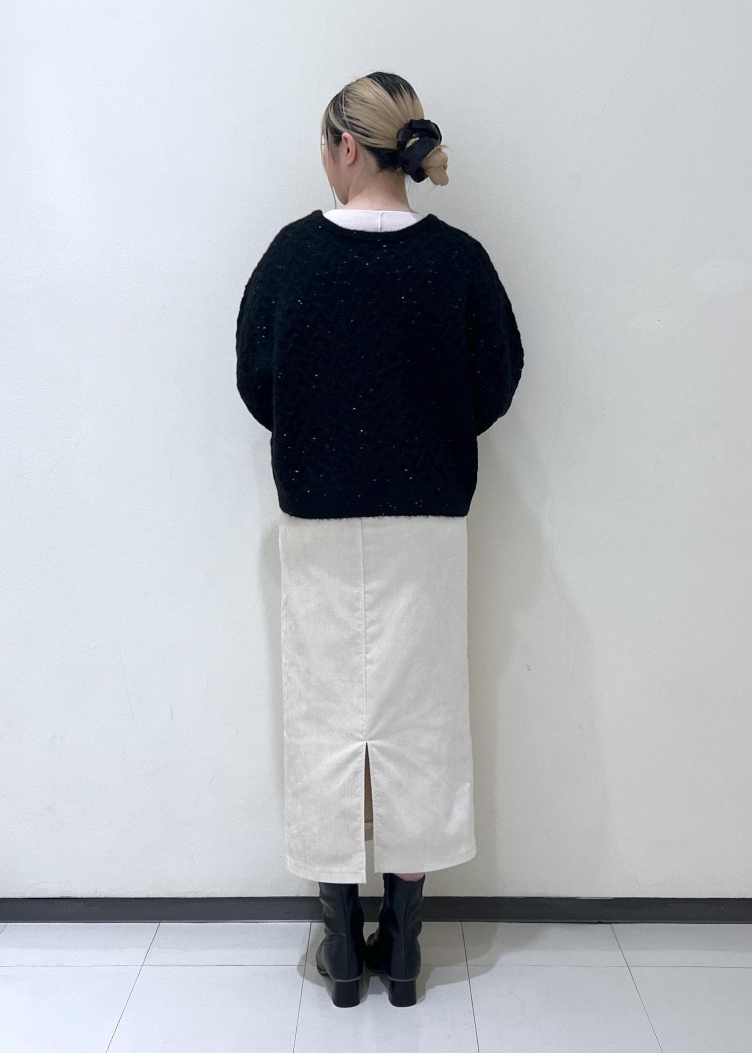 オーバーシルエットなので下はアイラインスカートでスッキリさせるとバランスが良くなります。
