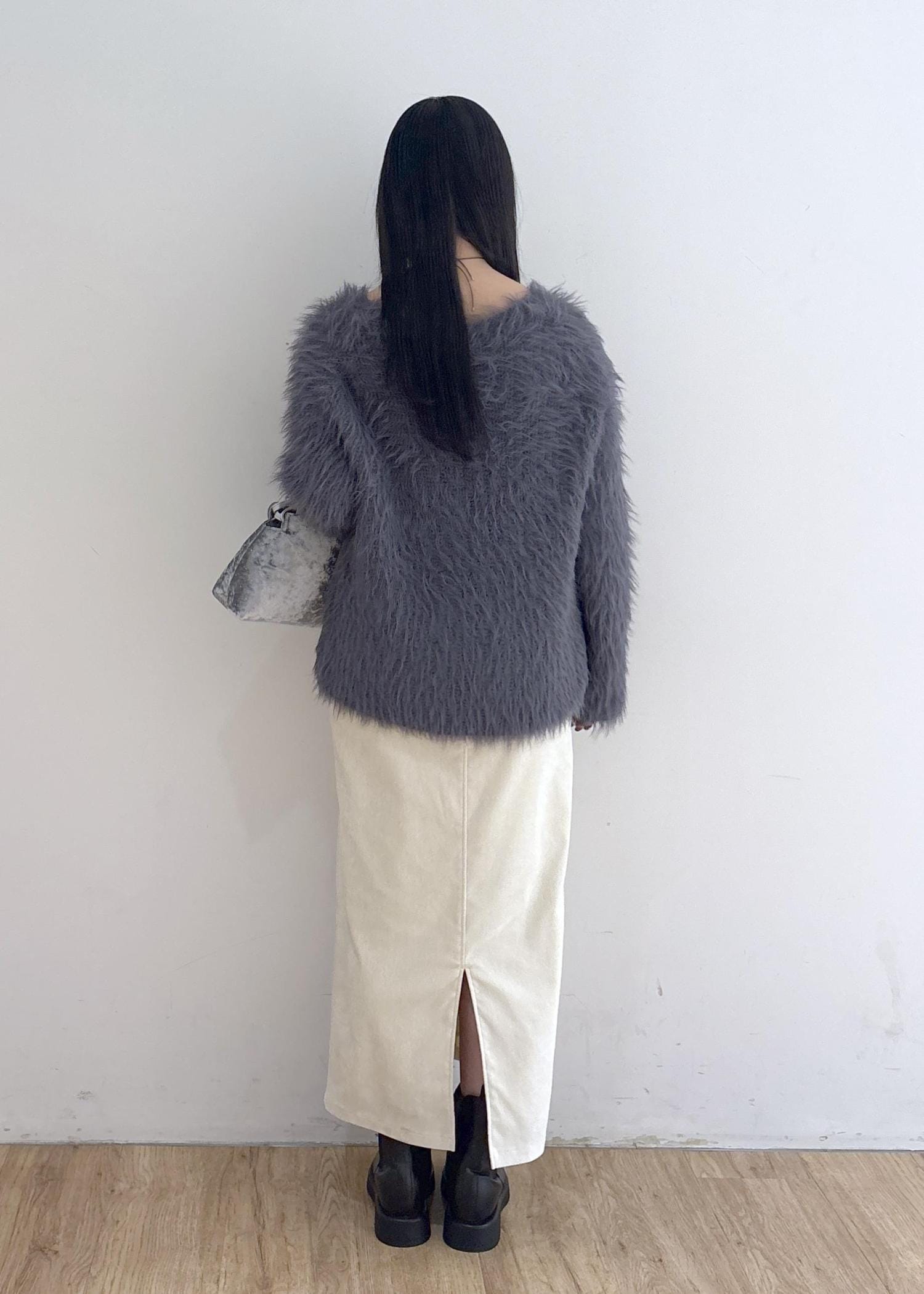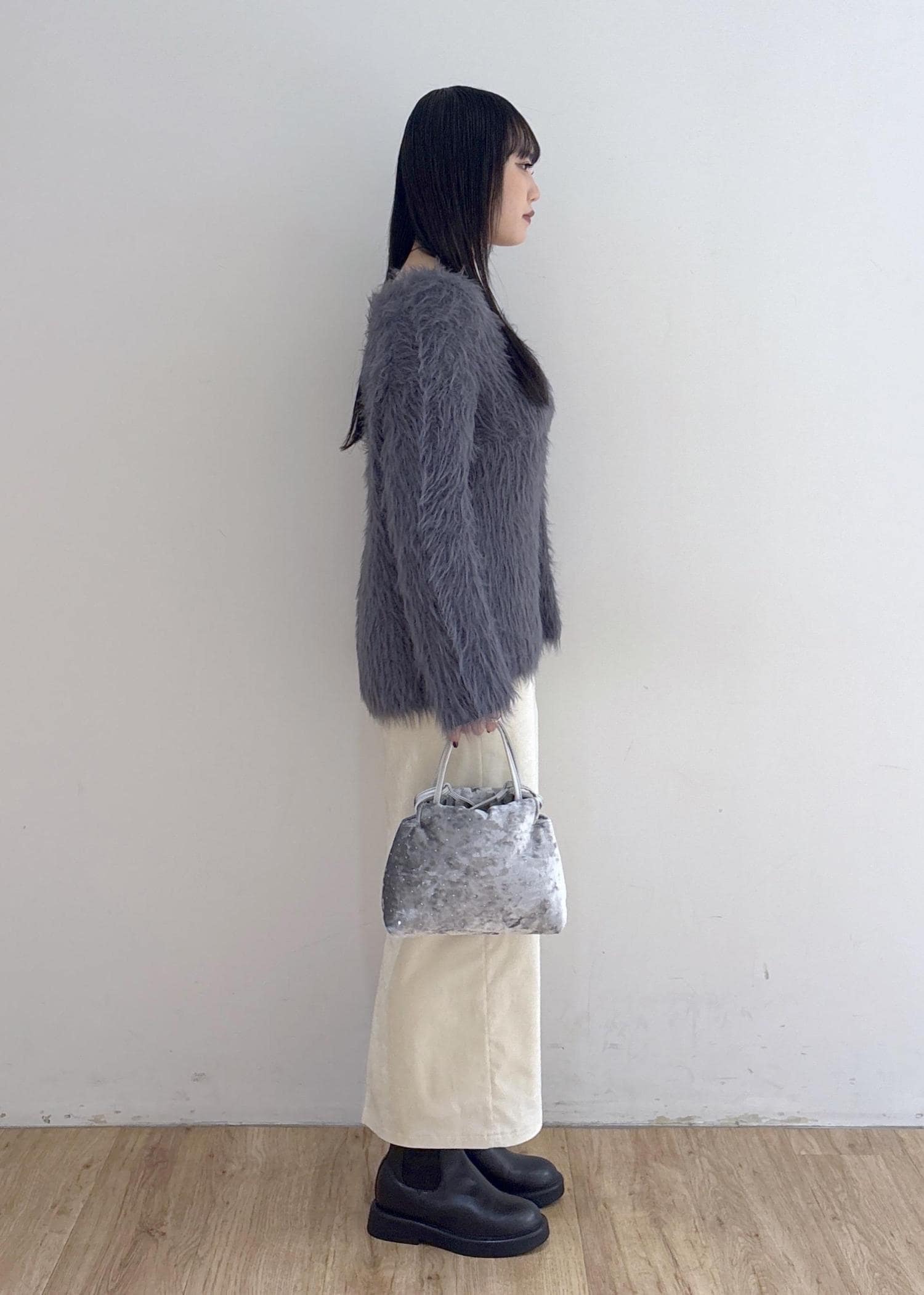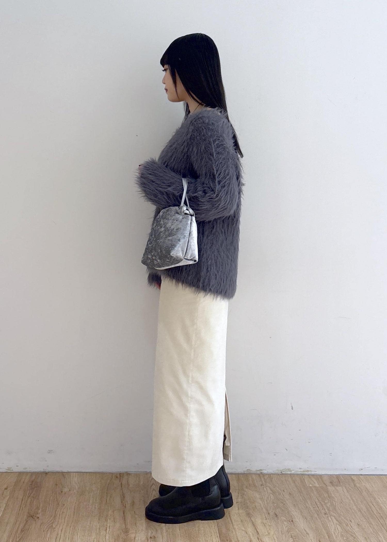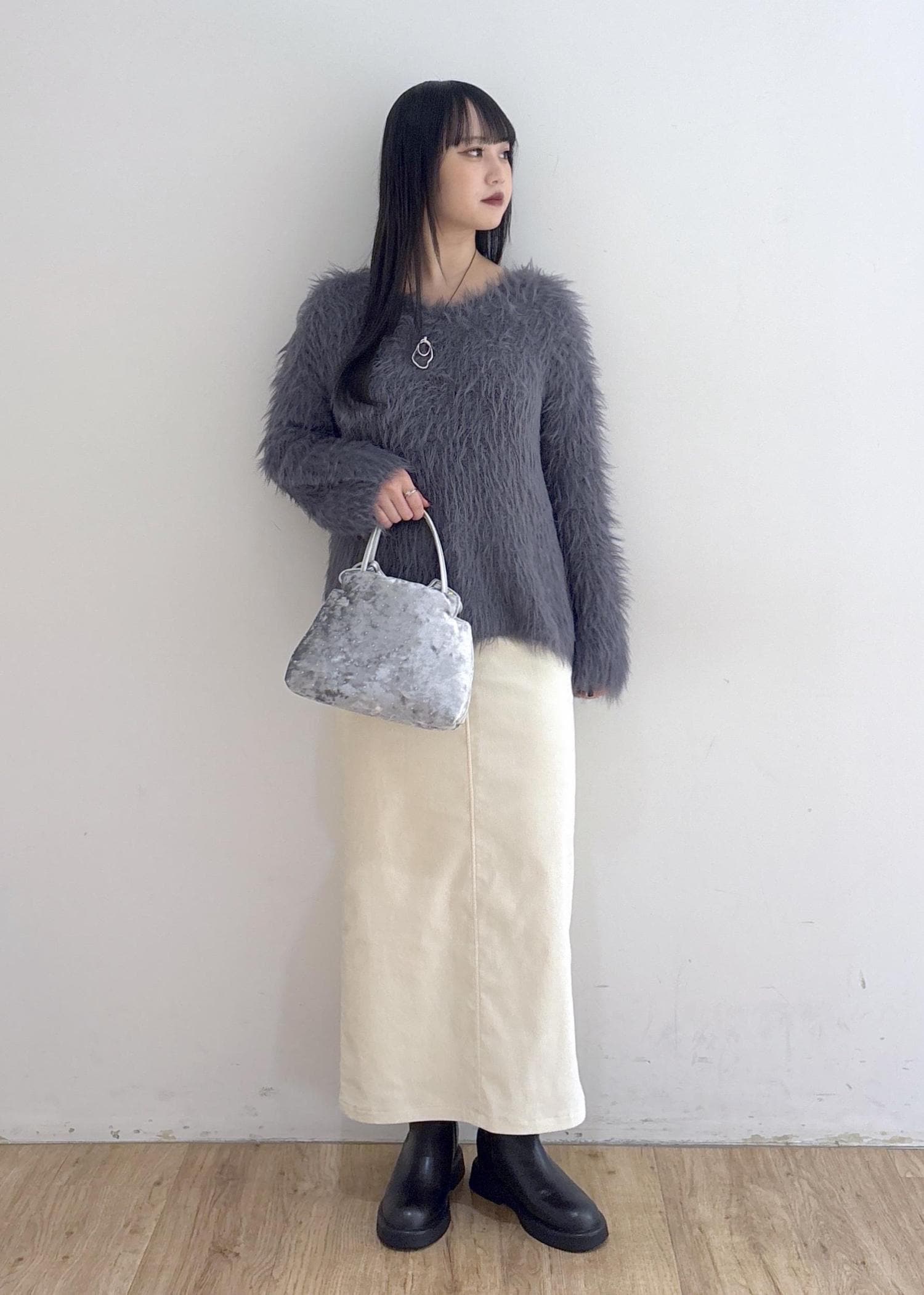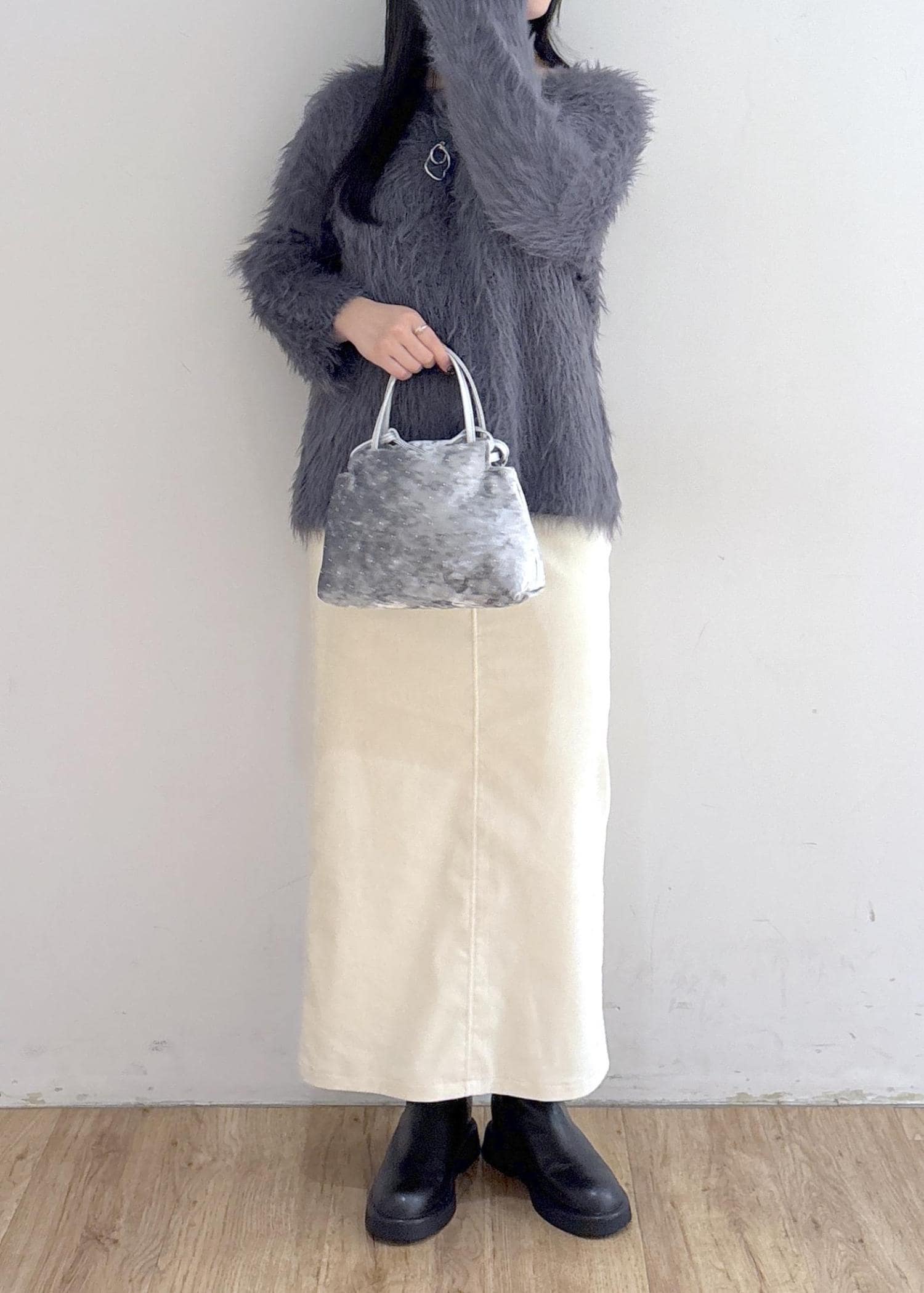 シャギーのニットとベロアのスカートで大人っぽく可愛いスタイリング。 おでかけ、デート、女子会など幅広い場面で活躍するアイテム◎