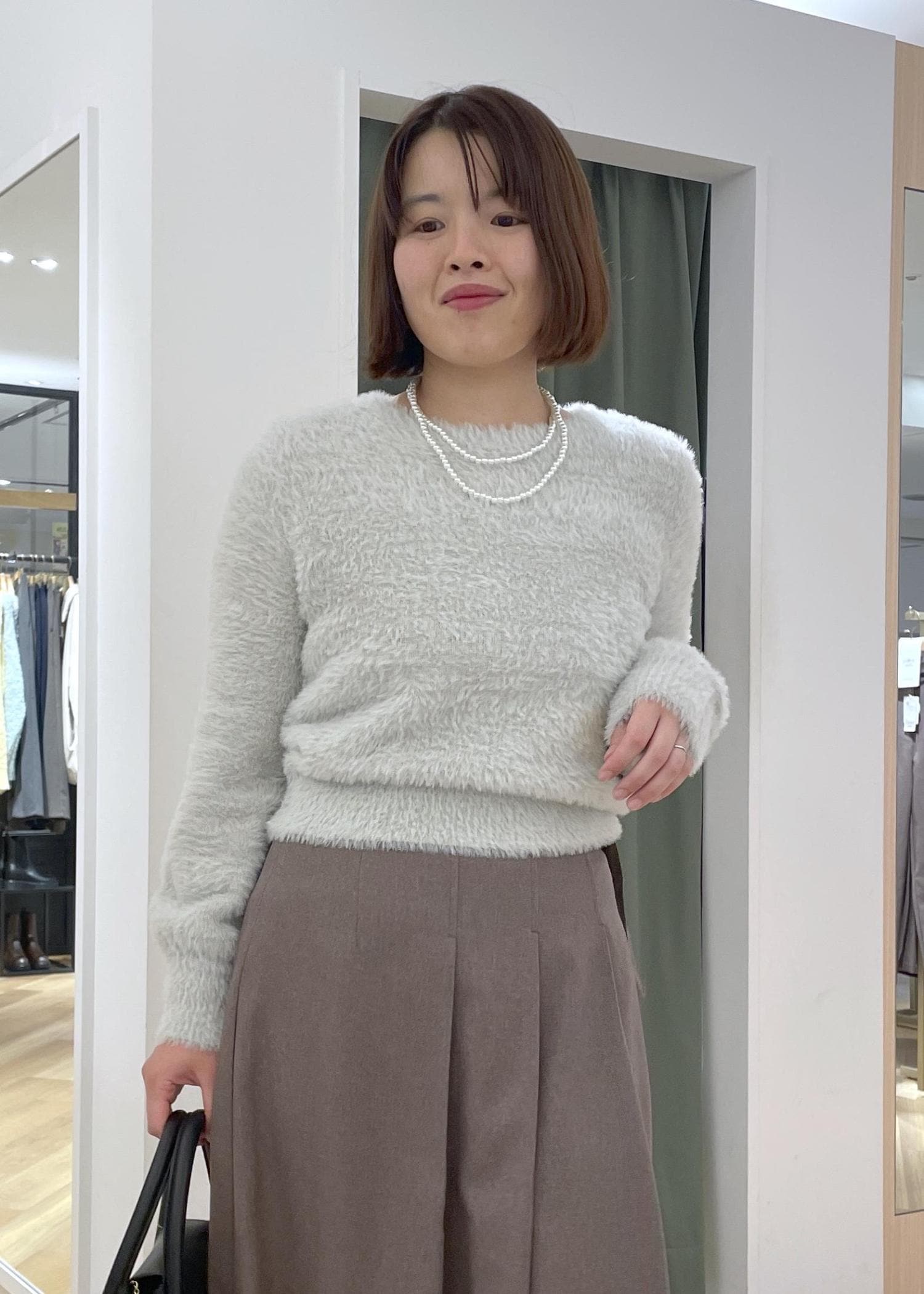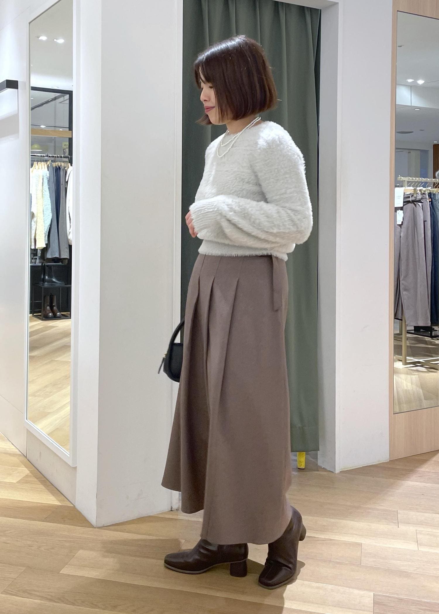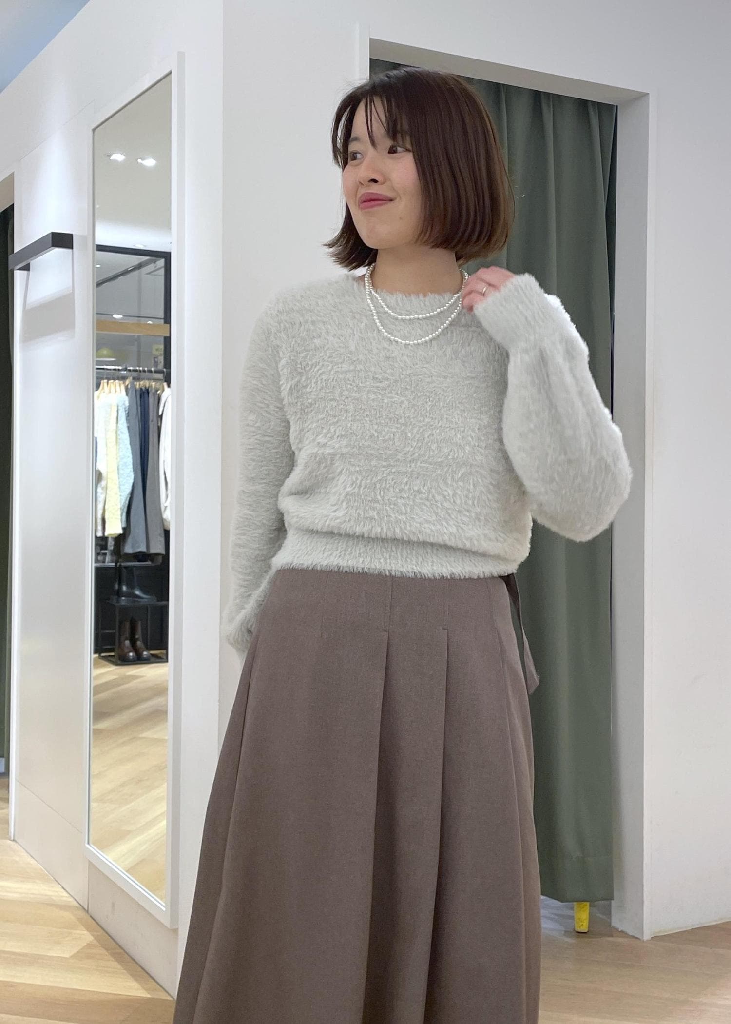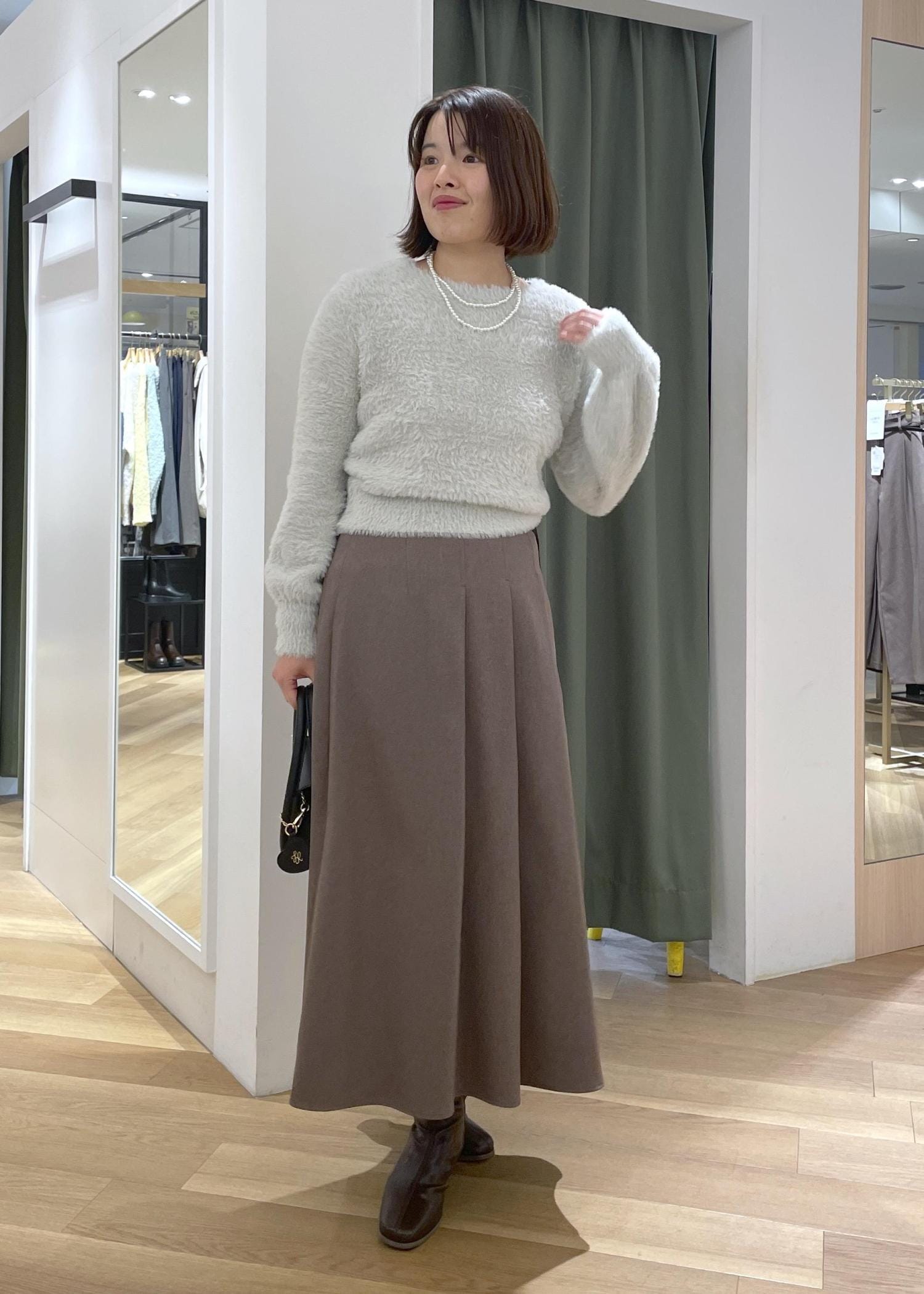 ふんわりとしたフェザーニットにロングスカートを合わせた、品良く決まるキレイめコーデです!