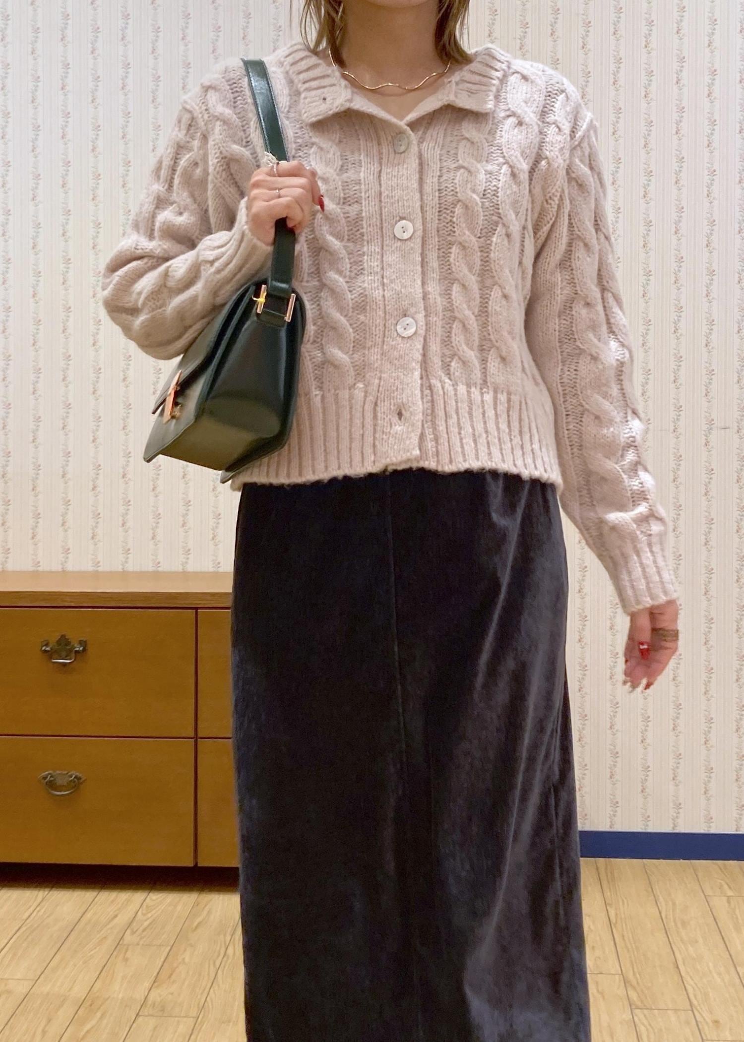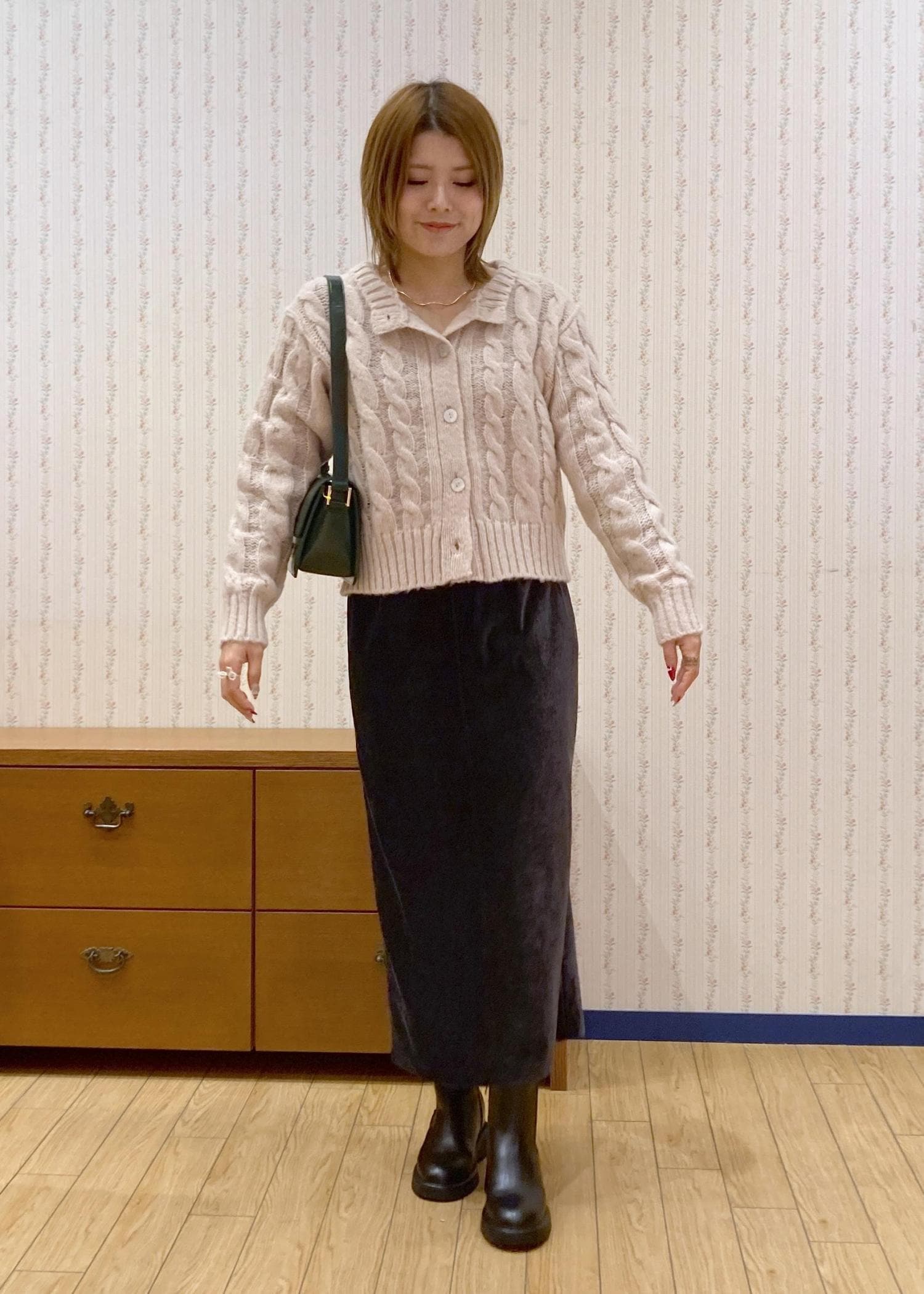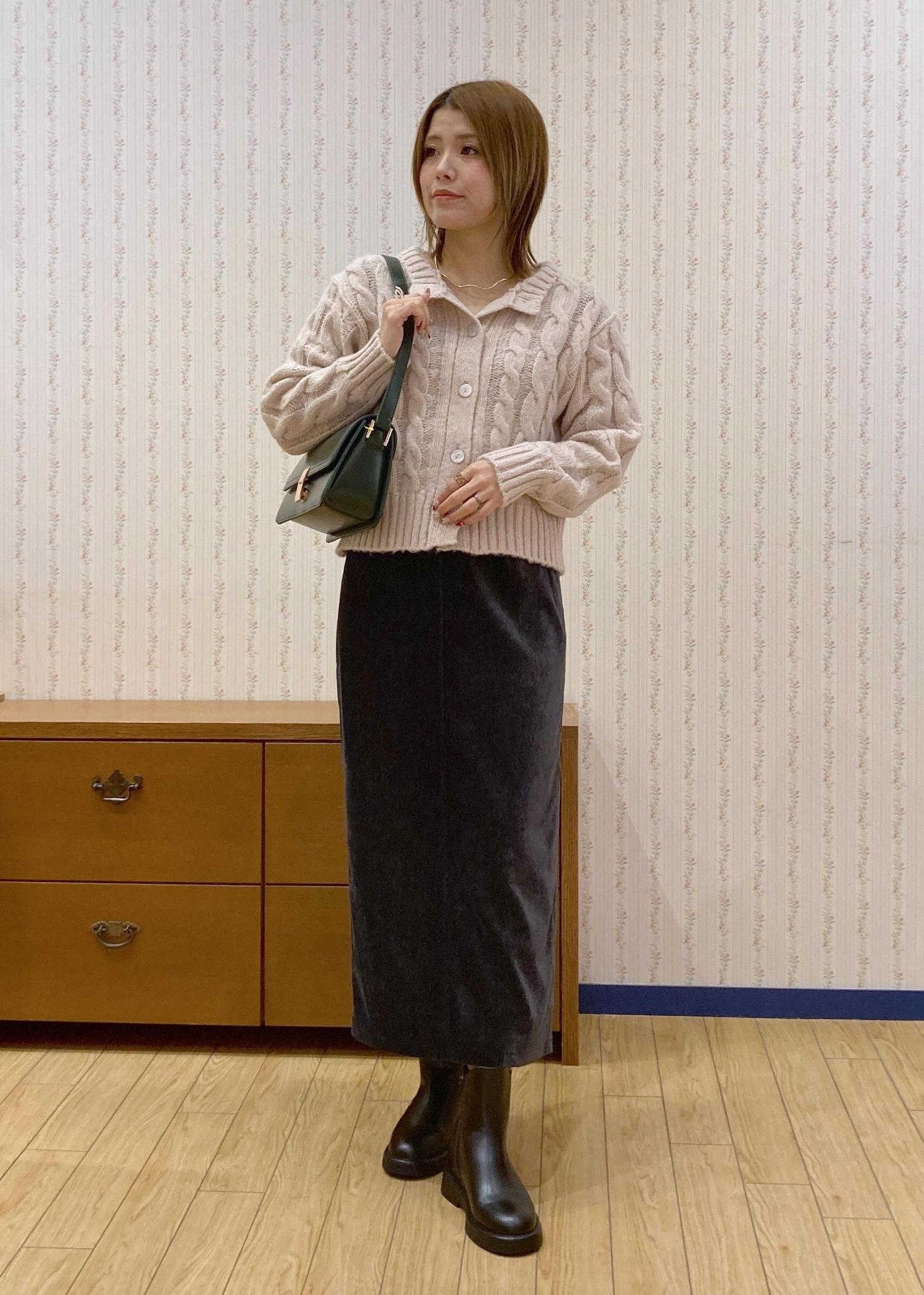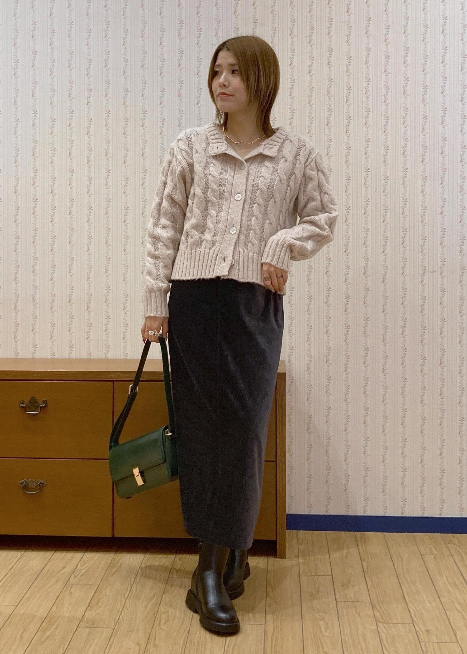 コンパクトな着丈のニットカーディガンにアイラインのスカートをあわせたタイトなシルエットのコーディネートです。